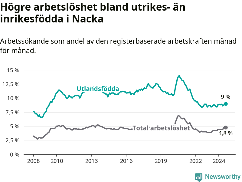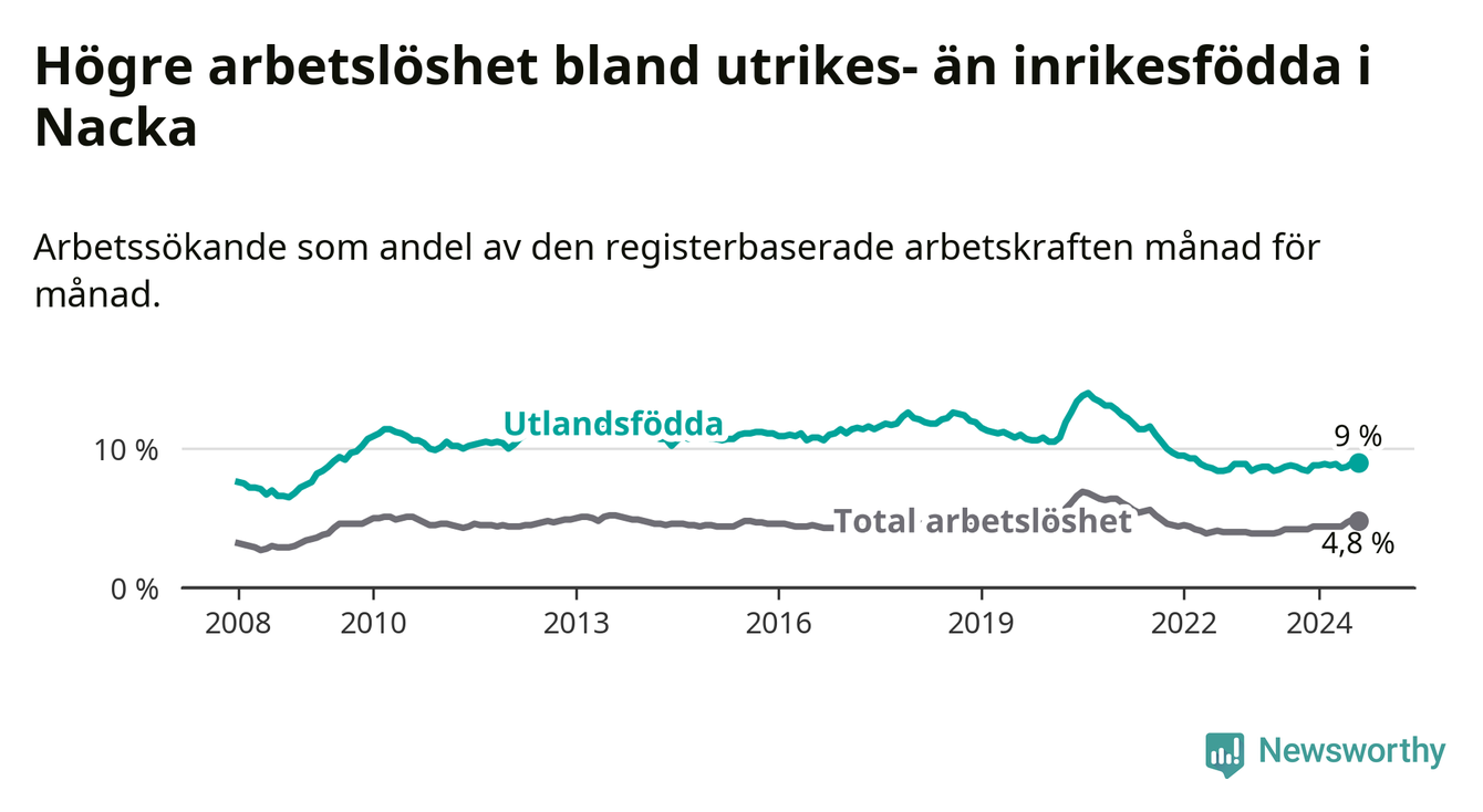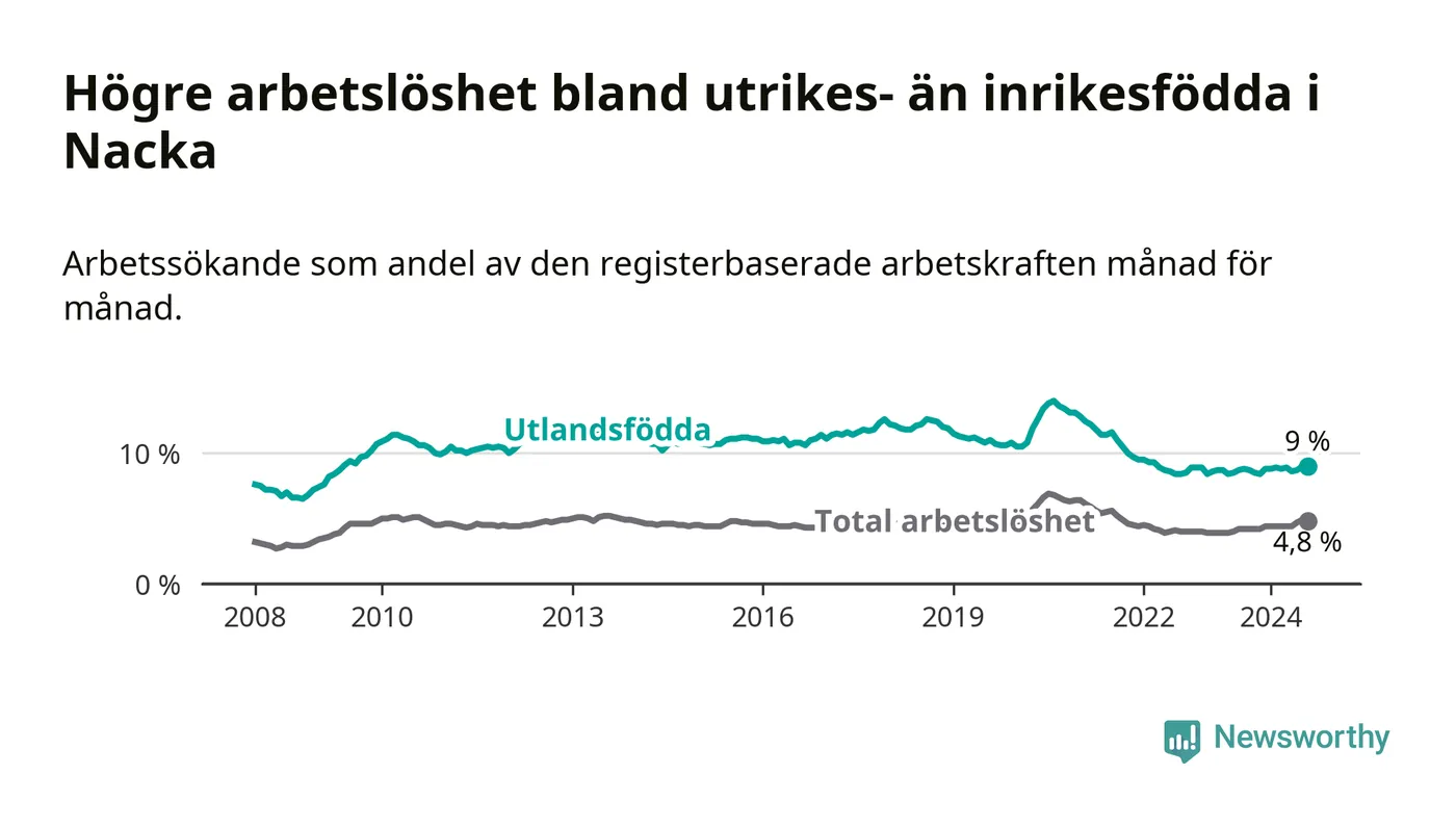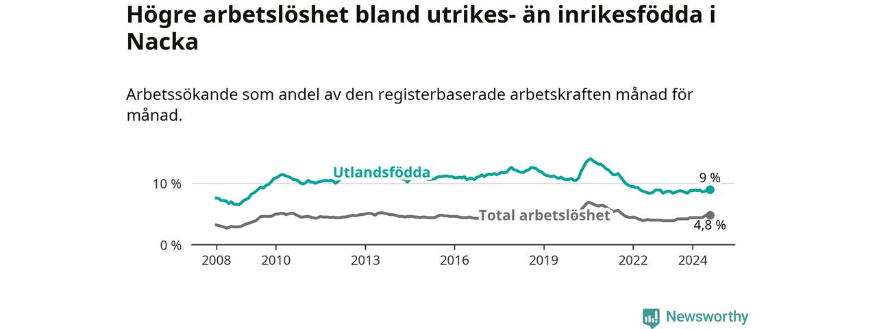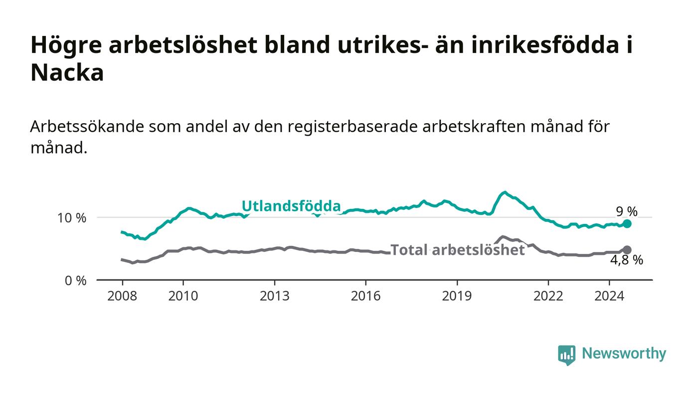 Arbetslösheten bland utlandsfödda var 9,0 procent i Nacka under augusti månad, motsvarande 1 192 av 13 244 personer. Det är 0,2 procentenheter fler än vid samma tidpunkt i fjol (+42 om man räknar personer). Därmed är de utlandsföddas arbetslöshet högre än vid samma tidpunkt i fjol för åttonde månaden i följd.