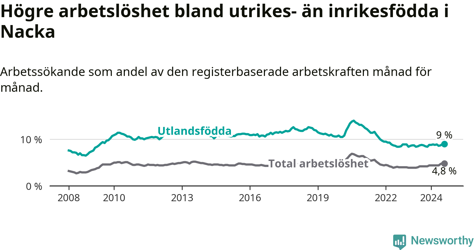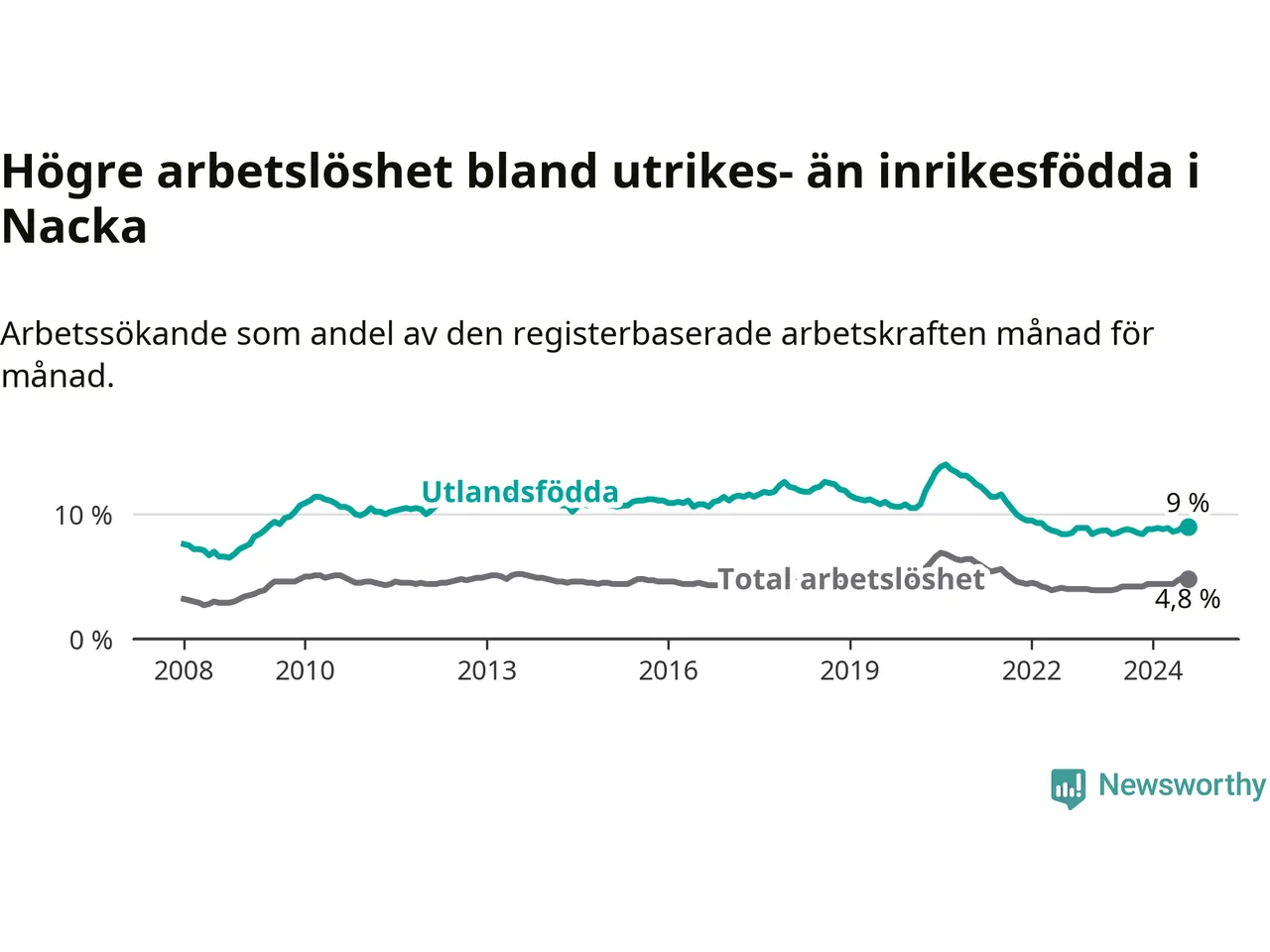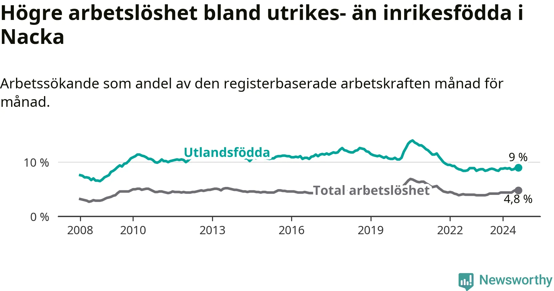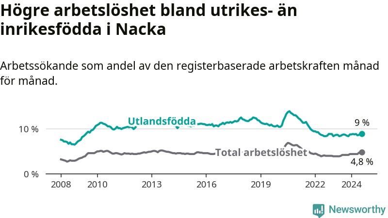 Arbetslösheten bland utlandsfödda var 9,0 procent i Nacka under augusti månad, motsvarande 1 192 av 13 244 personer. Det är 0,2 procentenheter fler än vid samma tidpunkt i fjol (+42 om man räknar personer). Därmed är de utlandsföddas arbetslöshet högre än vid samma tidpunkt i fjol för åttonde månaden i följd.