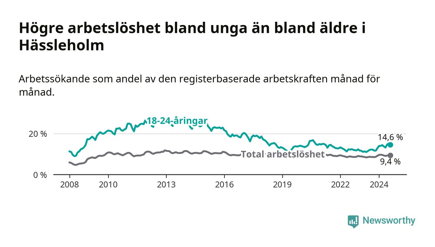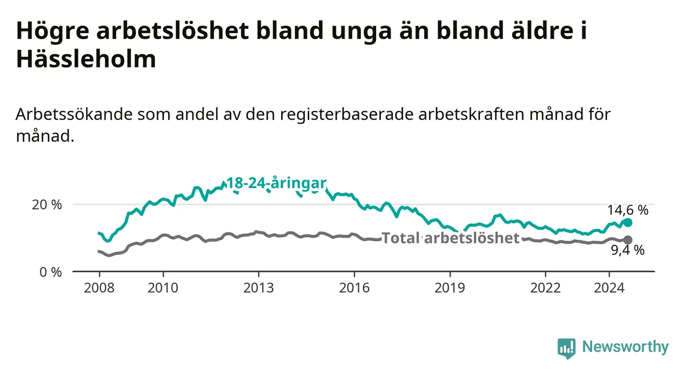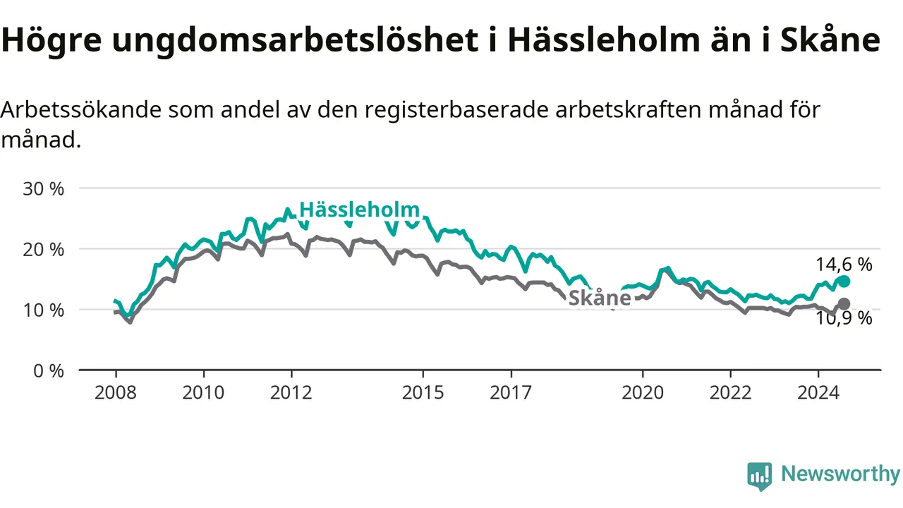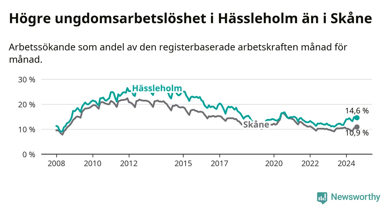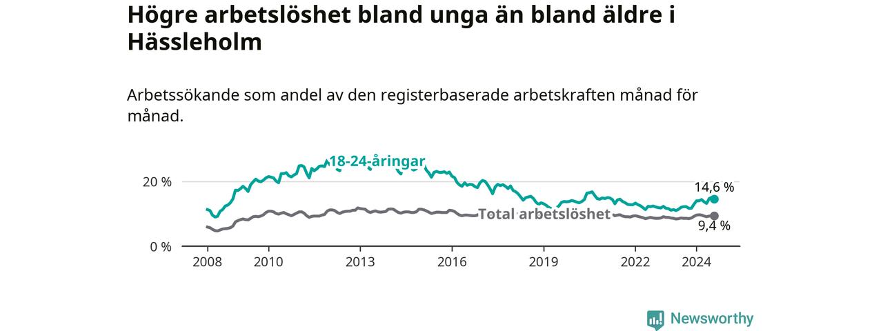 I och med den senaste månadens uppgång har de ungas arbetslöshet i Hässleholm stigit nio månader i följd (upp från 11,7 procent i november 2023 till 14,6 procent nu).