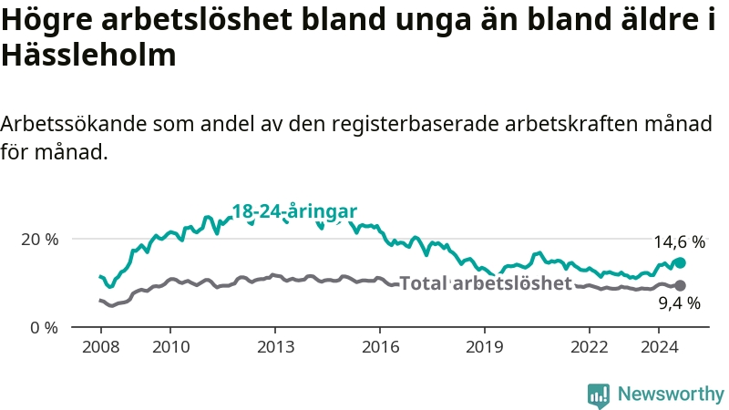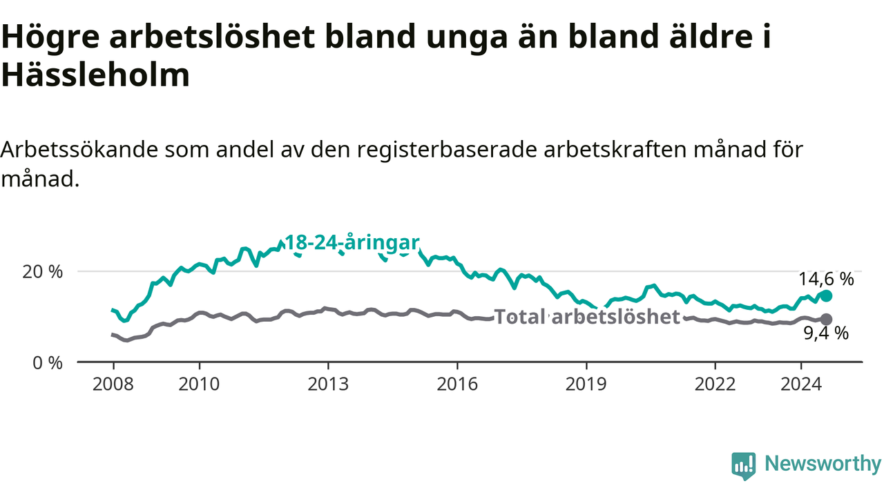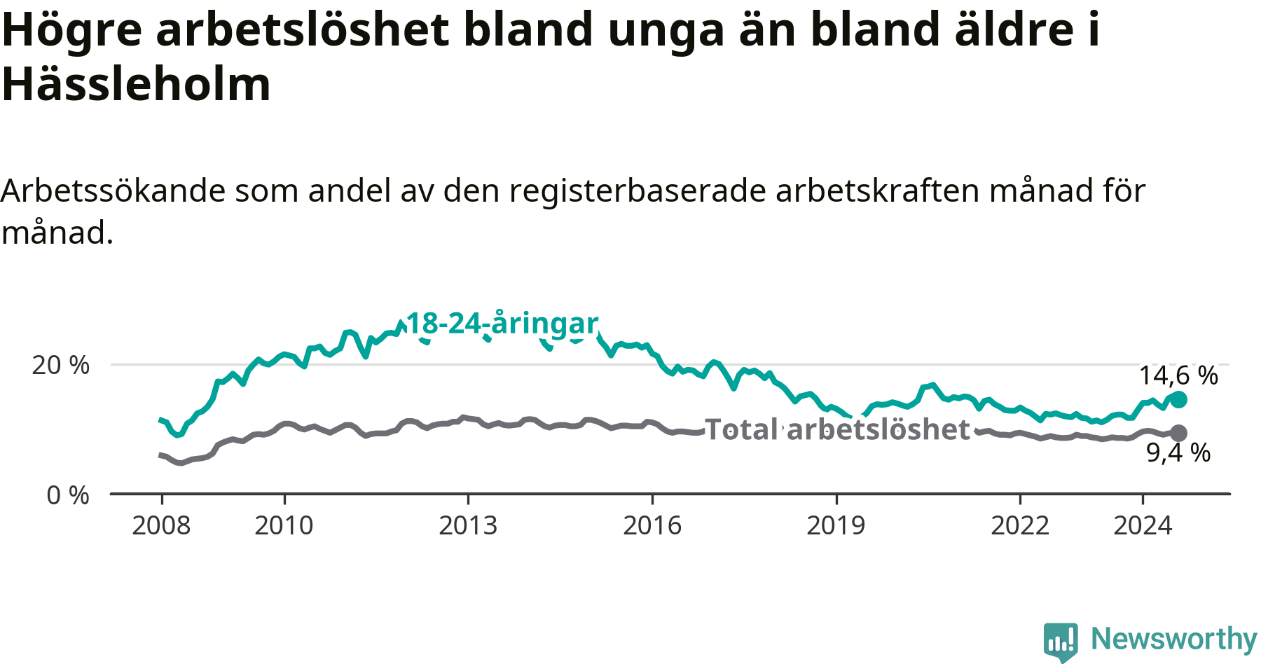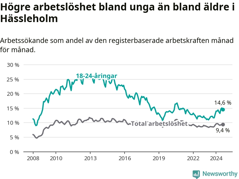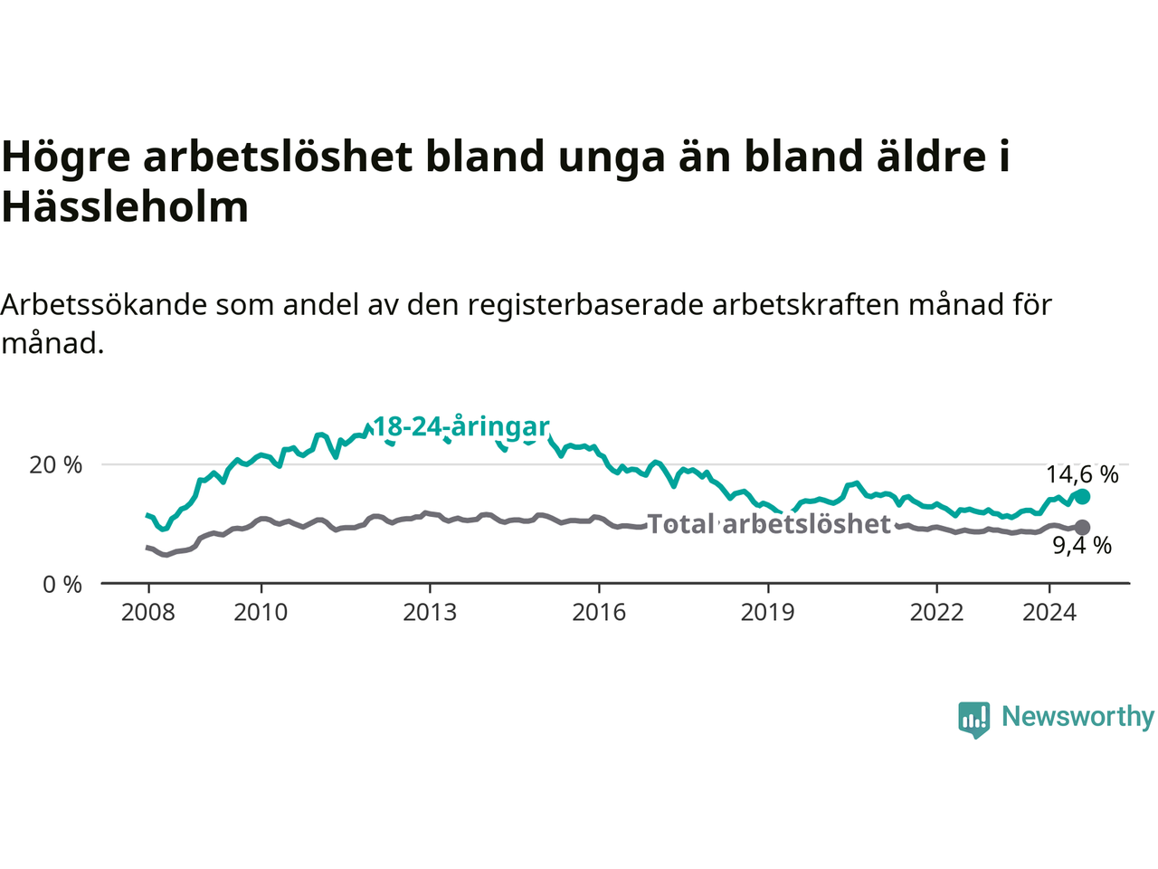 I och med den senaste månadens uppgång har de ungas arbetslöshet i Hässleholm stigit nio månader i följd (upp från 11,7 procent i november 2023 till 14,6 procent nu).