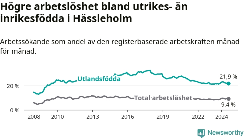Arbetslösheten bland utlandsfödda var 21,9 procent i Hässleholm under augusti månad, motsvarande 1 175 av 5 365 personer. Det är 0,3 procentenheter fler än vid samma tidpunkt i fjol (+31 om man räknar personer). Därmed är de utlandsföddas arbetslöshet högre än vid samma tidpunkt i fjol för åttonde månaden i följd.