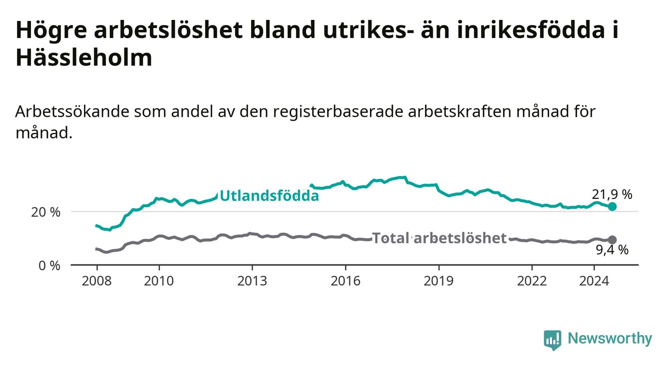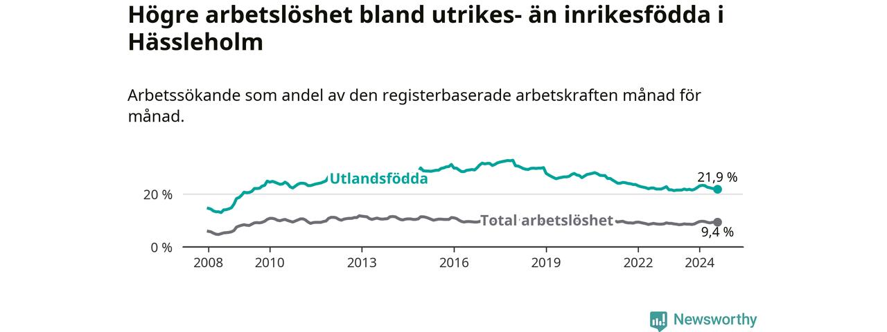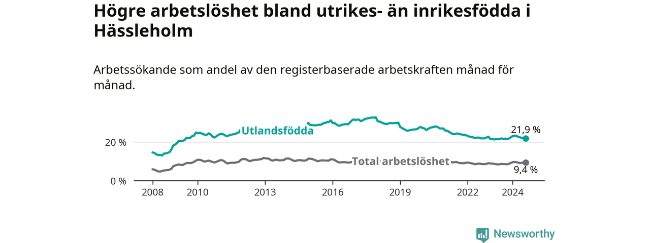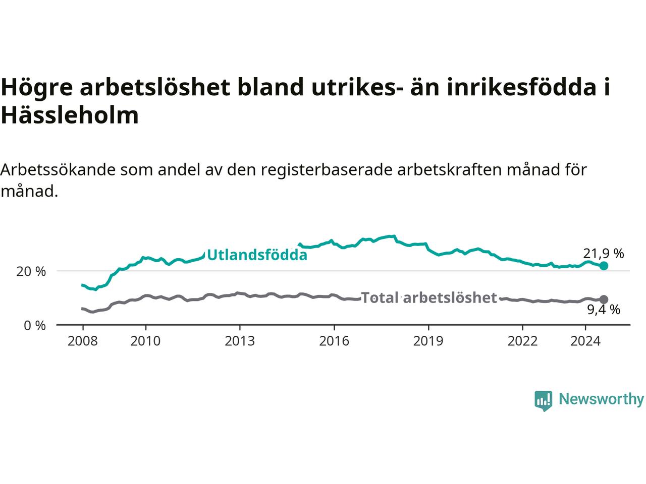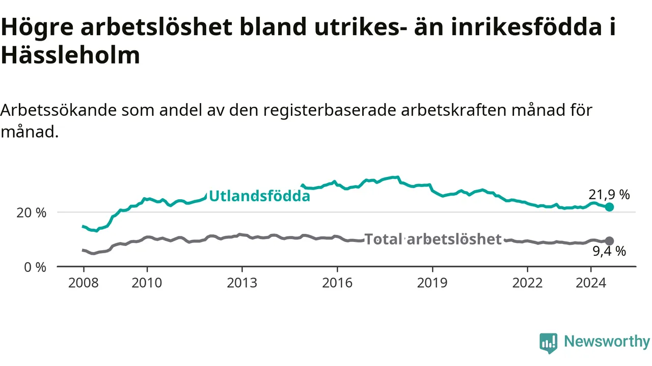 Skillnaden i arbetslöshet mellan utrikesfödda och hela befolkningen är 12,5 procentenheter i Hässleholm. Det är en mindre skillnad än för ett år sedan (−0,5 procentenheter).