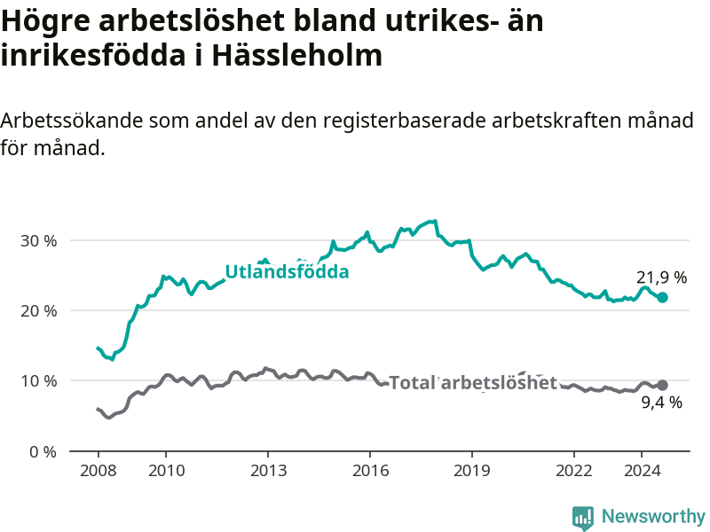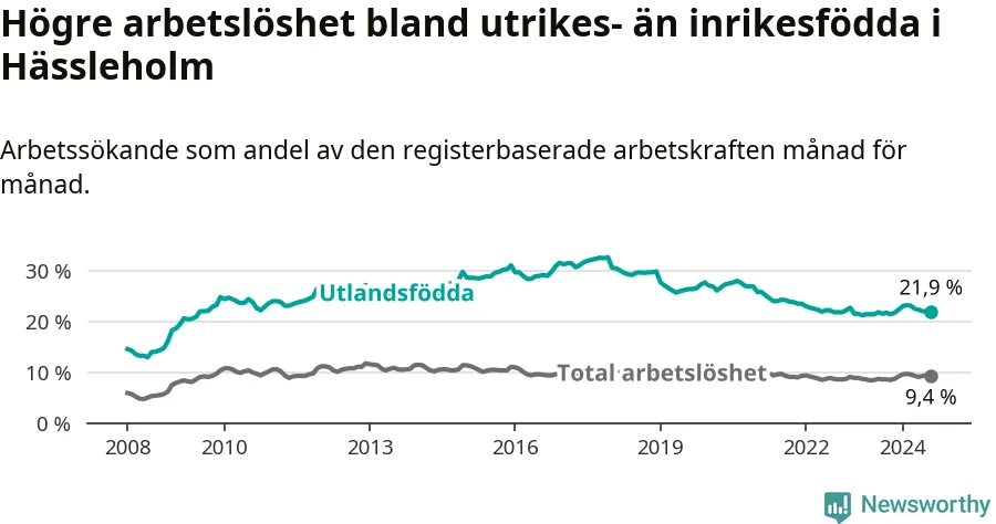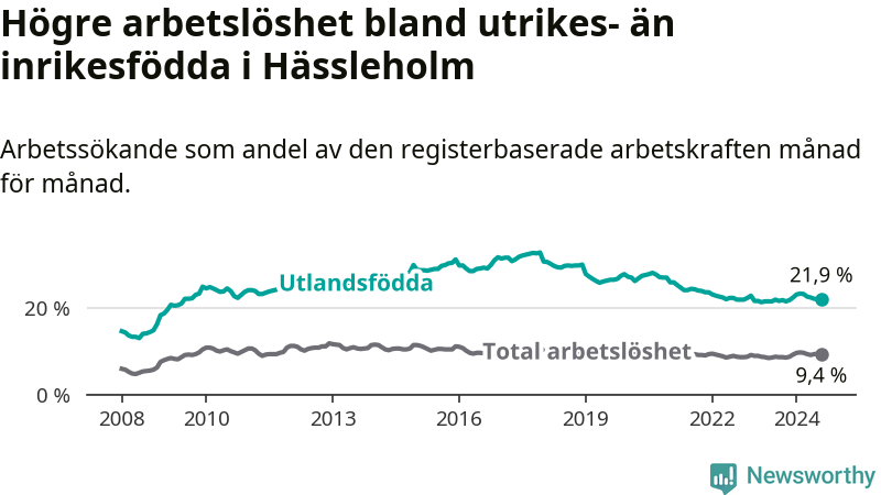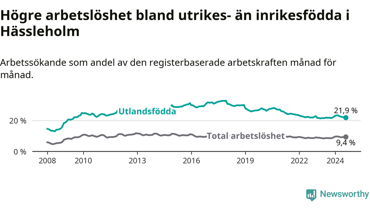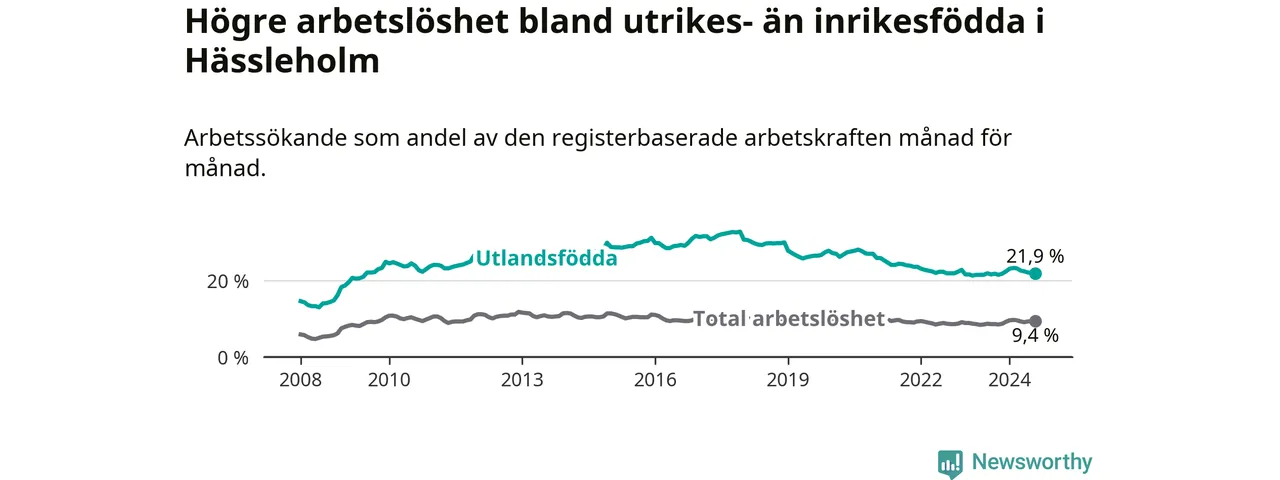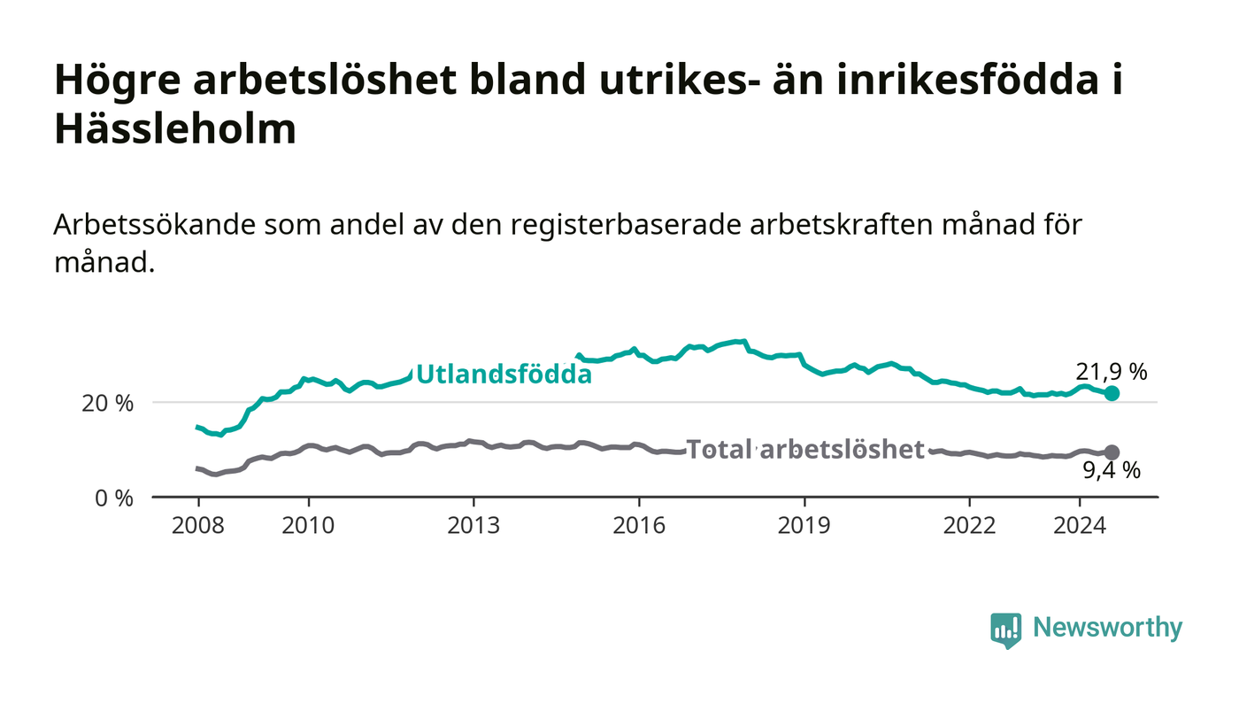 Skillnaden i arbetslöshet mellan utrikesfödda och hela befolkningen är 12,5 procentenheter i Hässleholm. Det är en mindre skillnad än för ett år sedan (−0,5 procentenheter).