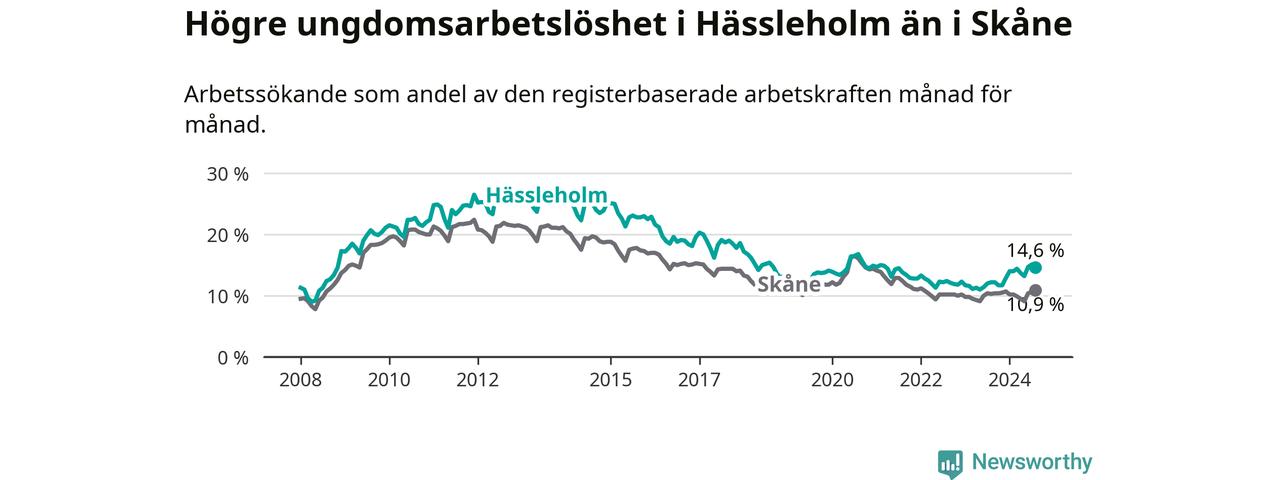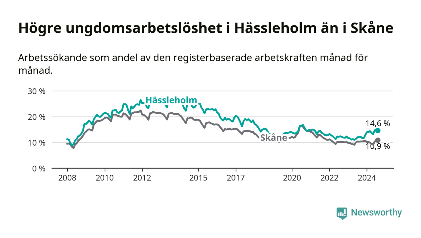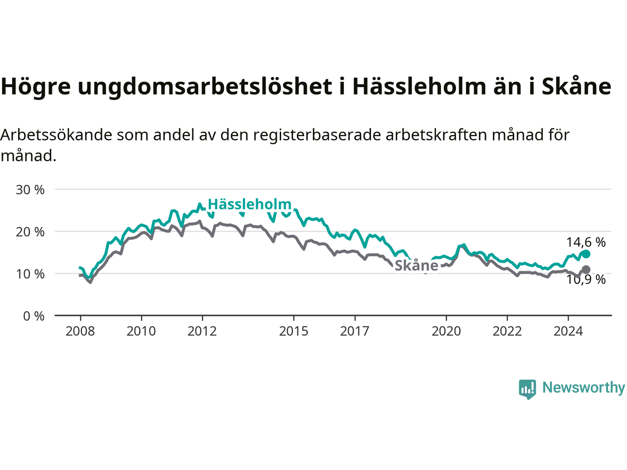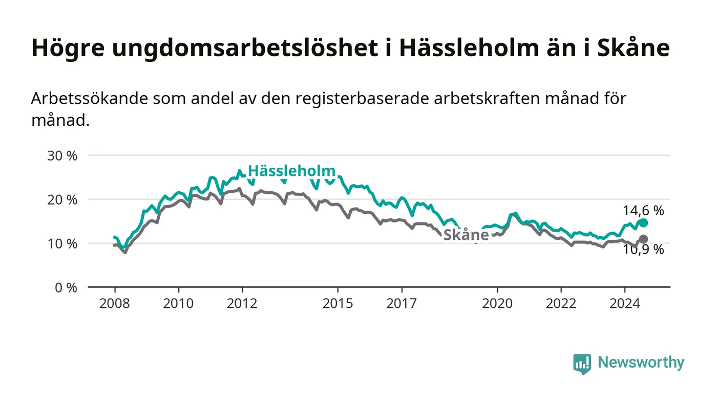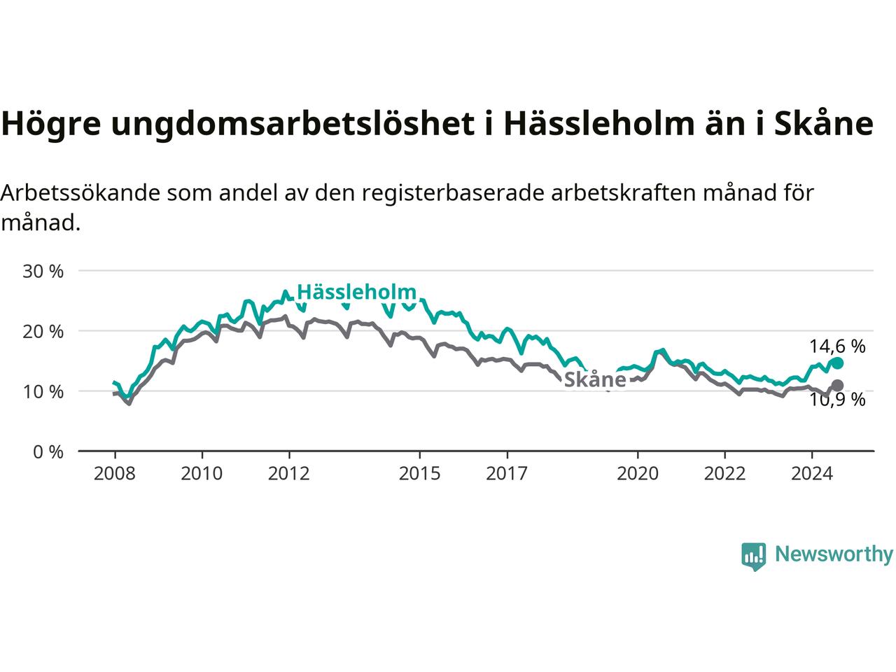 Precis som den totala arbetslösheten ligger ungdomsarbetslösheten i Hässleholm högre än i Skåne som helhet. Skillnaden mellan kommunen och länet är 3,7 procentenheter.