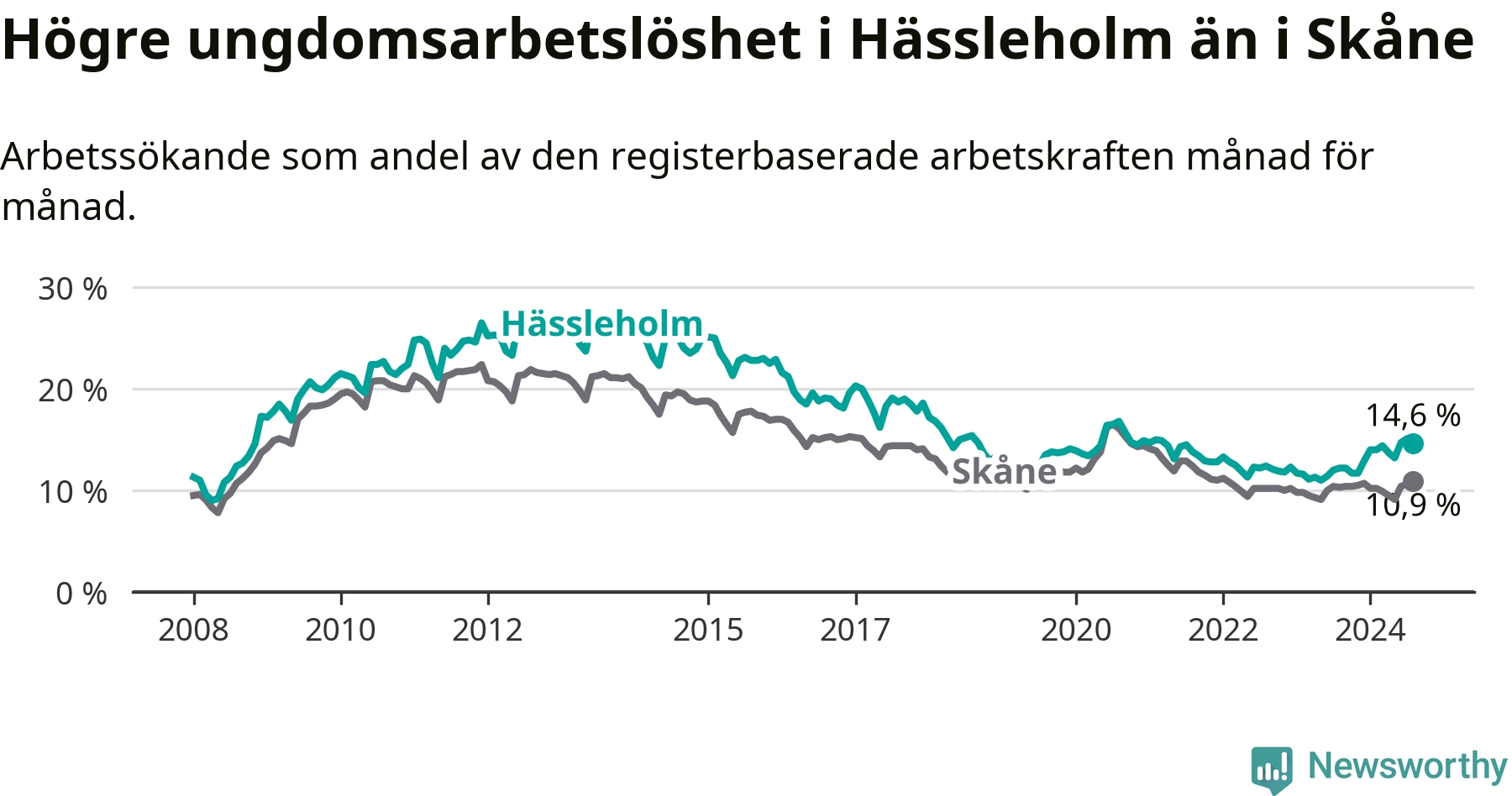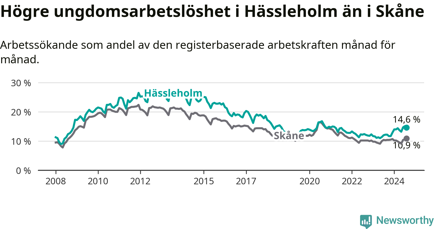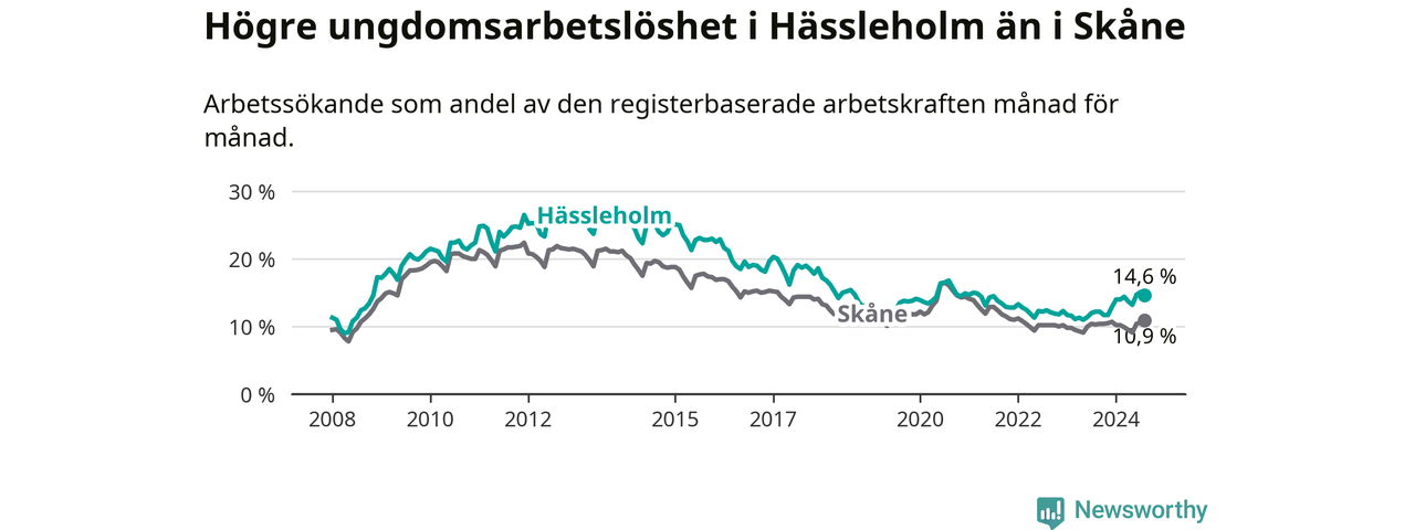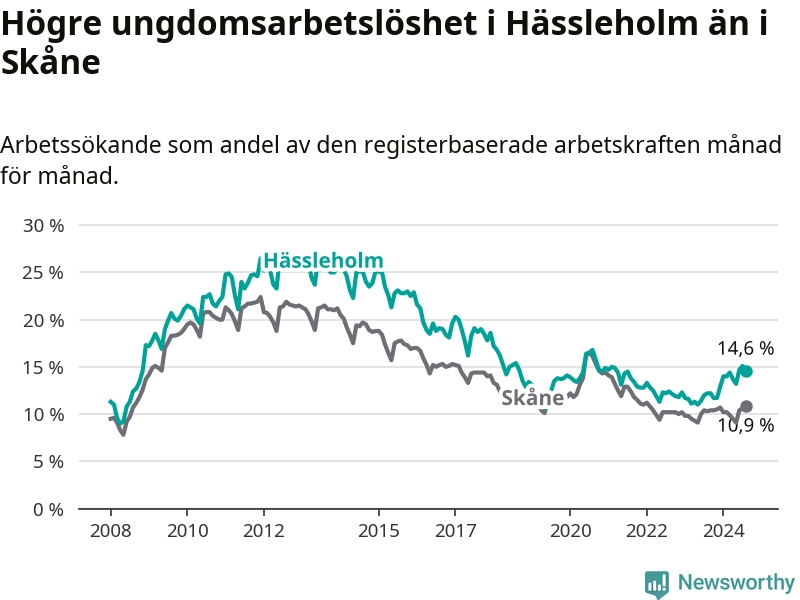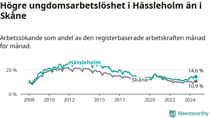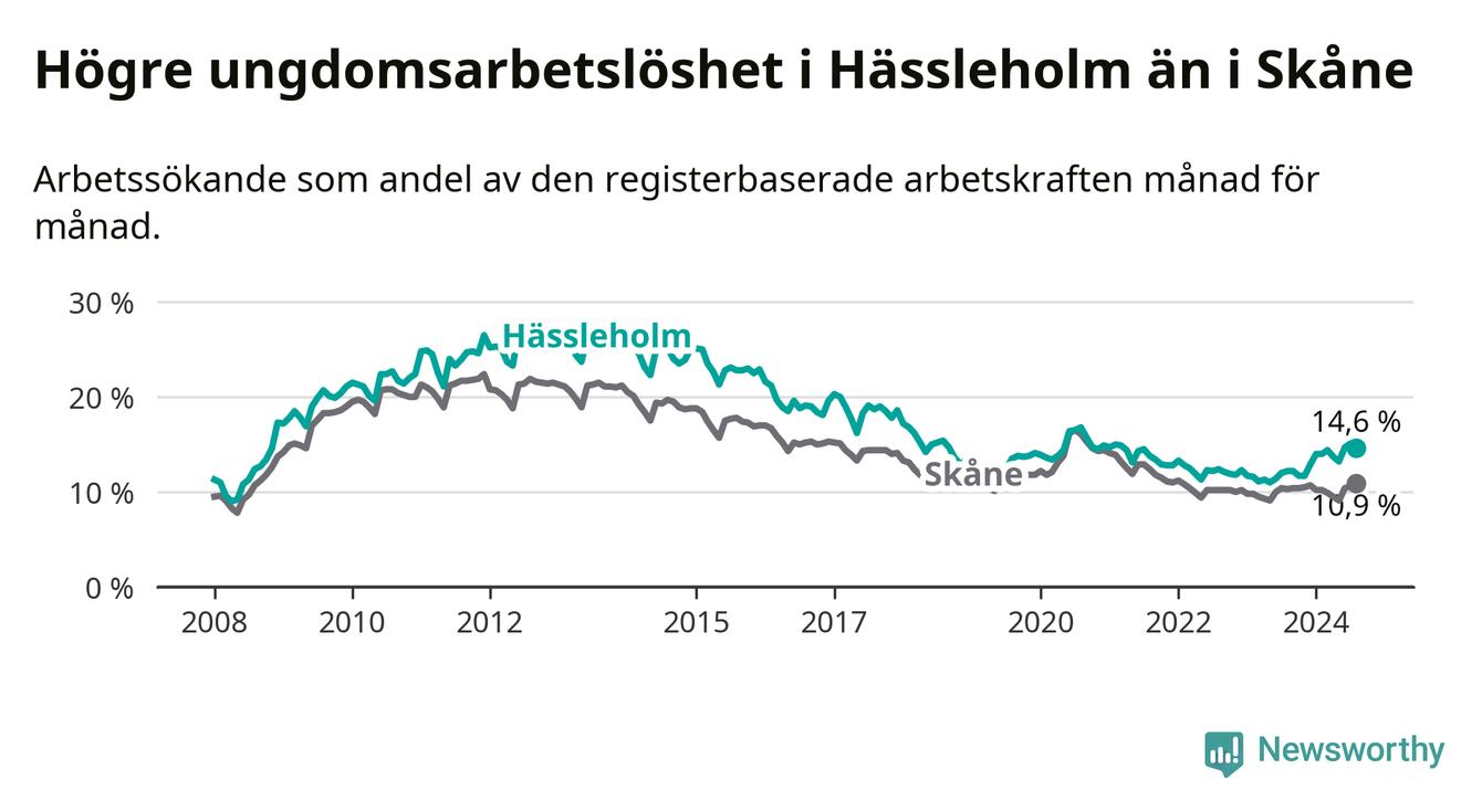 Precis som den totala arbetslösheten ligger ungdomsarbetslösheten i Hässleholm högre än i Skåne som helhet. Skillnaden mellan kommunen och länet är 3,7 procentenheter.