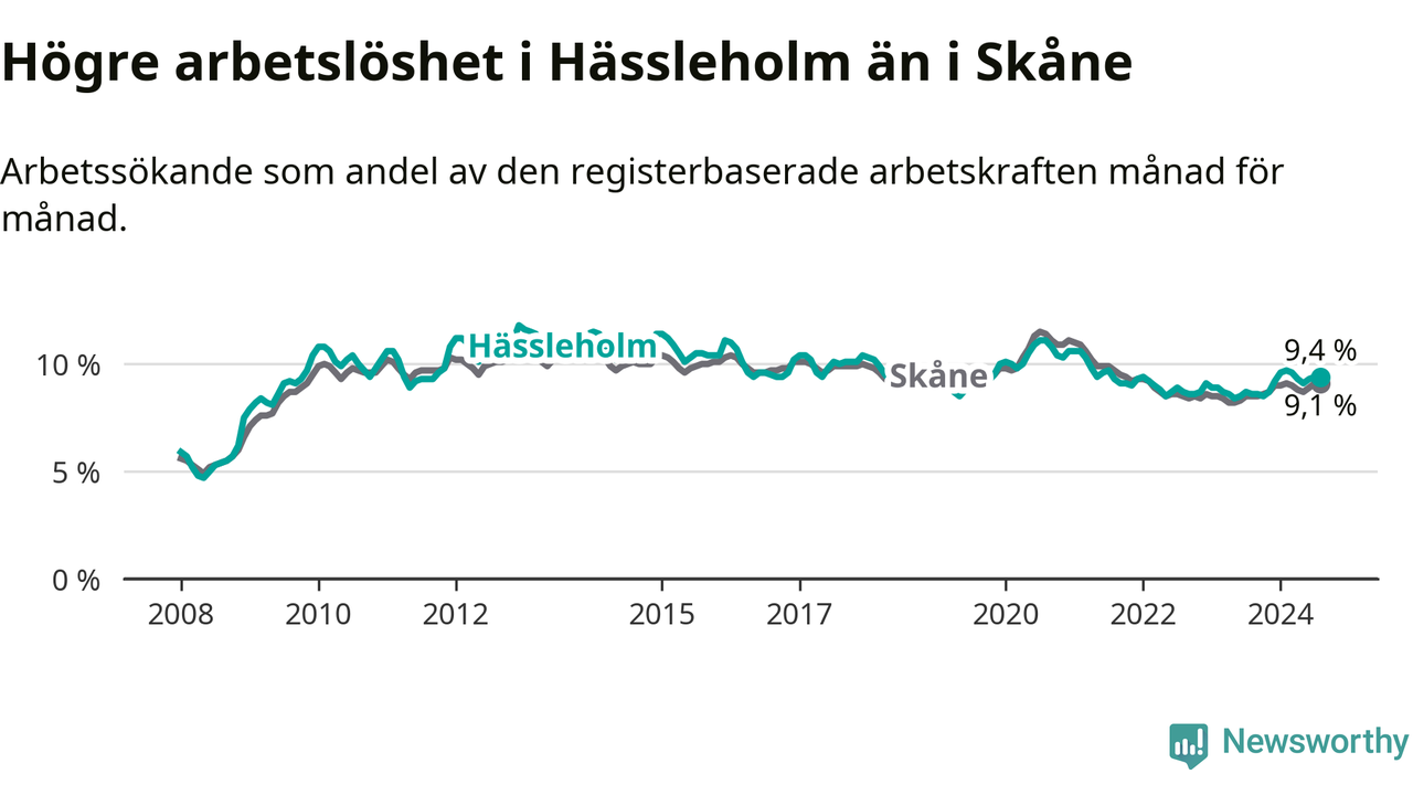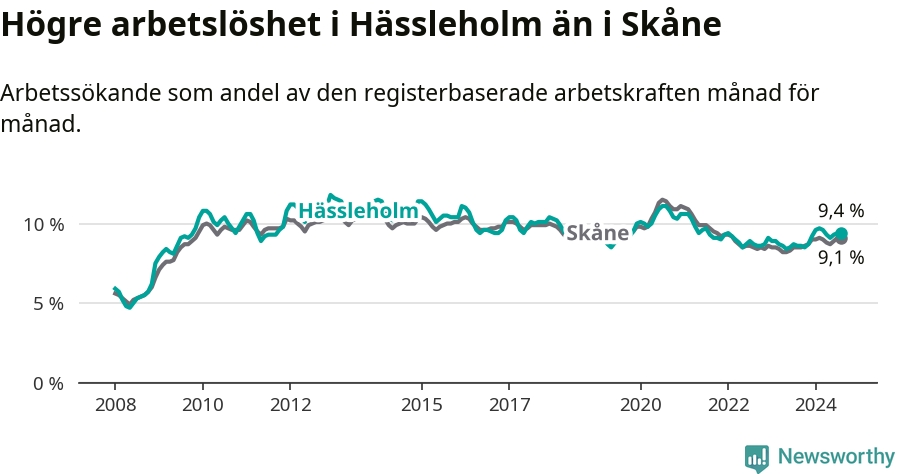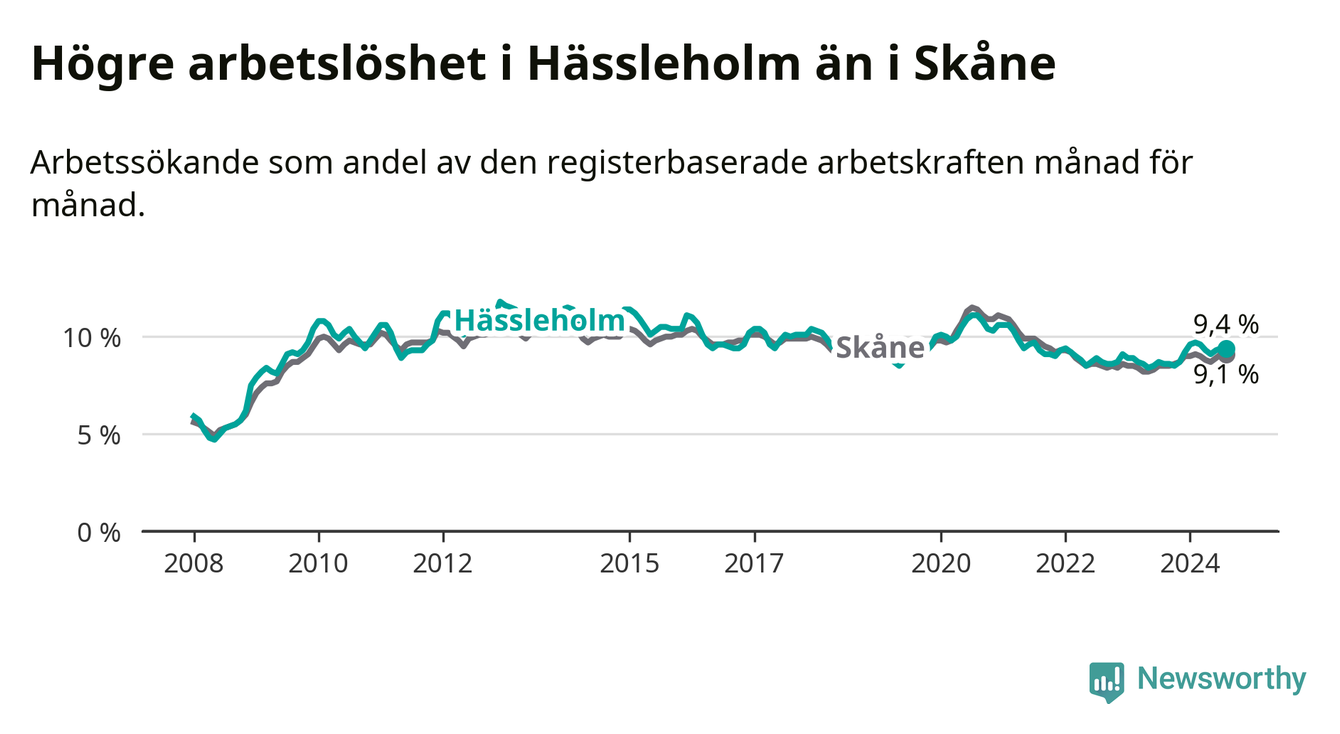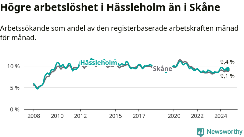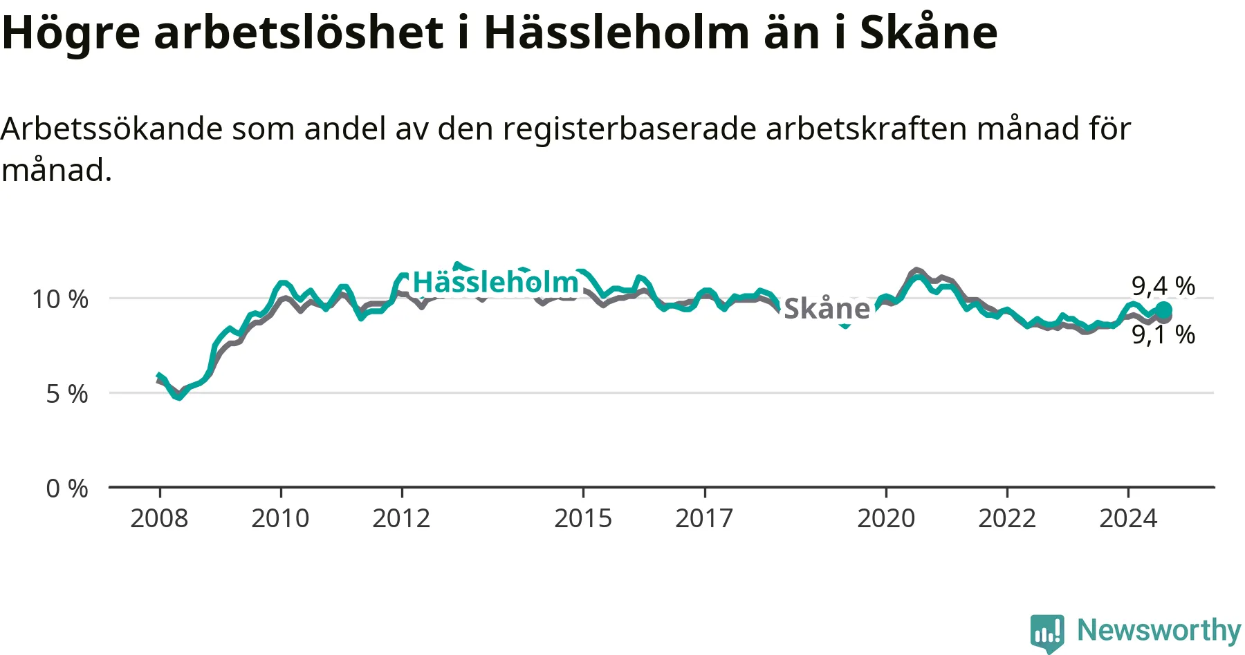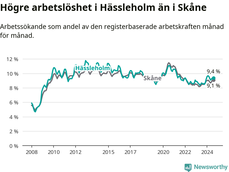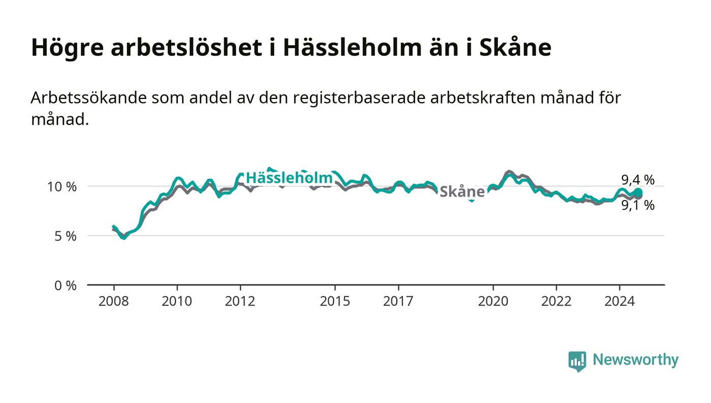Under augusti månad rapporterade Hässleholms kommun en total arbetslöshet på 9,4 procent. Det är en ökning jämfört med samma tidpunkt i fjol (+0,8 procentenheter). Även i Skåne län stiger arbetslösheten .