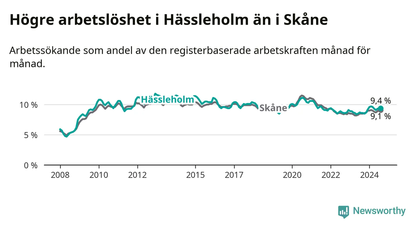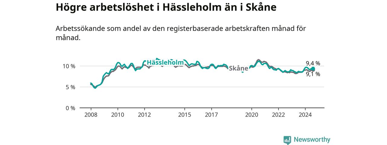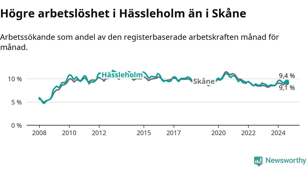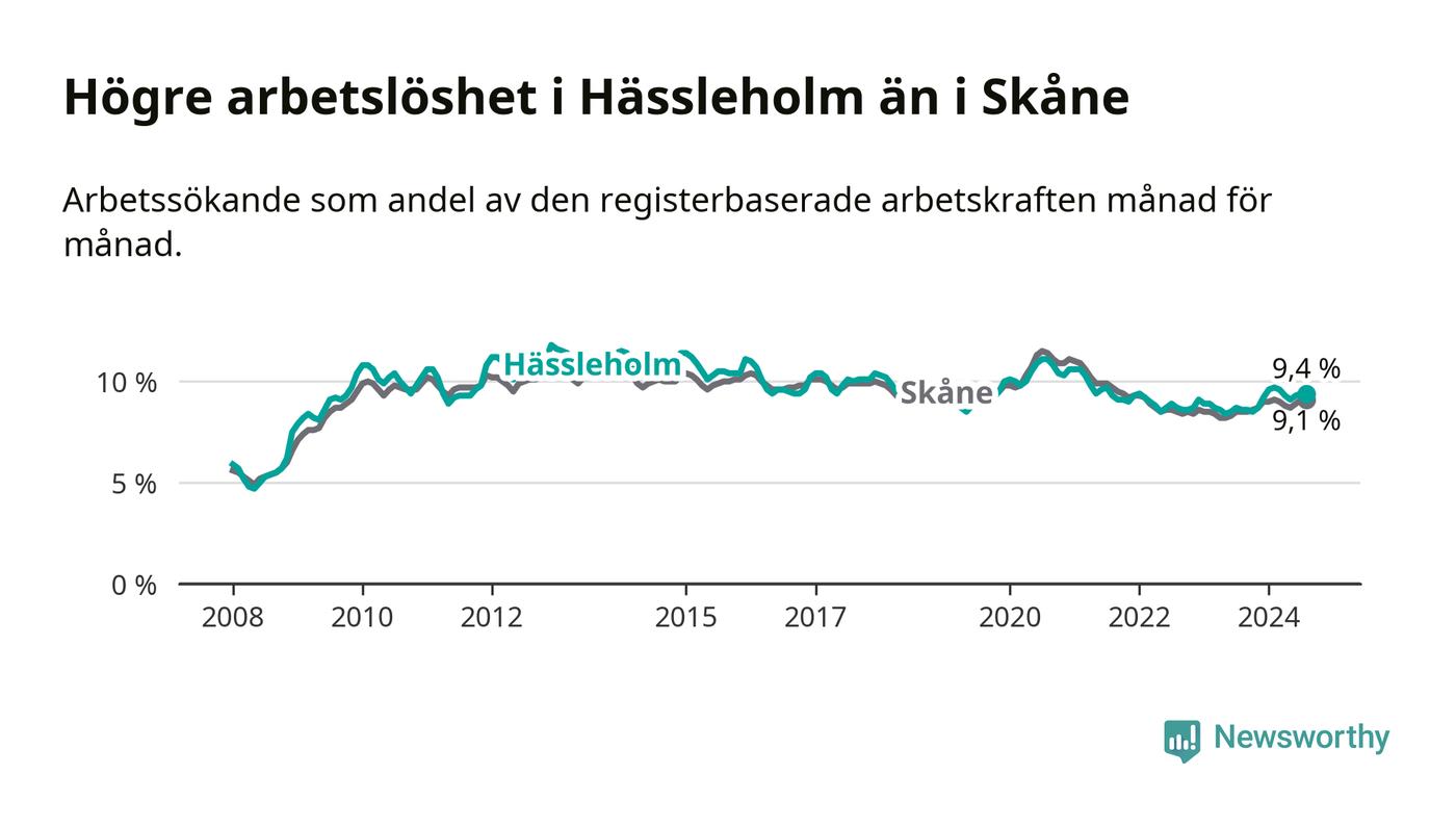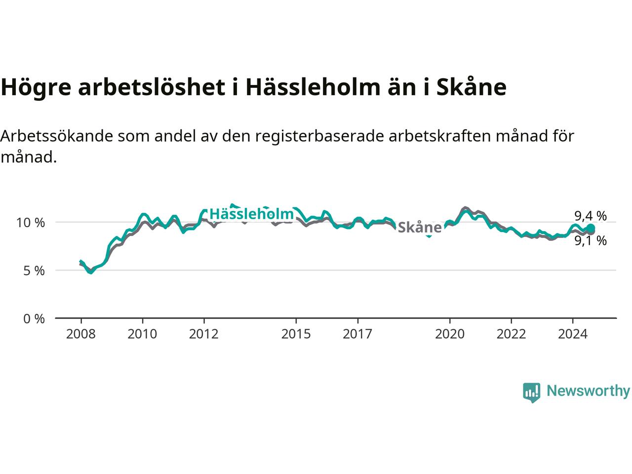 Hässleholm hade redan tidigare högre arbetslöshet än snittet i hela Skåne län och nu växer klyftan (9,4 procent i kommunen, jämfört med 9,1 procent i hela länet). Lomma har den lägsta arbetslösheten i länet (3,8 procent), medan Perstorp har den högsta (13,9 procent). För att Hässleholm skulle komma ner i samma arbetslöshetsnivå som Lomma skulle 1 387 personer behöva sysselsättas.