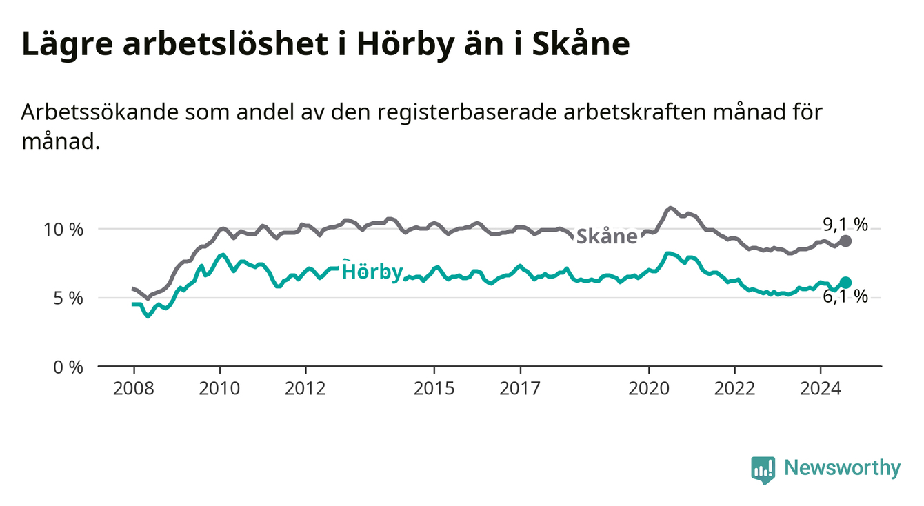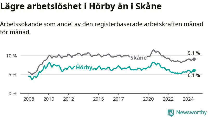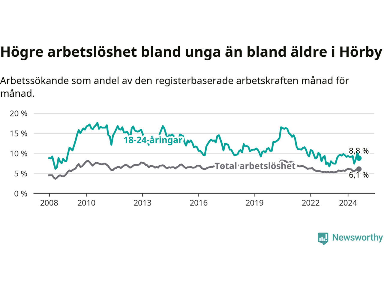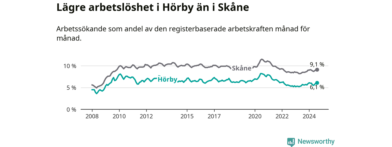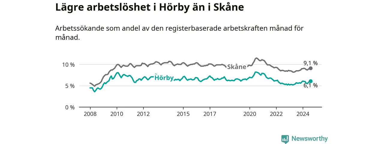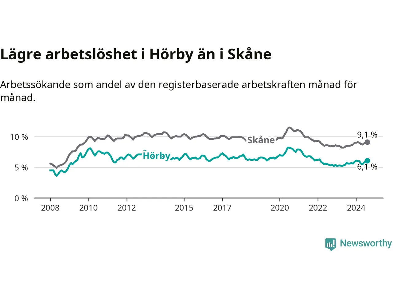 Under augusti månad rapporterade Hörby kommun en total arbetslöshet på 6,1 procent. Det är en ökning jämfört med samma tidpunkt i fjol (+0,5 procentenheter). Även i Skåne län stiger arbetslösheten .