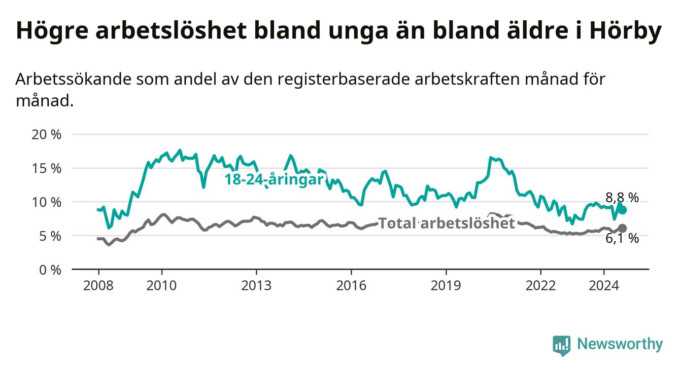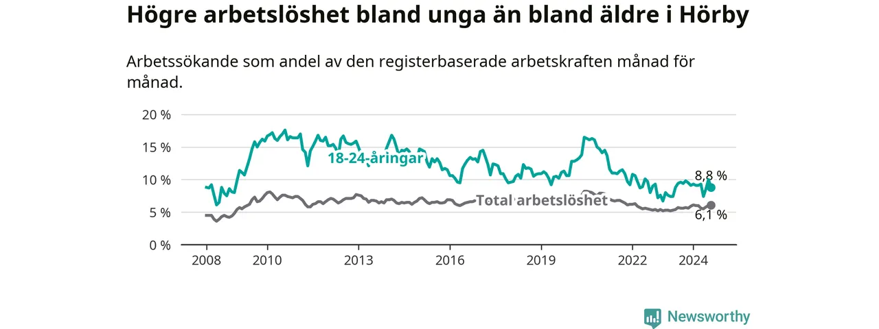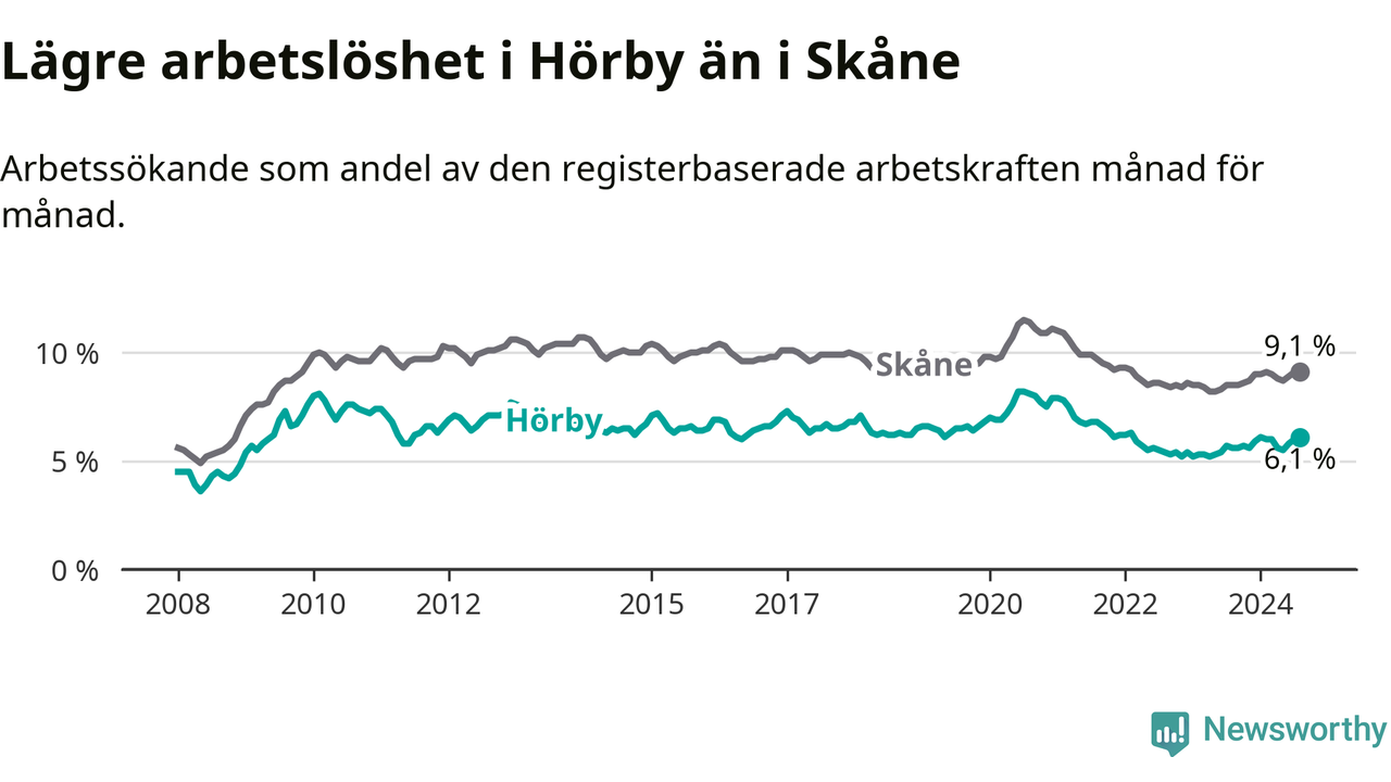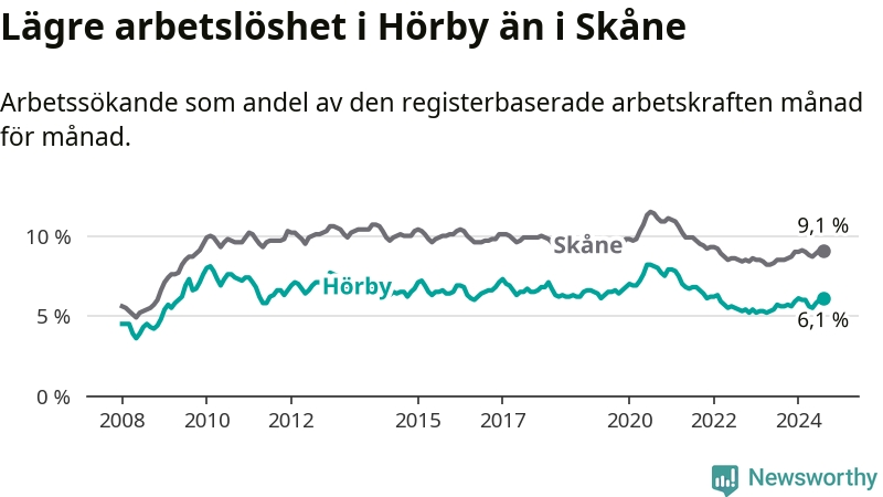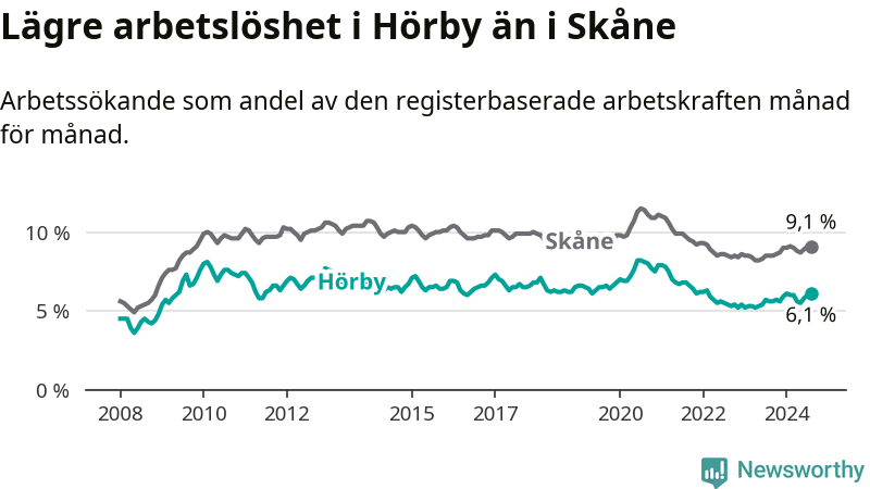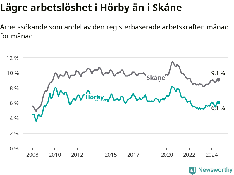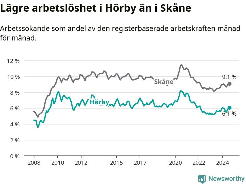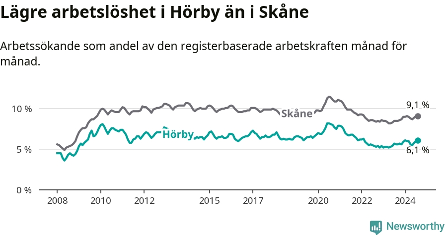 Under augusti månad rapporterade Hörby kommun en total arbetslöshet på 6,1 procent. Det är en ökning jämfört med samma tidpunkt i fjol (+0,5 procentenheter). Även i Skåne län stiger arbetslösheten .