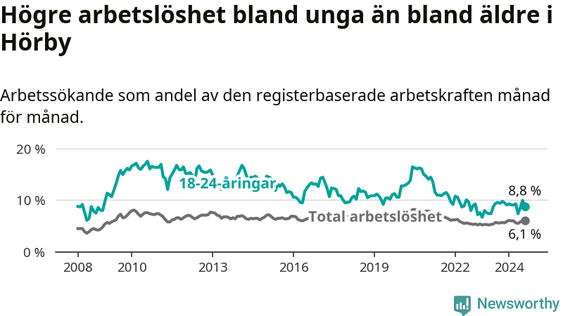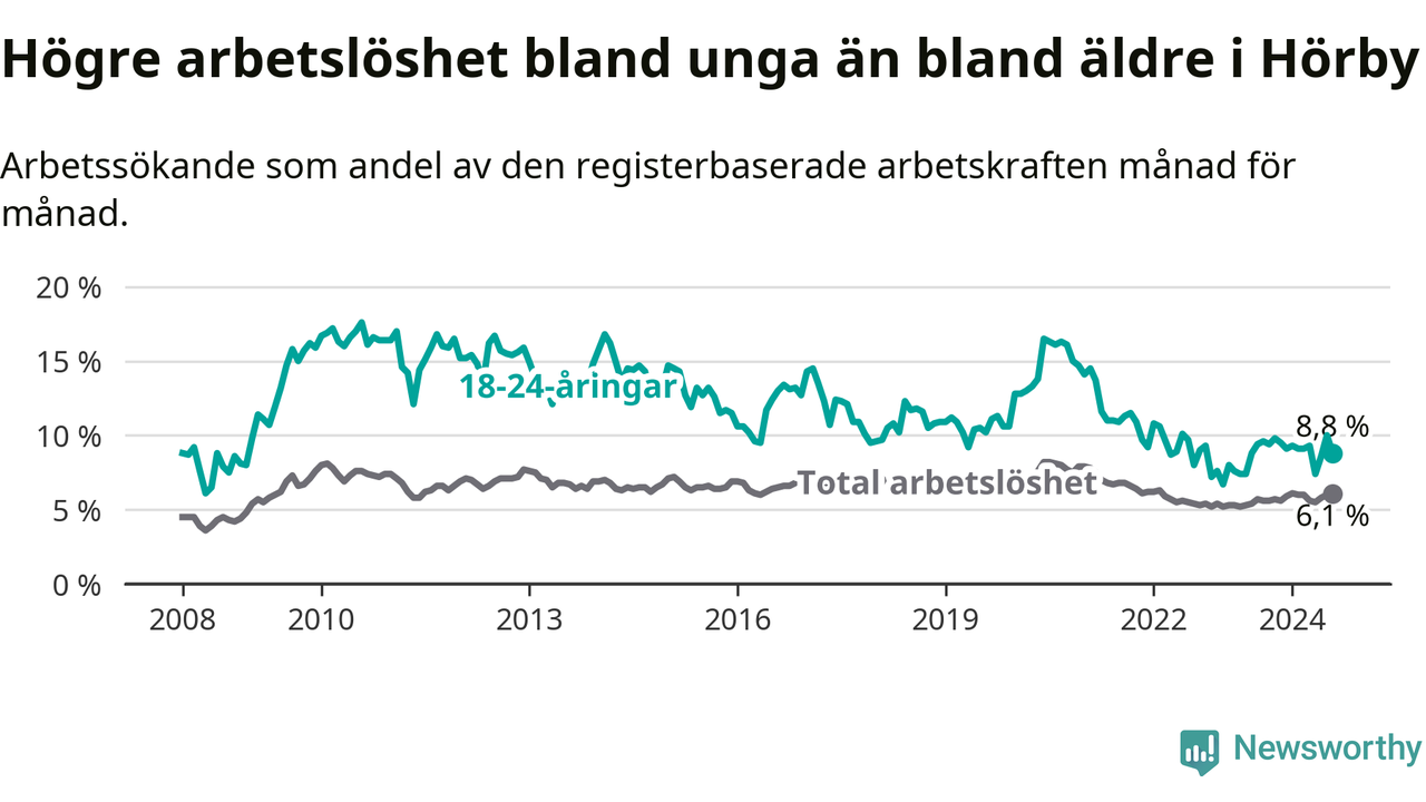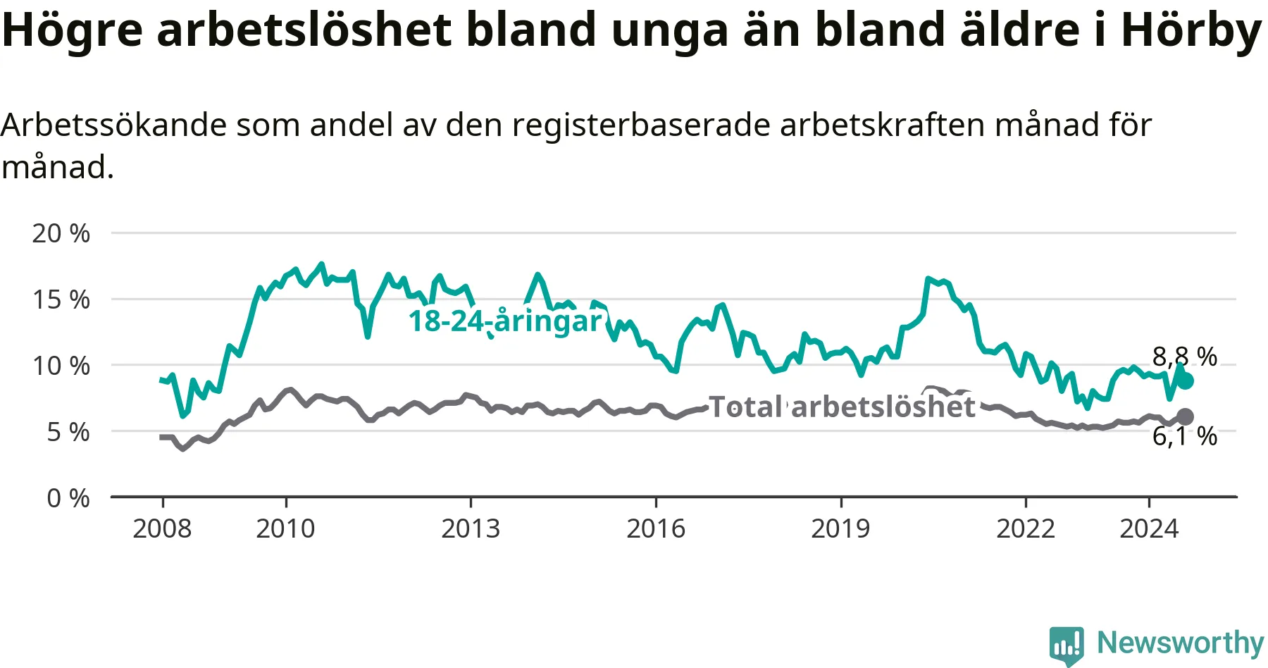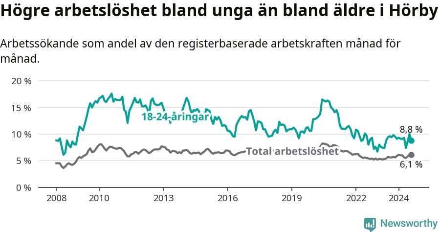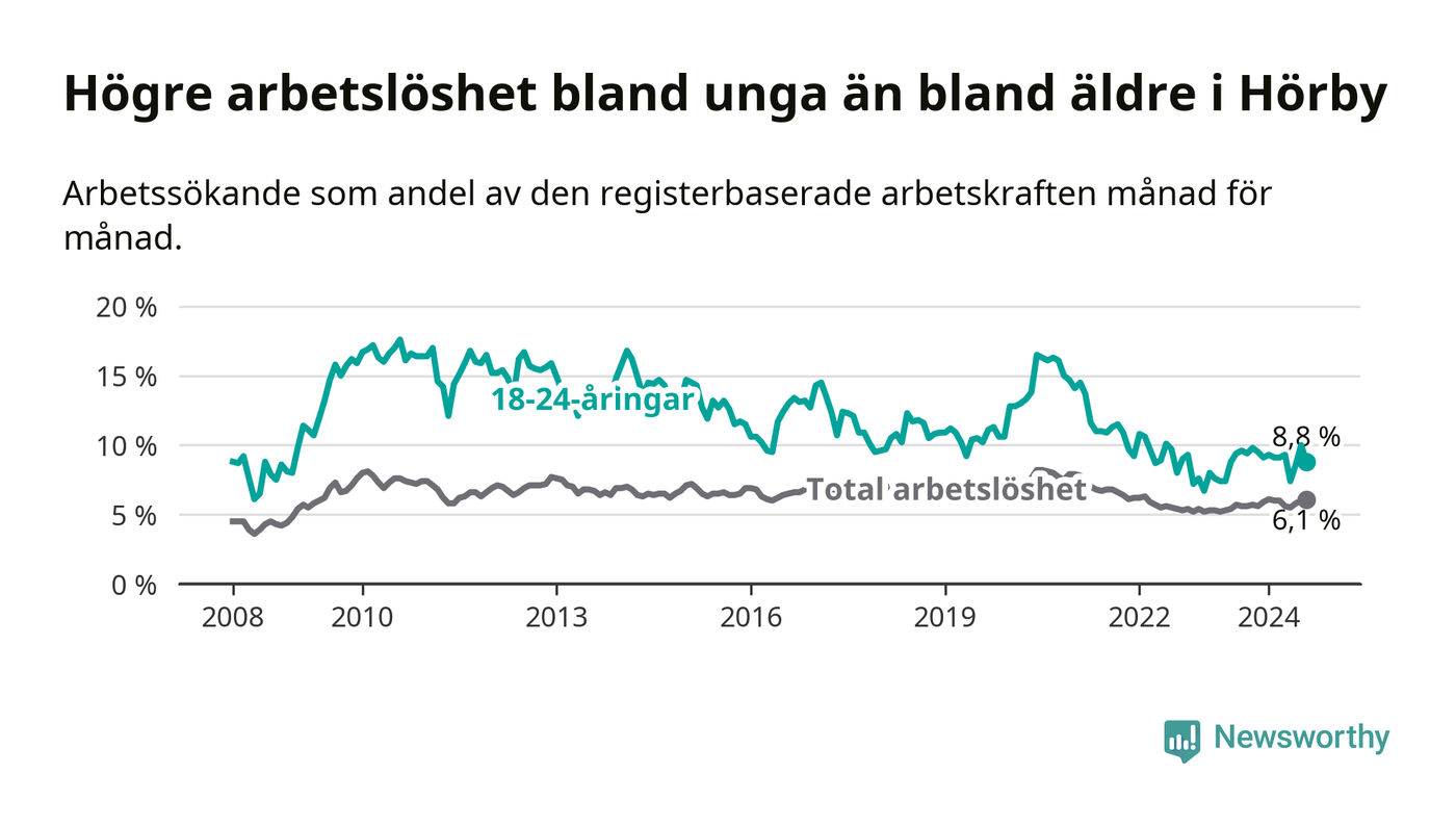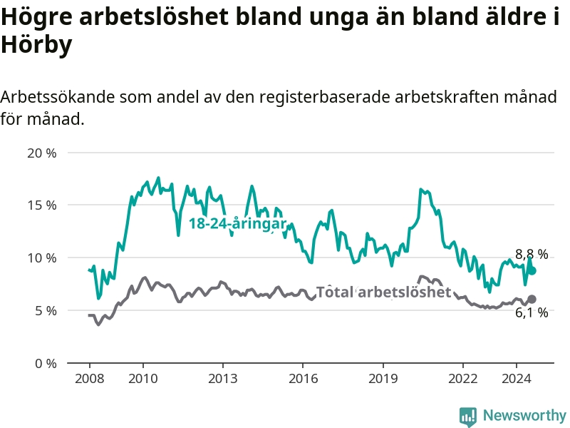 Under augusti månad rapporterade Hörby kommun en total arbetslöshet på 6,1 procent. Det är en ökning jämfört med samma tidpunkt i fjol (+0,5 procentenheter). Även i Skåne län stiger arbetslösheten .