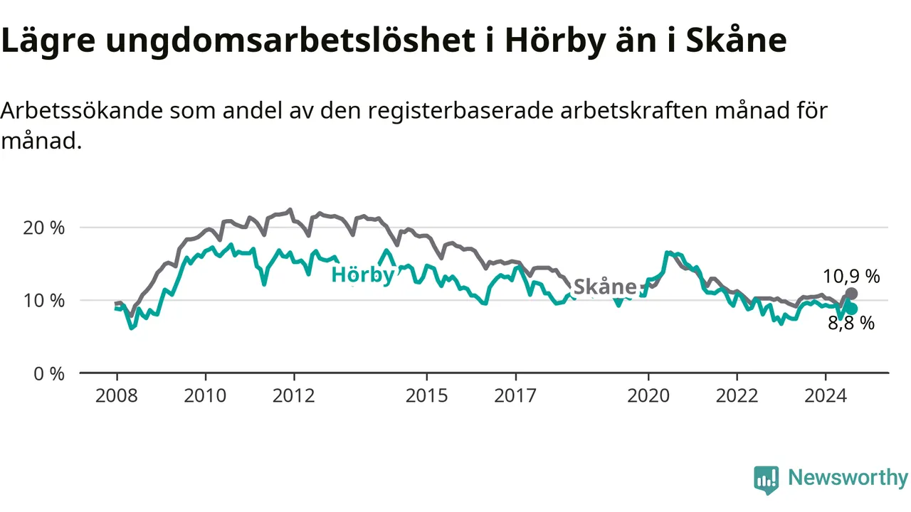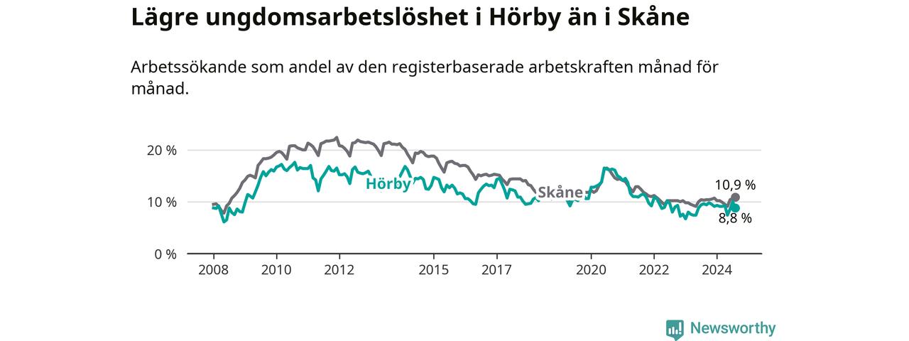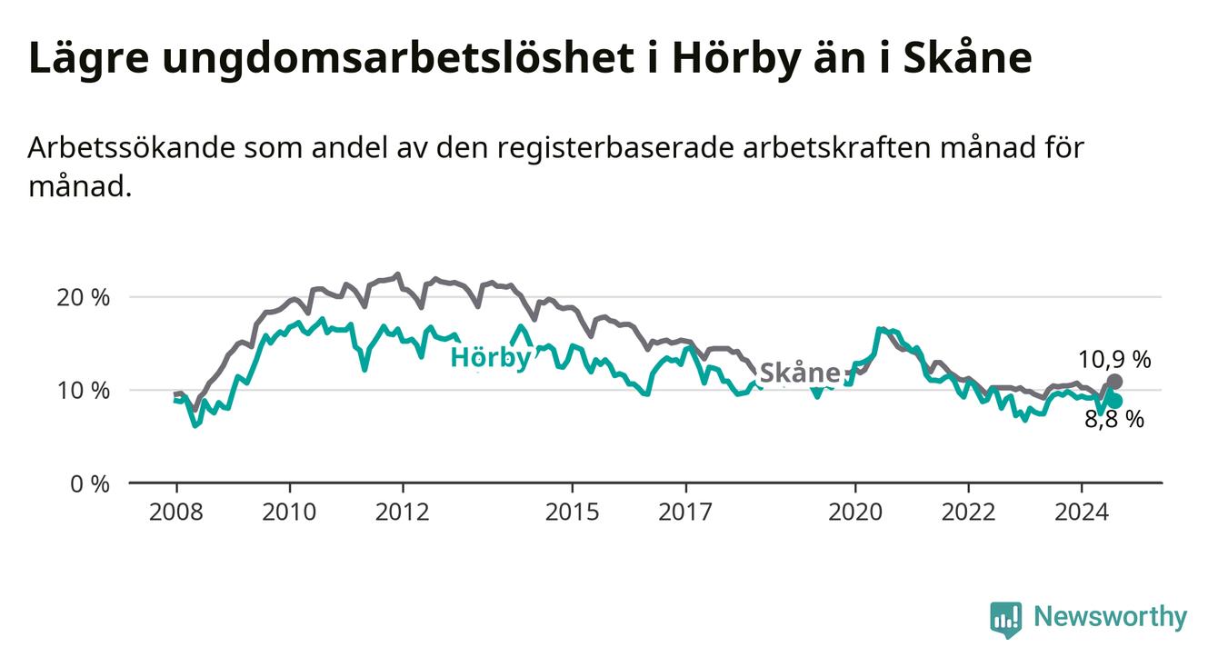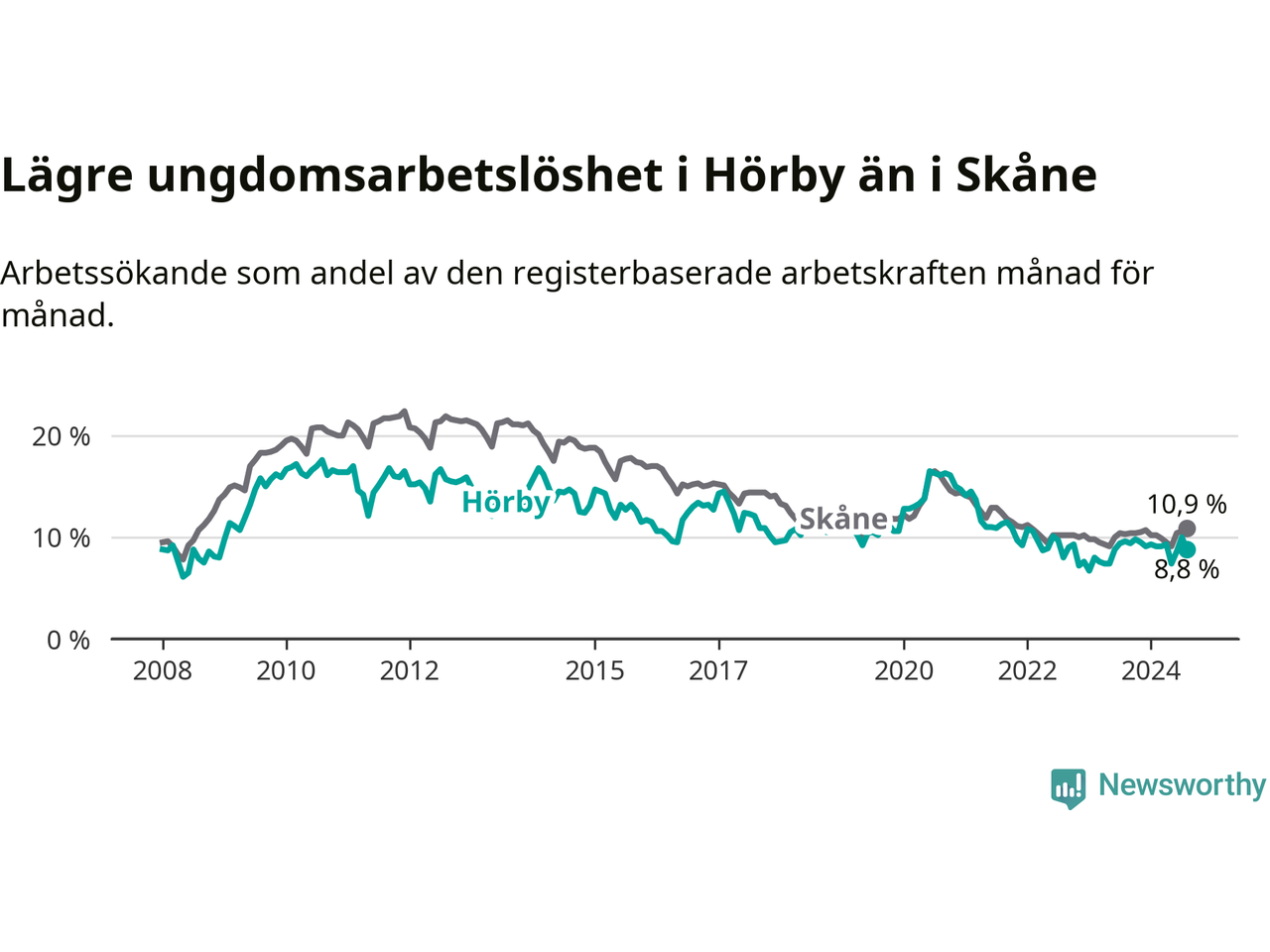 Precis som den totala arbetslösheten ligger ungdomsarbetslösheten i Hörby lägre än i Skåne som helhet. Skillnaden mellan kommunen och länet är 2,1 procentenheter.