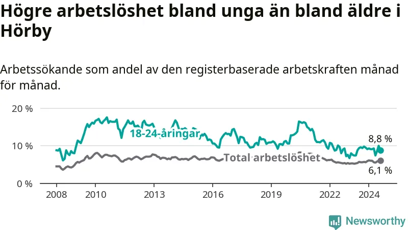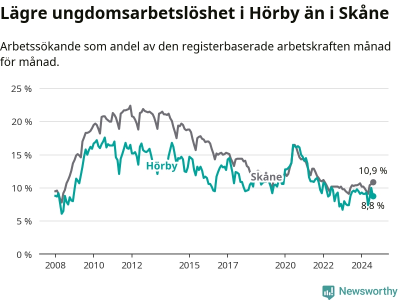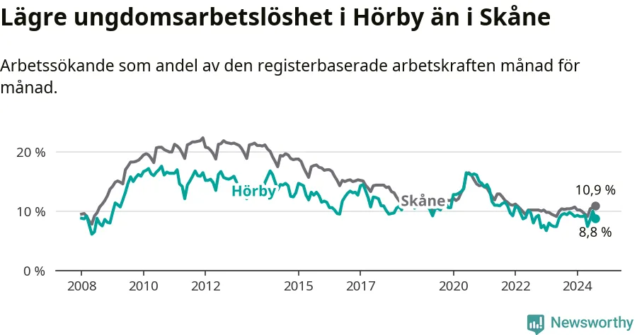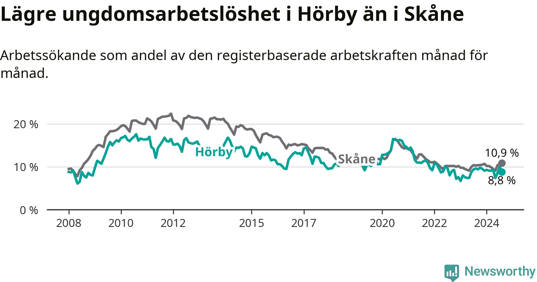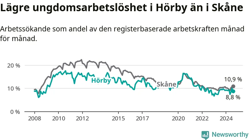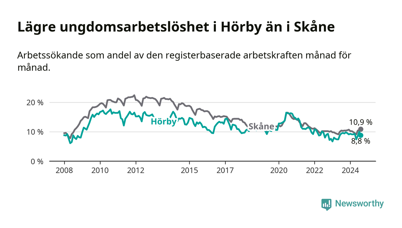 Precis som den totala arbetslösheten ligger ungdomsarbetslösheten i Hörby lägre än i Skåne som helhet. Skillnaden mellan kommunen och länet är 2,1 procentenheter.