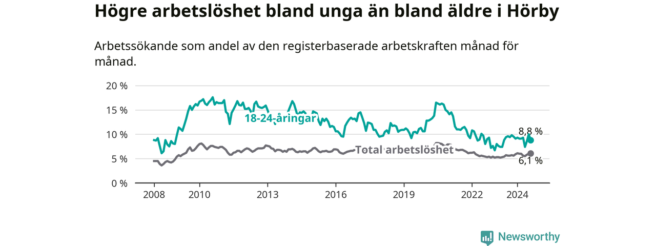 Till skillnad från den totala arbetslösheten sjunker arbetslösheten bland unga (−0,8 procentenheter). I augusti var 8,8 procent av 18–24-åringarna inskrivna som arbetssökande (motsvarande 59 personer). Mäter vi antalet inskrivna ser vi en minskning med fem personer på ett års sikt.