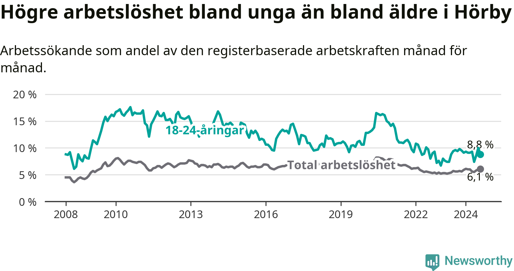Graf: Arbetslöshet bland unga i Hörby kommun och Skåne län
