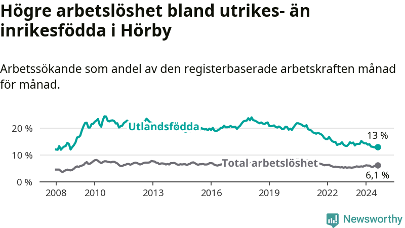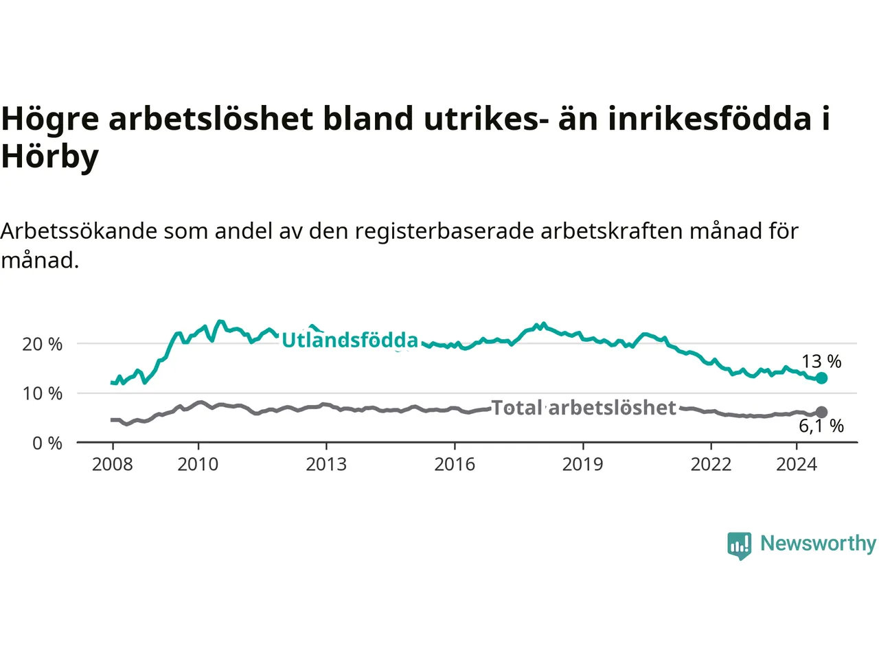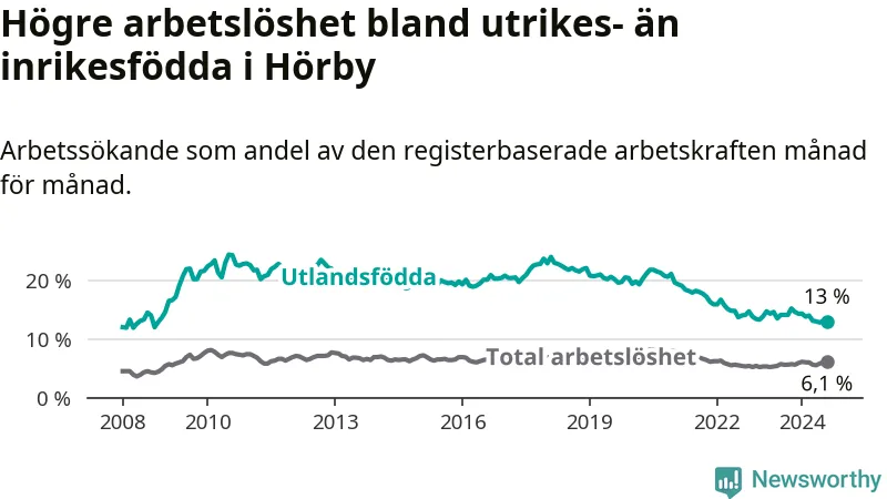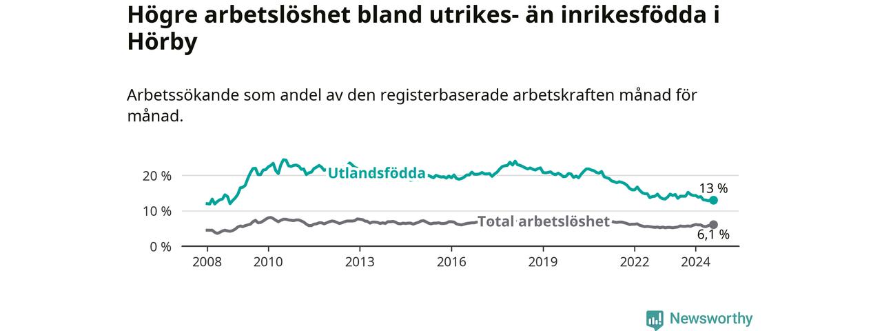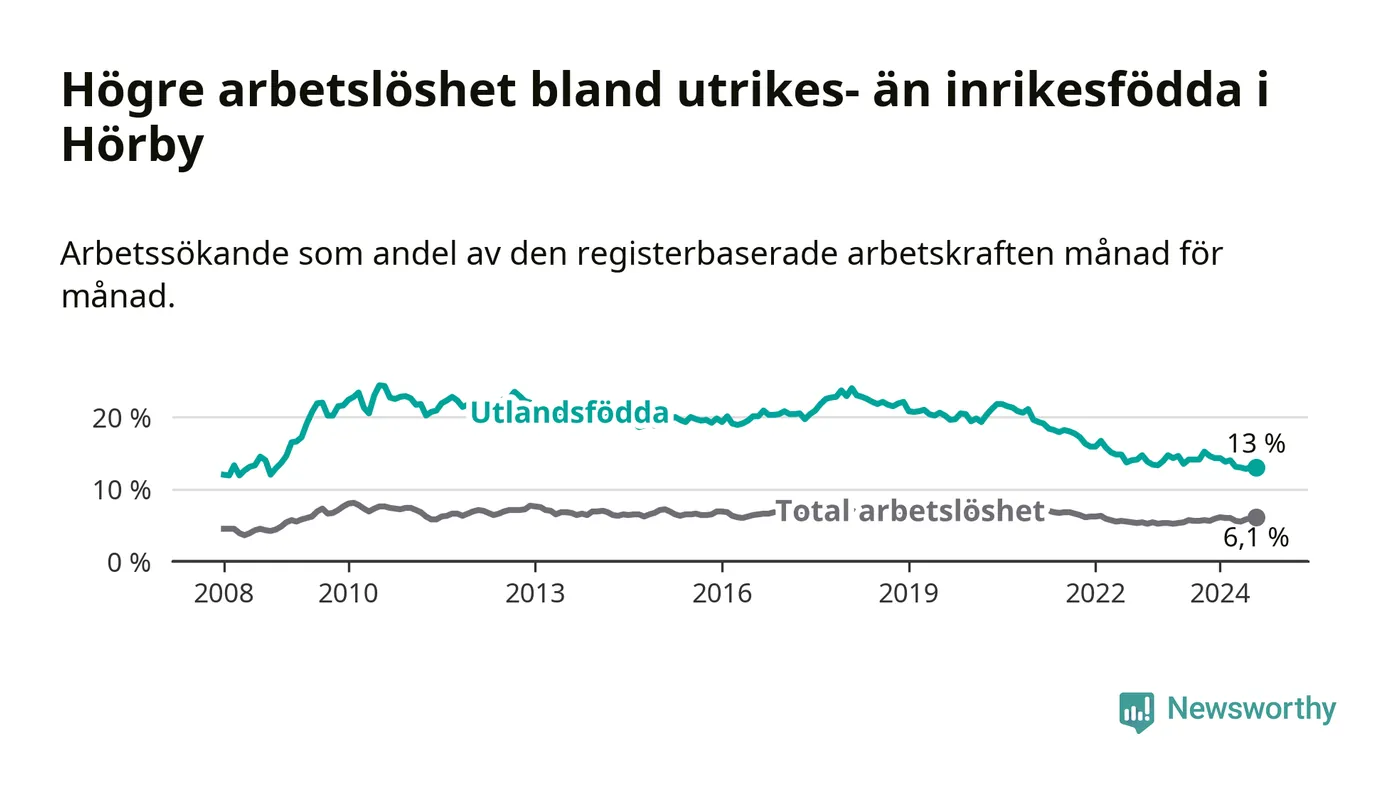 Skillnaden i arbetslöshet mellan utrikesfödda och hela befolkningen är 6,9 procentenheter i Hörby. Det är en betydligt mindre skillnad än för ett år sedan (−1,6 procentenheter).
