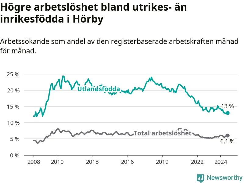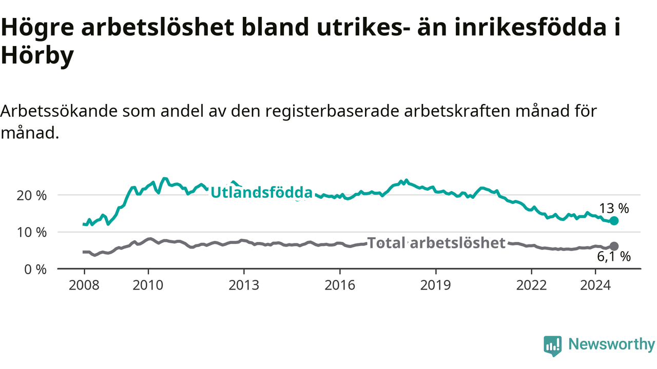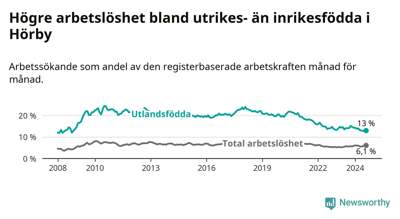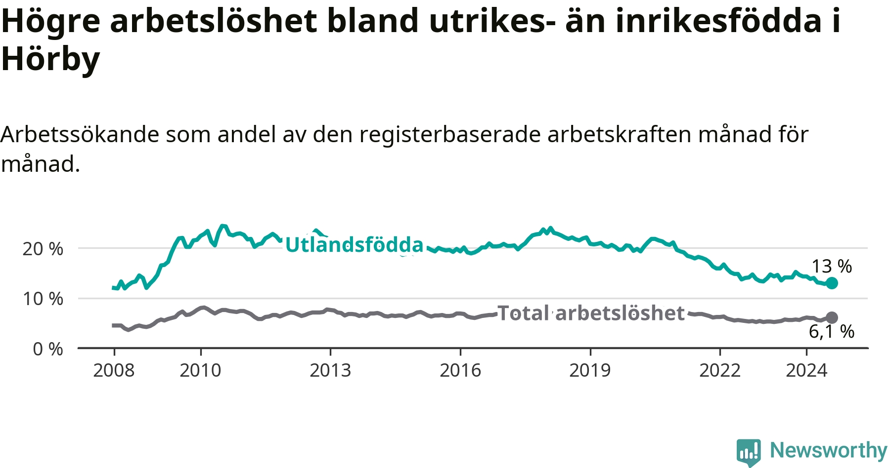 Skillnaden i arbetslöshet mellan utrikesfödda och hela befolkningen är 6,9 procentenheter i Hörby. Det är en betydligt mindre skillnad än för ett år sedan (−1,6 procentenheter).