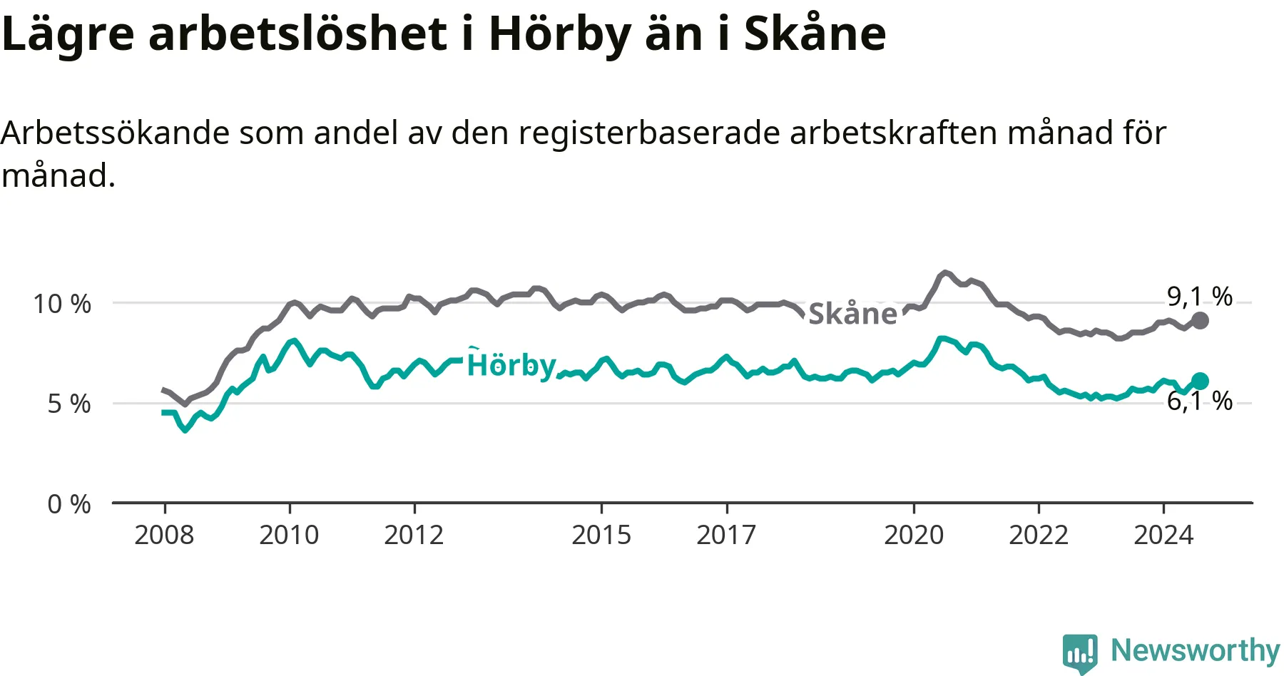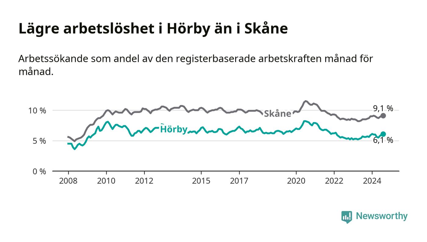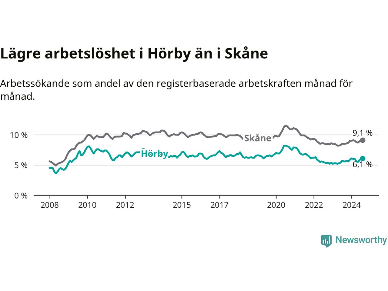 Även om arbetslösheten i Hörby alltså ökar, så ligger den fortfarande under snittet i hela Skåne län (6,1 procent i kommunen, jämfört med 9,1 procent i hela länet). Lomma har den lägsta arbetslösheten i länet (3,8 procent), medan Perstorp har den högsta (13,9 procent). För att Hörby skulle komma ner i samma arbetslöshetsnivå som Lomma skulle 172 personer behöva sysselsättas.