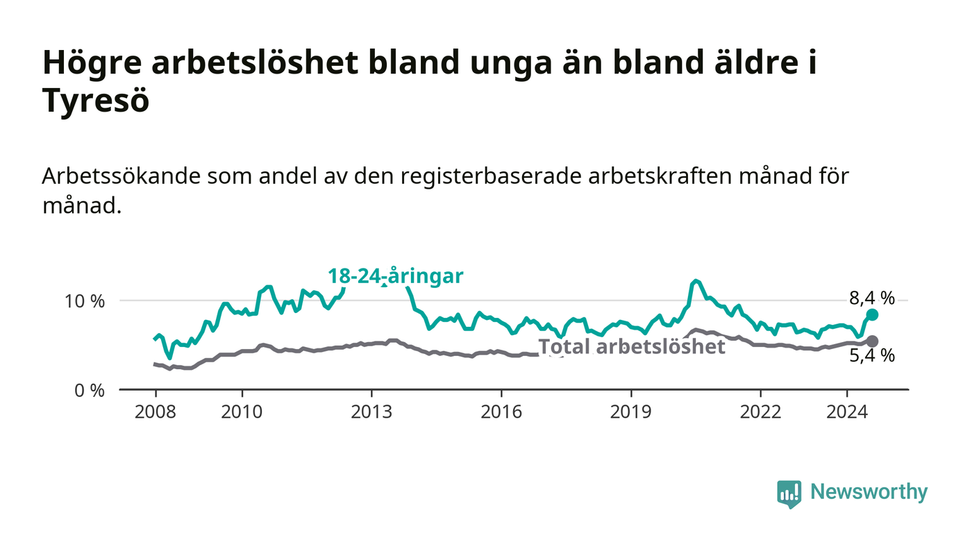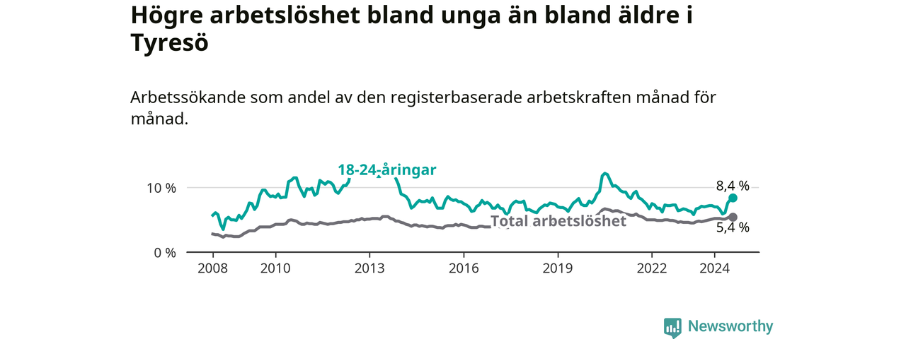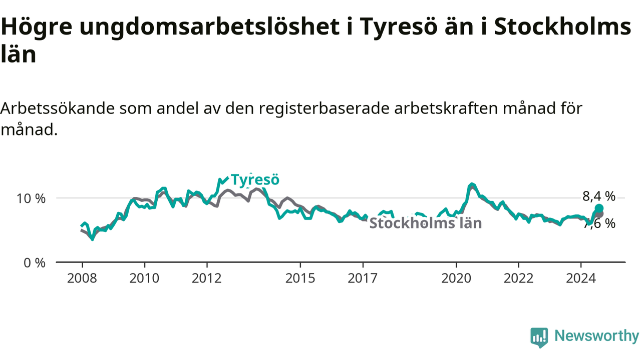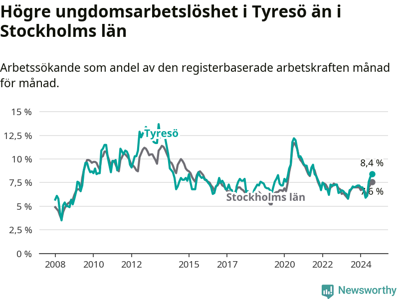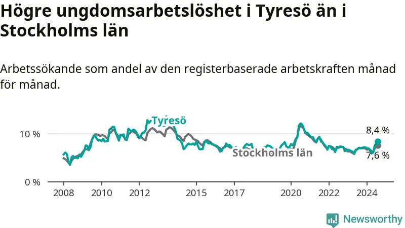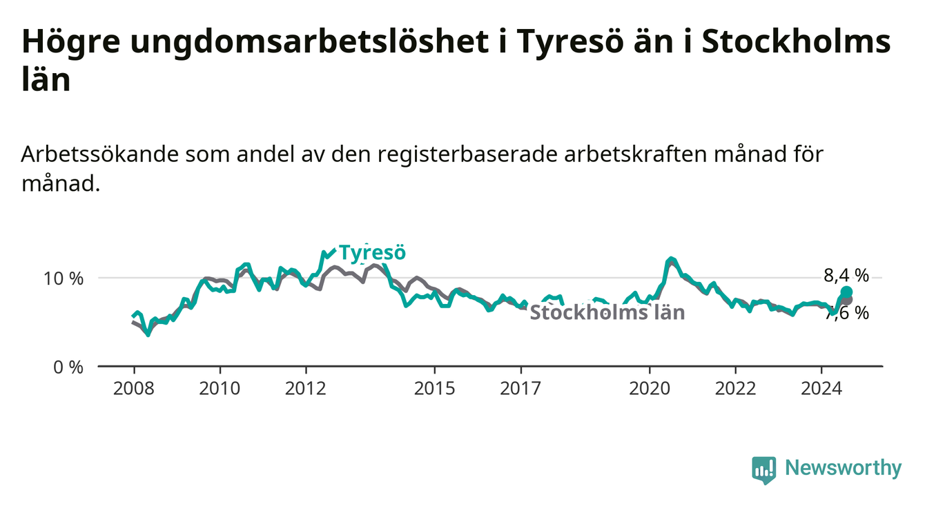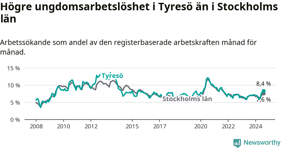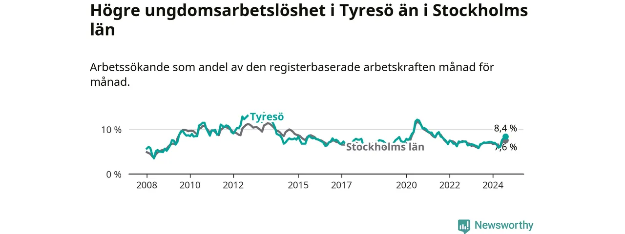 Medan Tyresö har lägre total arbetslöshet än Stockholms län, ligger ungdomsarbetslösheten 0,8 procentenheter högre i Tyresö.