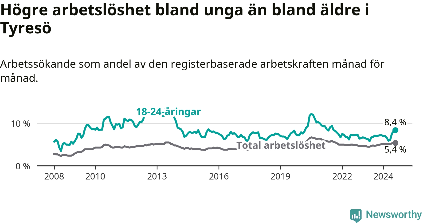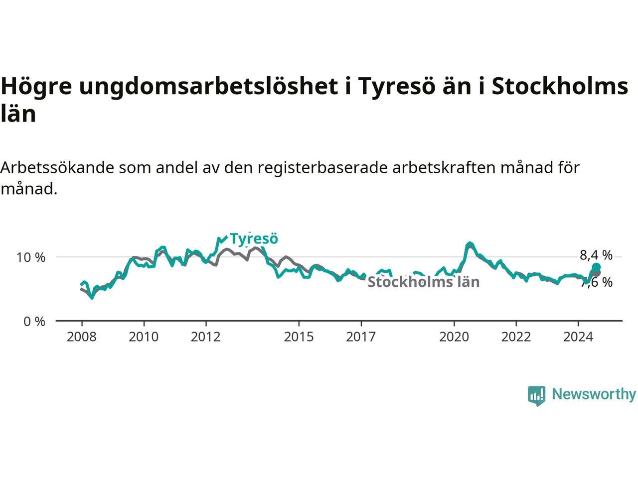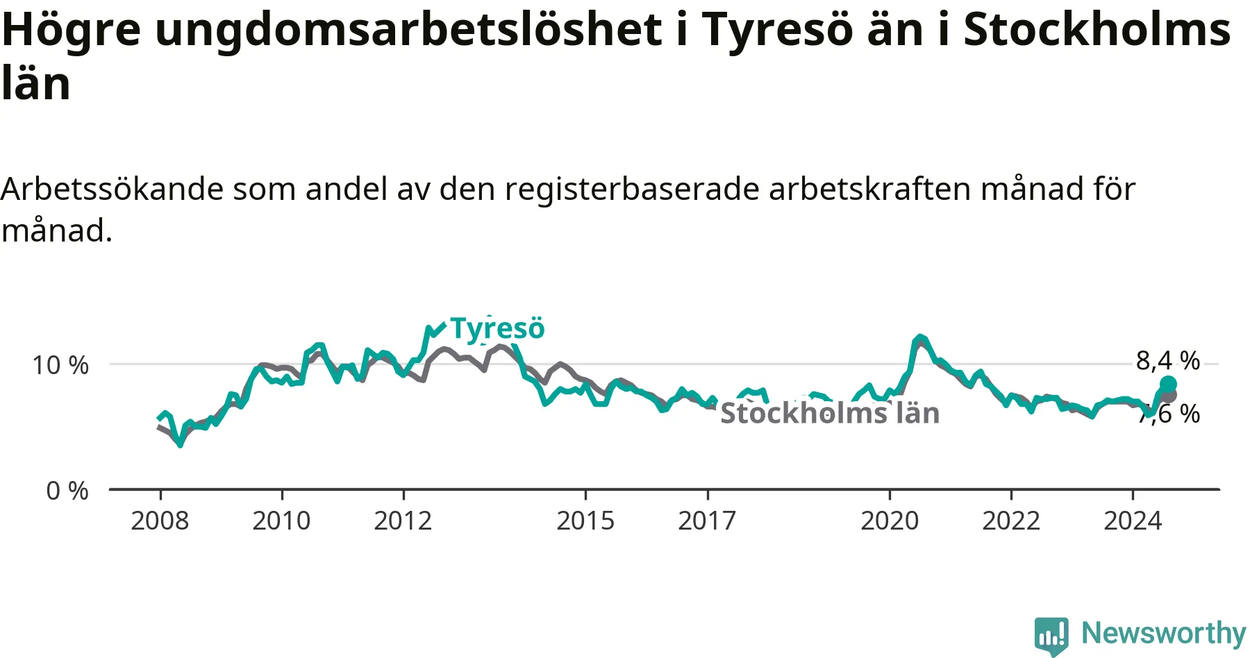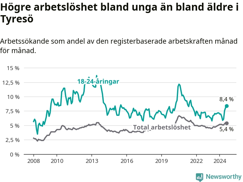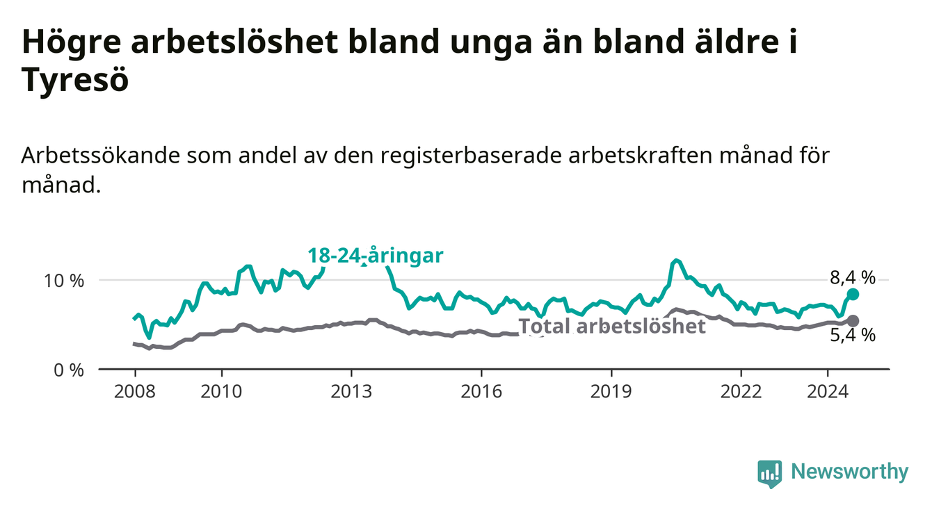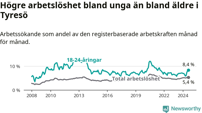 Medan Tyresö har lägre total arbetslöshet än Stockholms län, ligger ungdomsarbetslösheten 0,8 procentenheter högre i Tyresö.