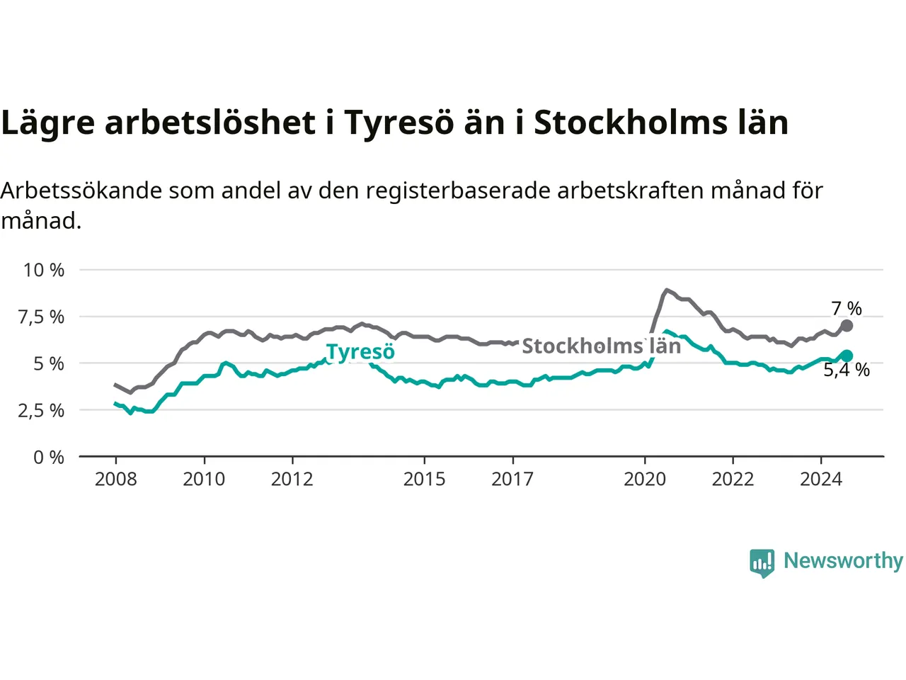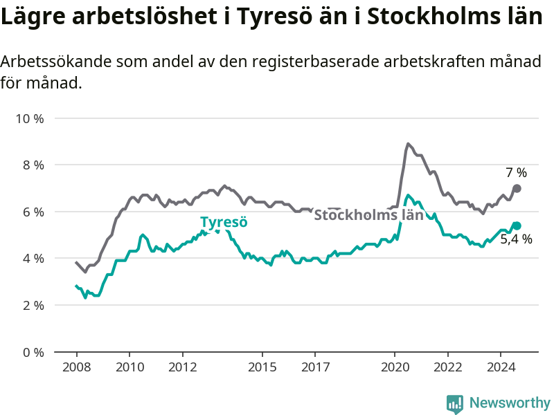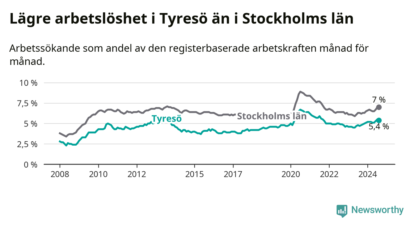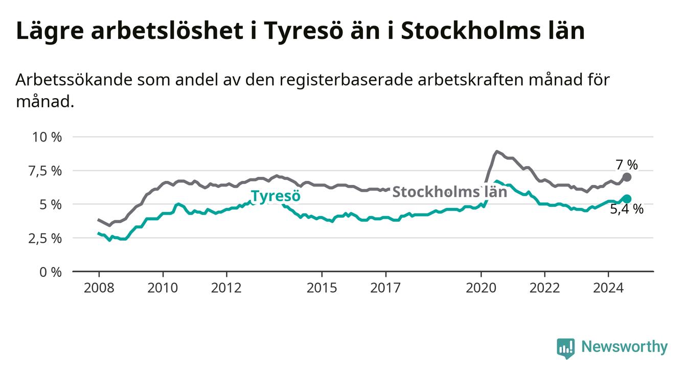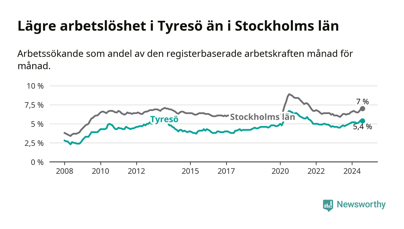 Även om arbetslösheten i Tyresö alltså ökar, så ligger den fortfarande under snittet i hela Stockholms län (5,4 procent i kommunen, jämfört med 7,0 procent i hela länet). Ekerö har den lägsta arbetslösheten i länet (3,4 procent), medan Södertälje har den högsta (11,1 procent). För att Tyresö skulle komma ner i samma arbetslöshetsnivå som Ekerö skulle 506 personer behöva sysselsättas.