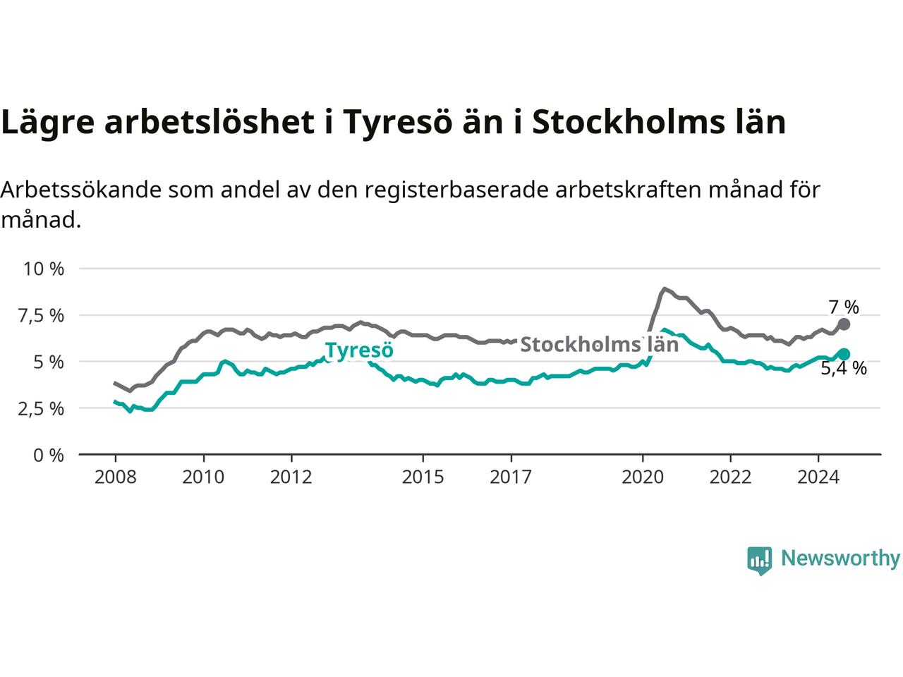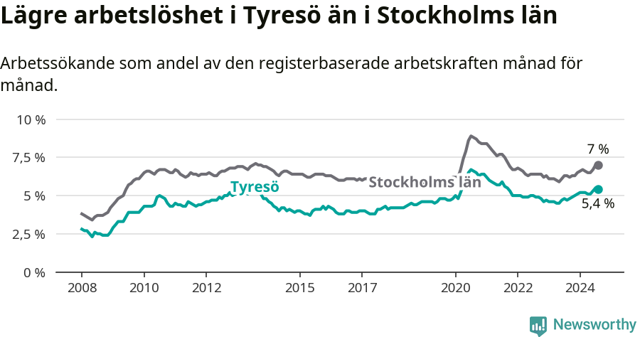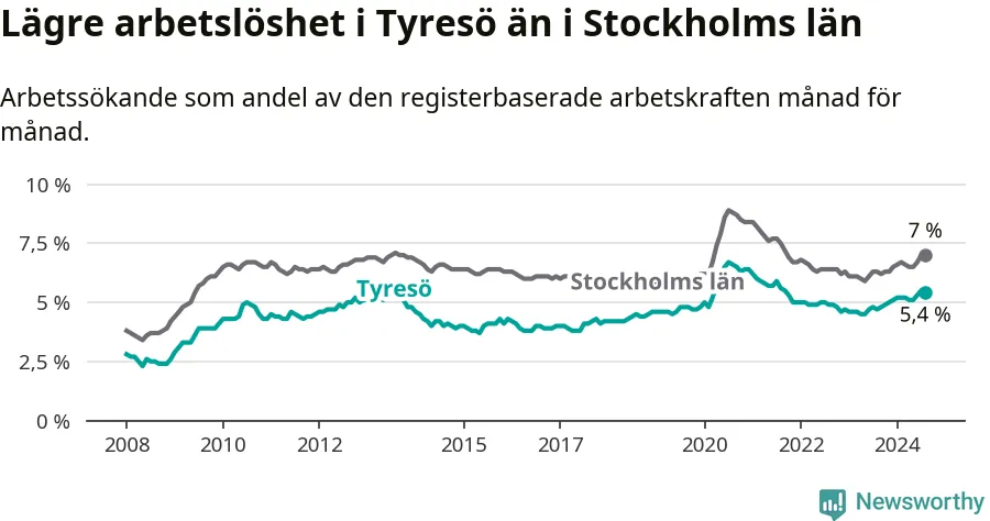 Under augusti månad rapporterade Tyresö kommun en total arbetslöshet på 5,4 procent. Det är en ökning jämfört med samma tidpunkt i fjol (+0,7 procentenheter). Även i Stockholms län stiger arbetslösheten .