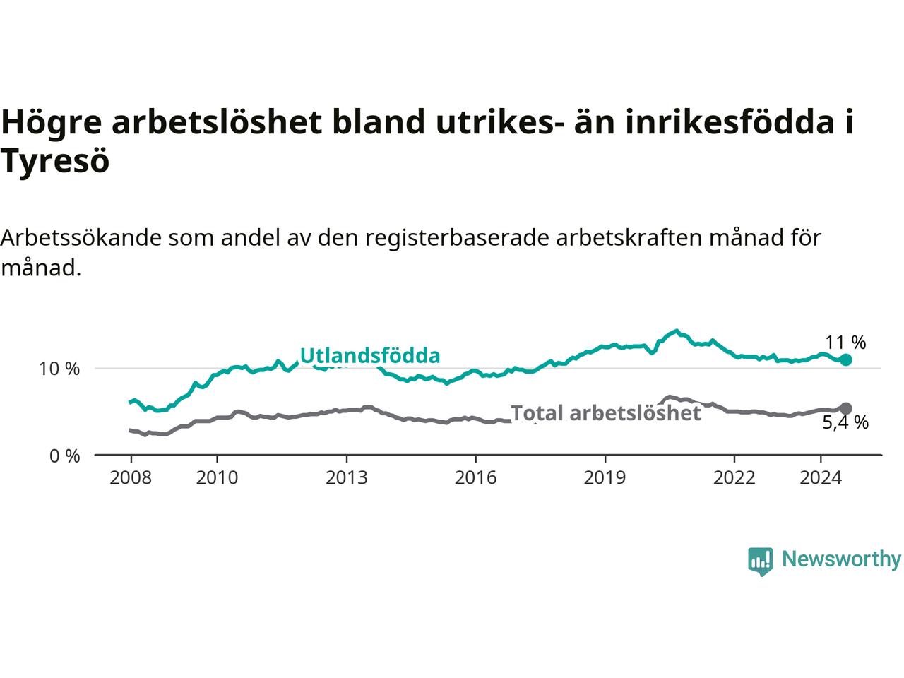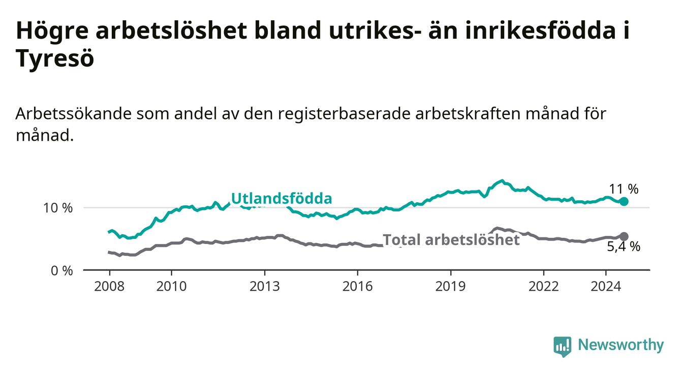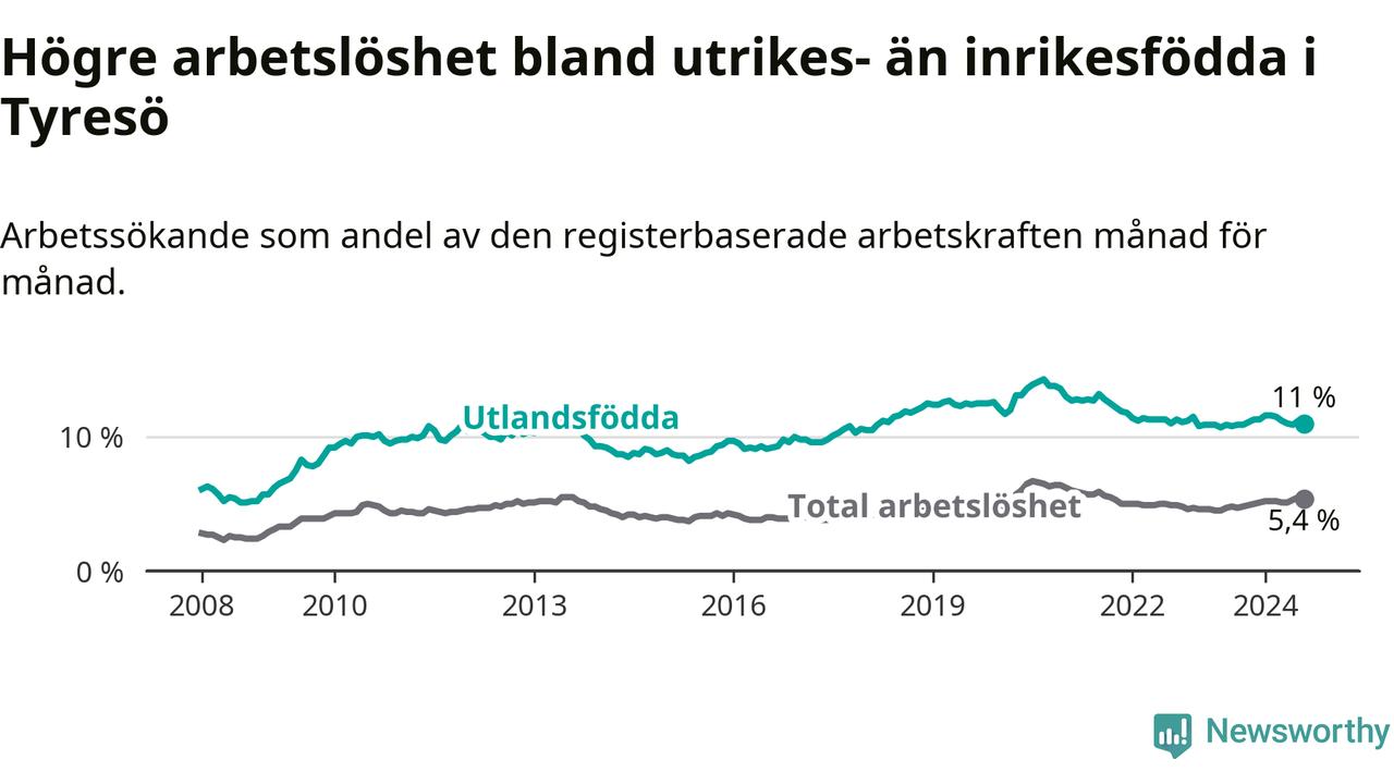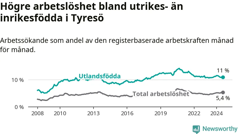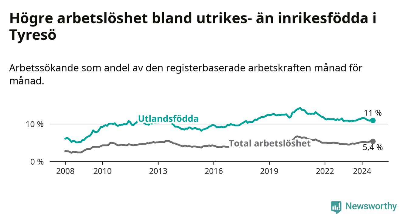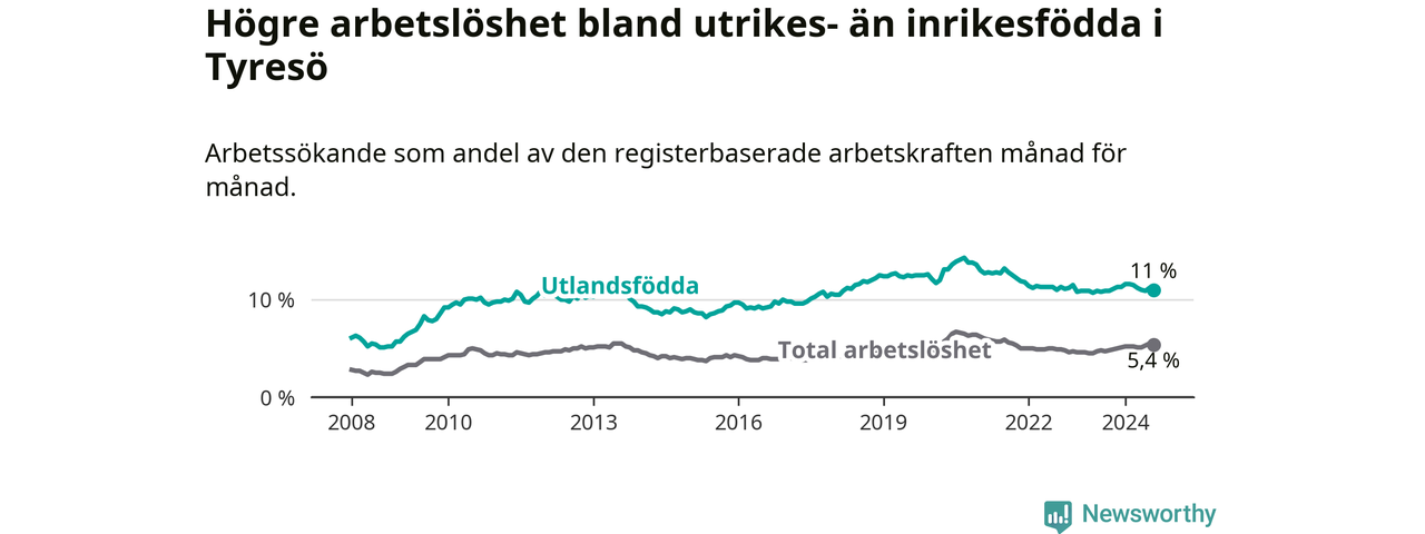 Skillnaden i arbetslöshet mellan utrikesfödda och hela befolkningen är 5,6 procentenheter i Tyresö. Det är en mindre skillnad än för ett år sedan (−0,6 procentenheter).