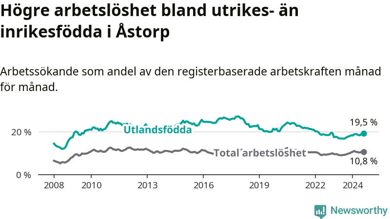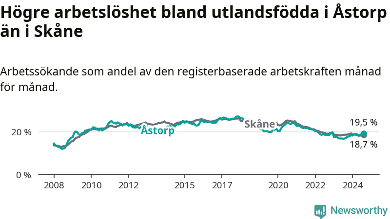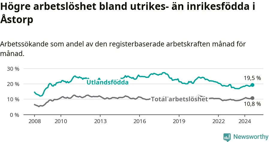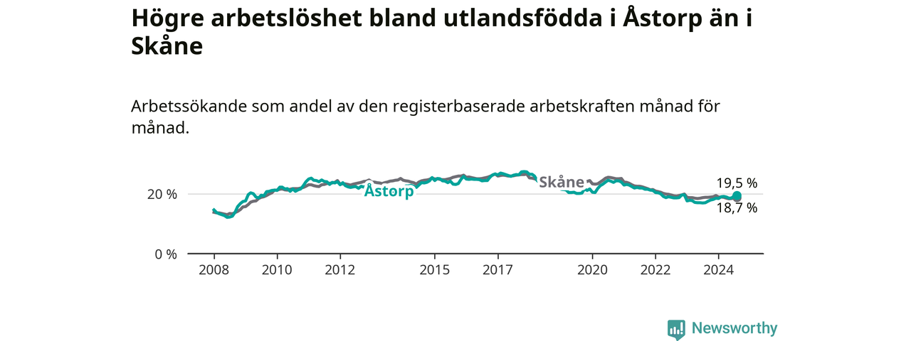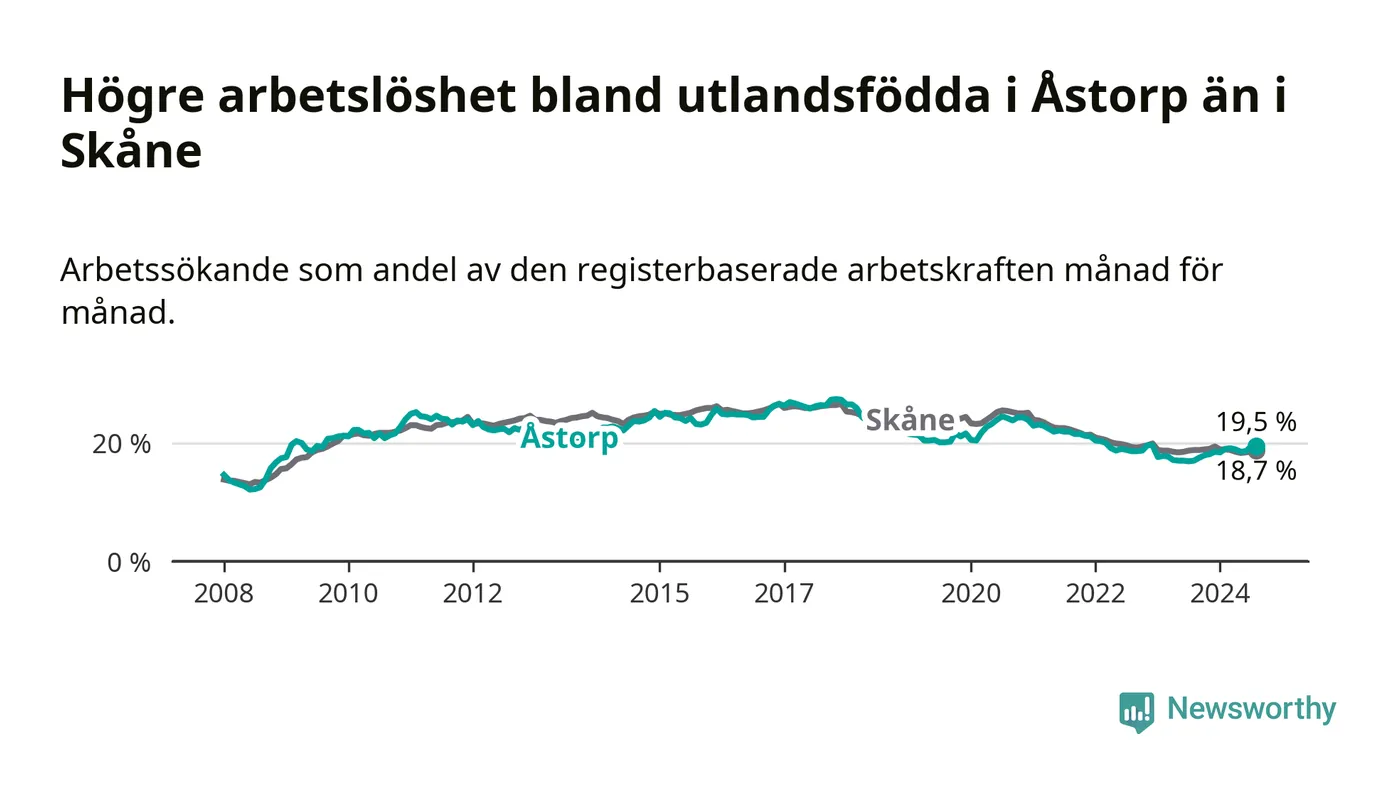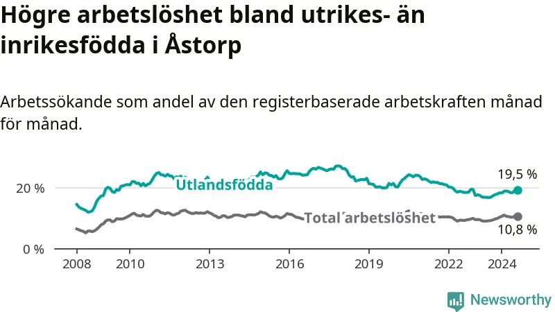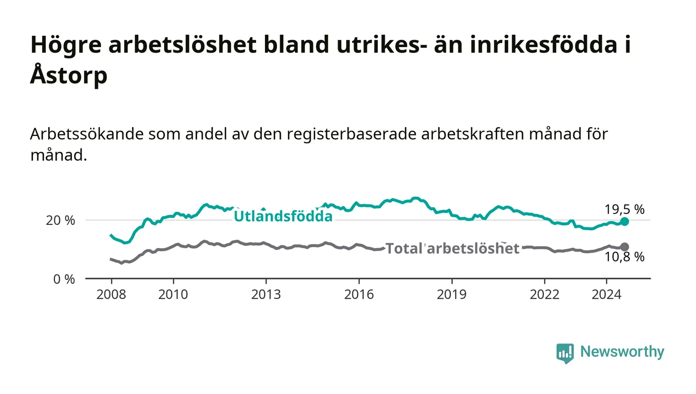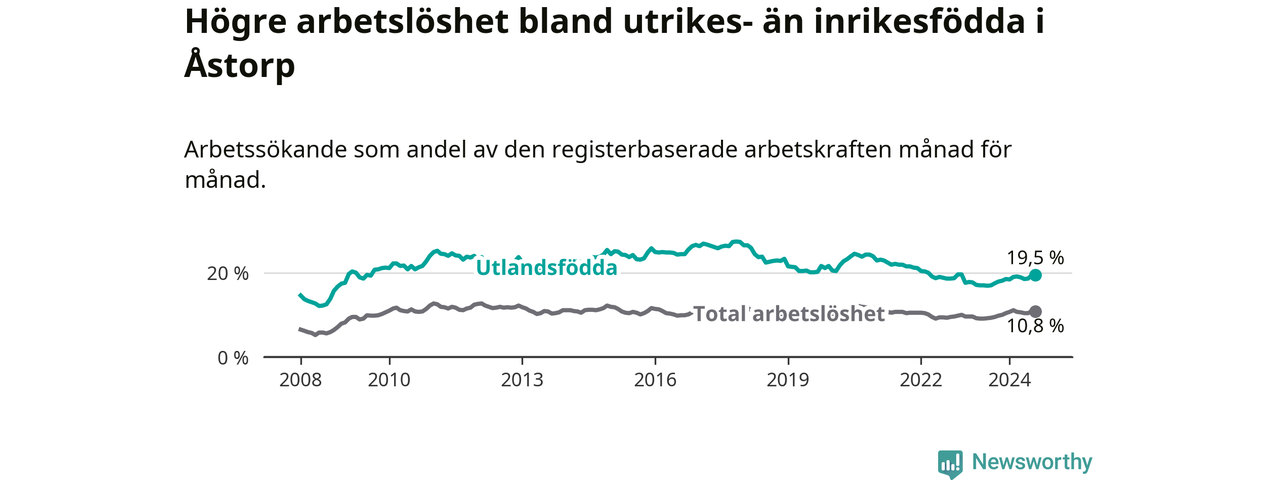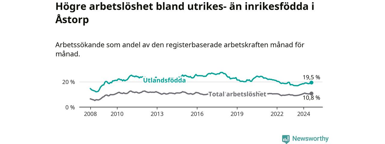 Arbetslösheten bland utlandsfödda var 19,5 procent i Åstorp under augusti månad, motsvarande 535 av 2 744 personer. Det är 2,5 procentenheter fler än vid samma tidpunkt i fjol (+93 om man räknar personer). Därmed är de utlandsföddas arbetslöshet högre än vid samma tidpunkt i fjol för åttonde månaden i följd. Sedan december 2023 har arbetslösheten bland utlandsfödda ökat från 18,5 till 19,5 procent.