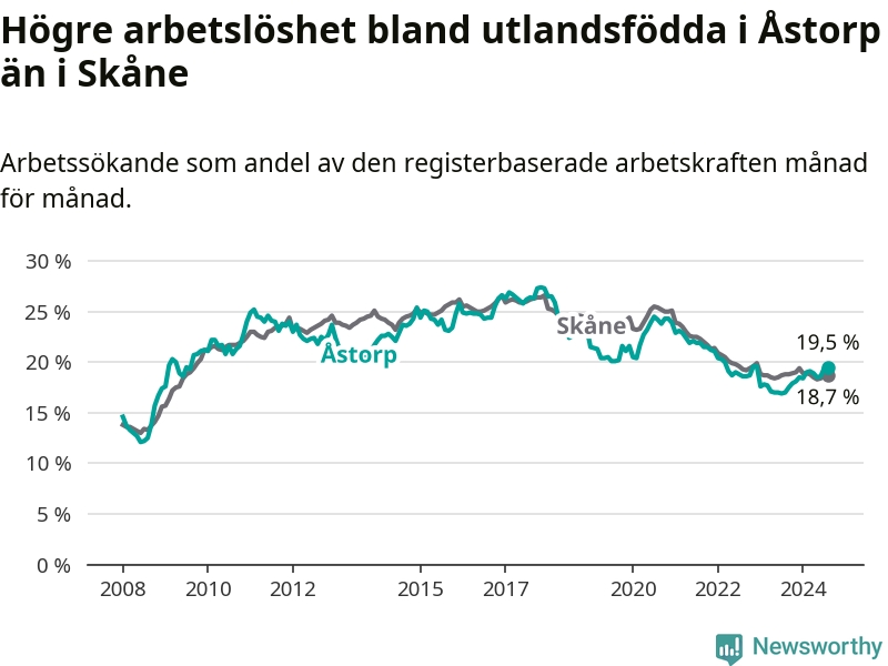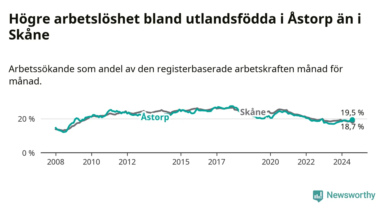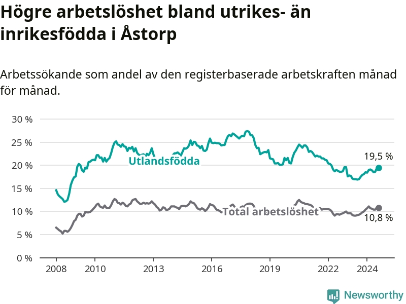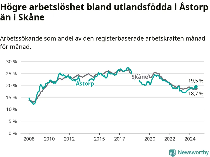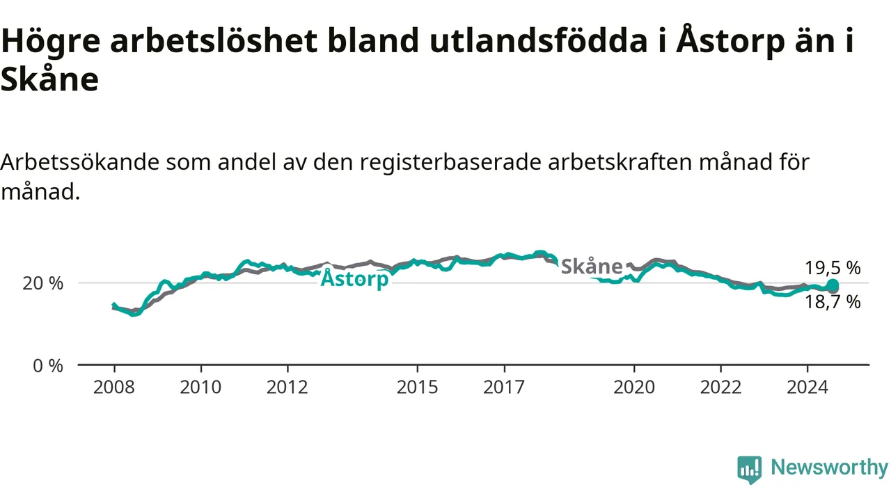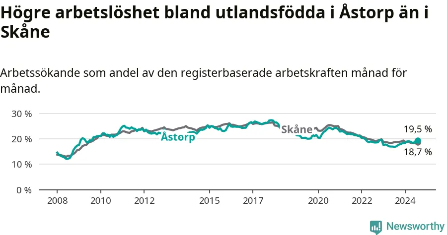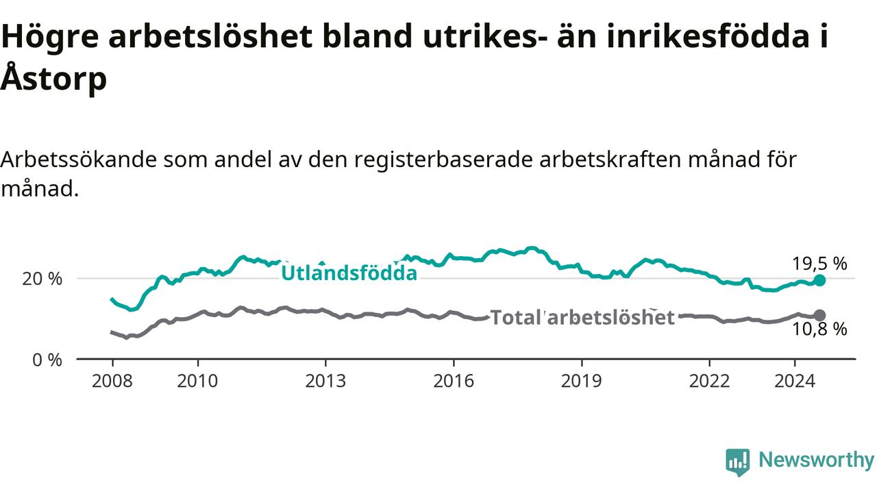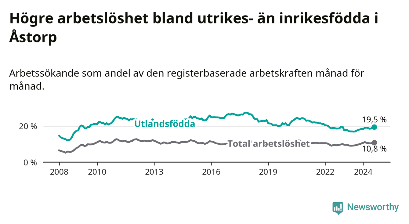 Arbetslösheten bland utlandsfödda var 19,5 procent i Åstorp under augusti månad, motsvarande 535 av 2 744 personer. Det är 2,5 procentenheter fler än vid samma tidpunkt i fjol (+93 om man räknar personer). Därmed är de utlandsföddas arbetslöshet högre än vid samma tidpunkt i fjol för åttonde månaden i följd. Sedan december 2023 har arbetslösheten bland utlandsfödda ökat från 18,5 till 19,5 procent.