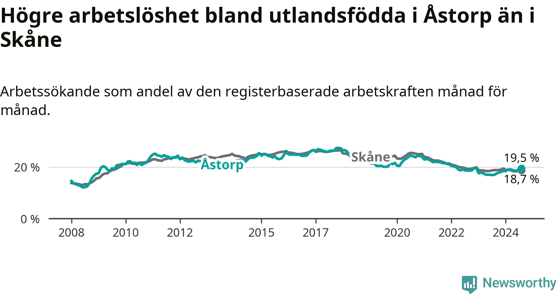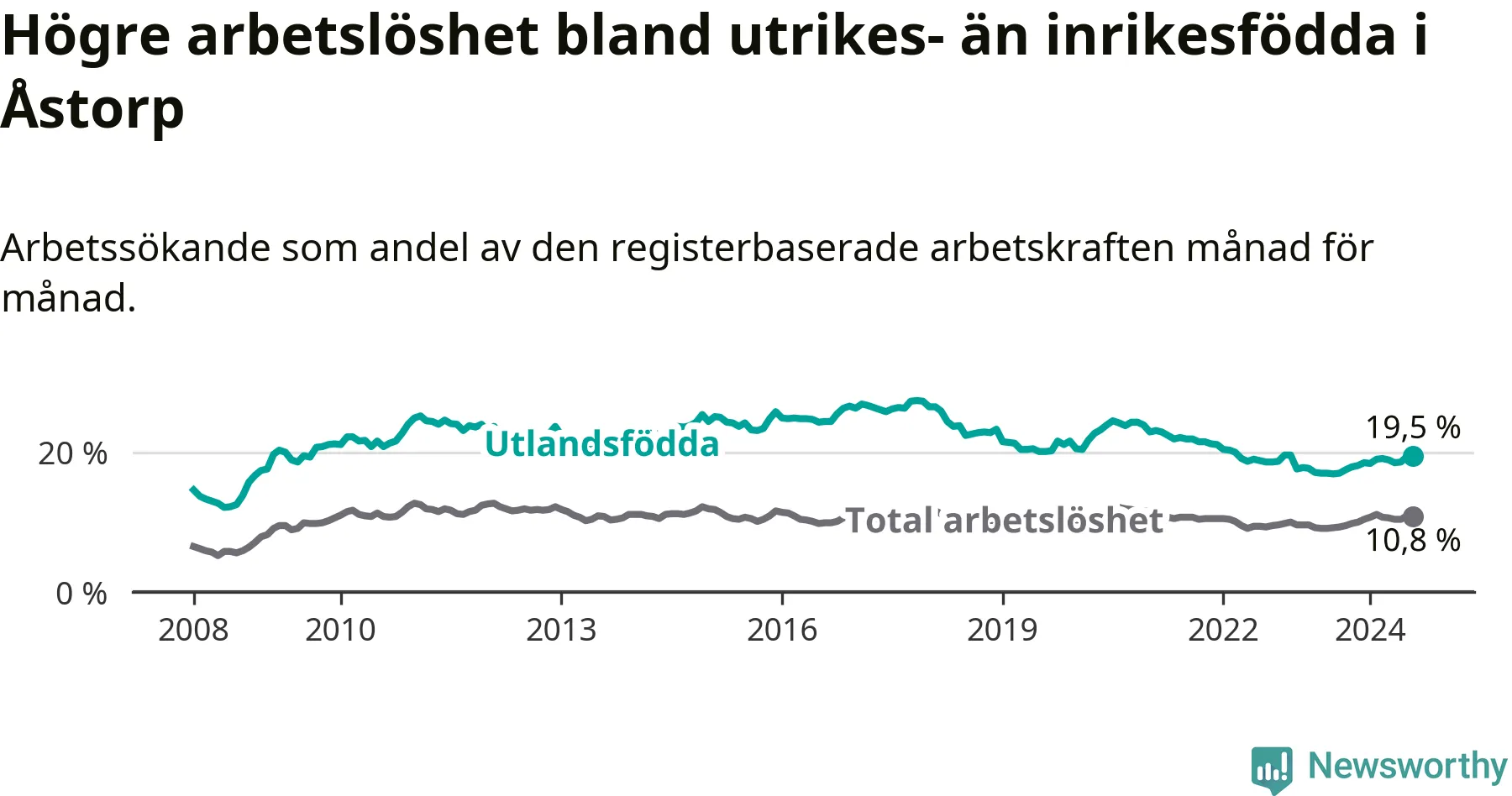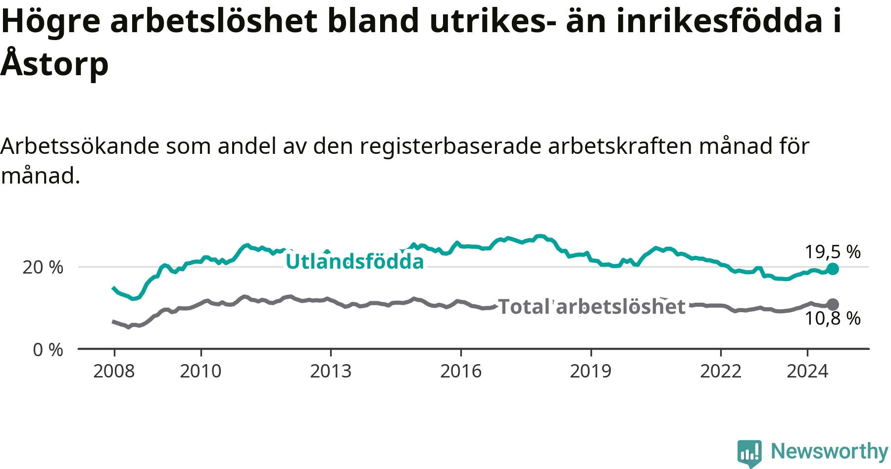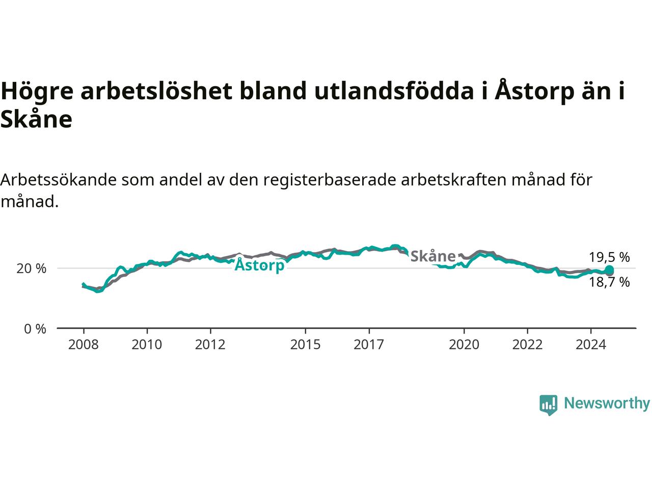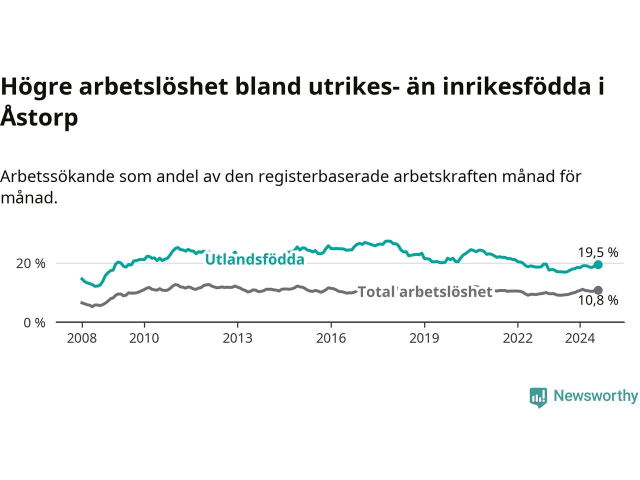 Arbetslösheten bland utlandsfödda var 19,5 procent i Åstorp under augusti månad, motsvarande 535 av 2 744 personer. Det är 2,5 procentenheter fler än vid samma tidpunkt i fjol (+93 om man räknar personer). Därmed är de utlandsföddas arbetslöshet högre än vid samma tidpunkt i fjol för åttonde månaden i följd. Sedan december 2023 har arbetslösheten bland utlandsfödda ökat från 18,5 till 19,5 procent.