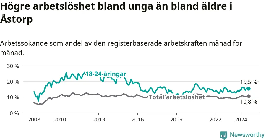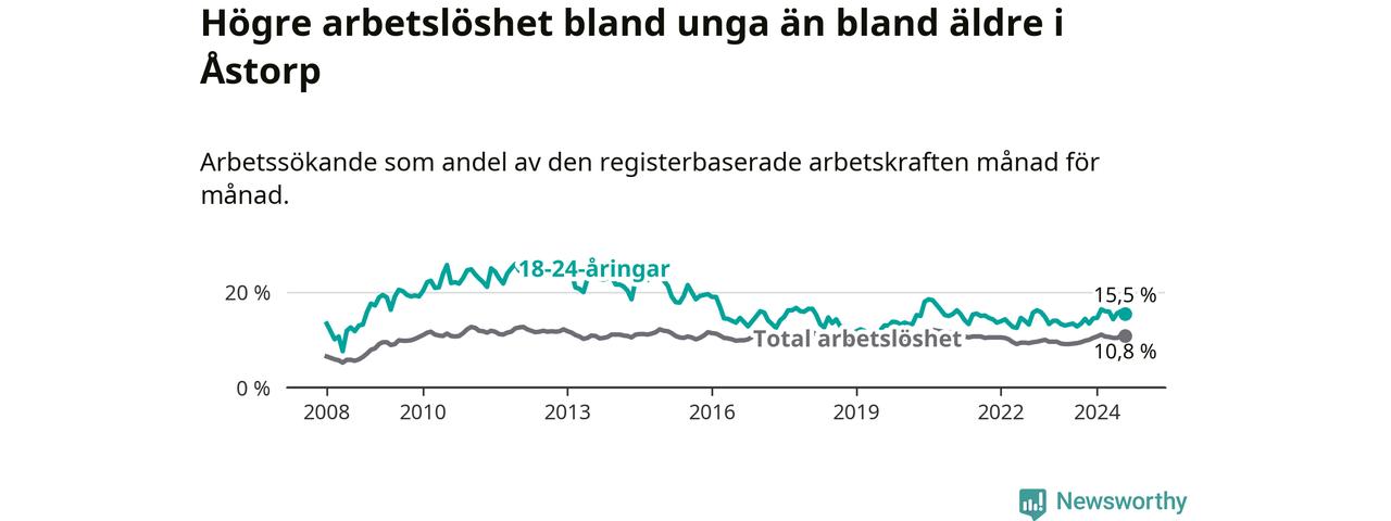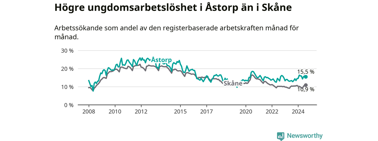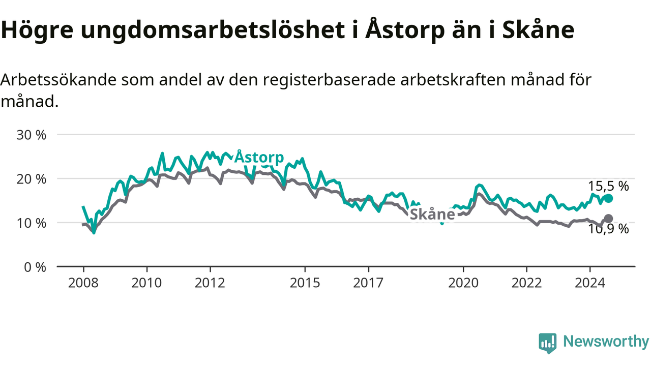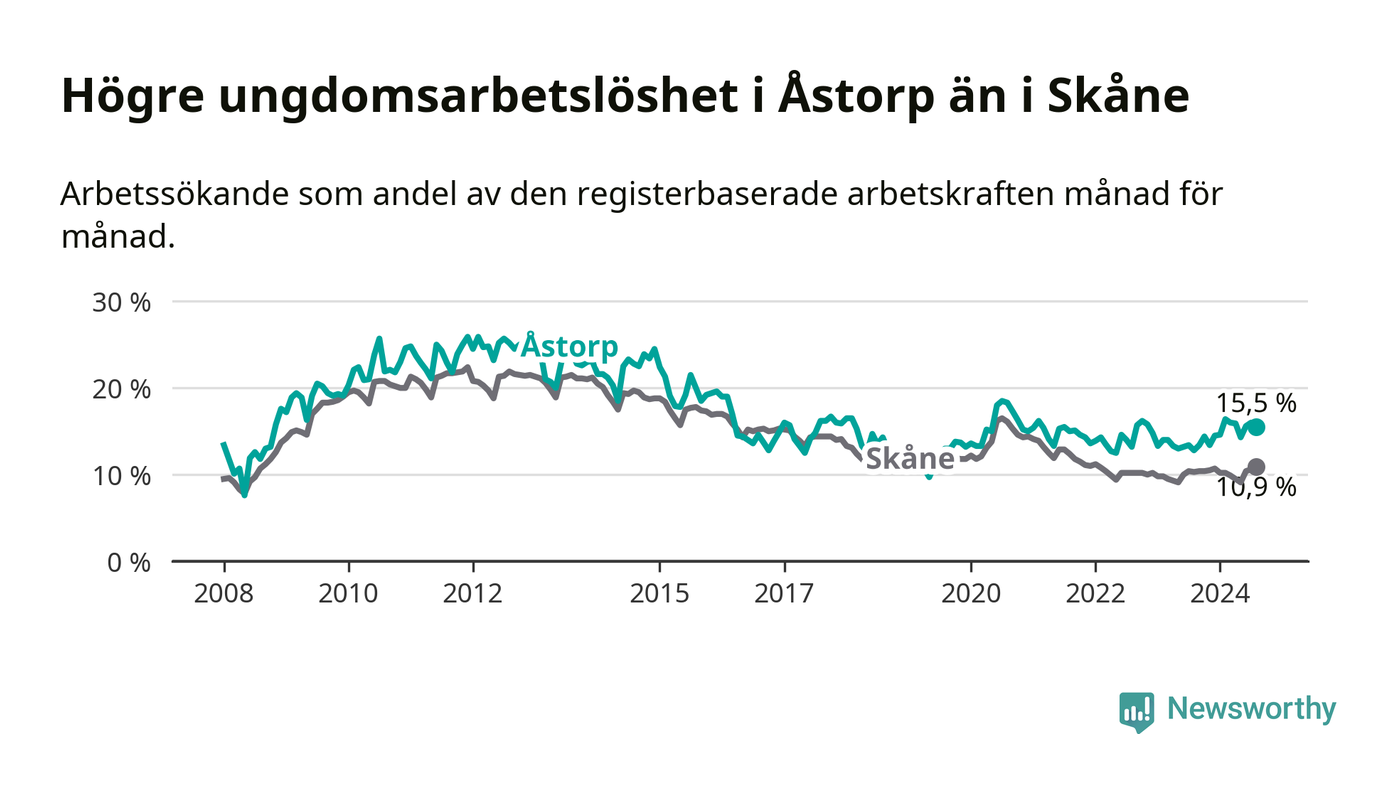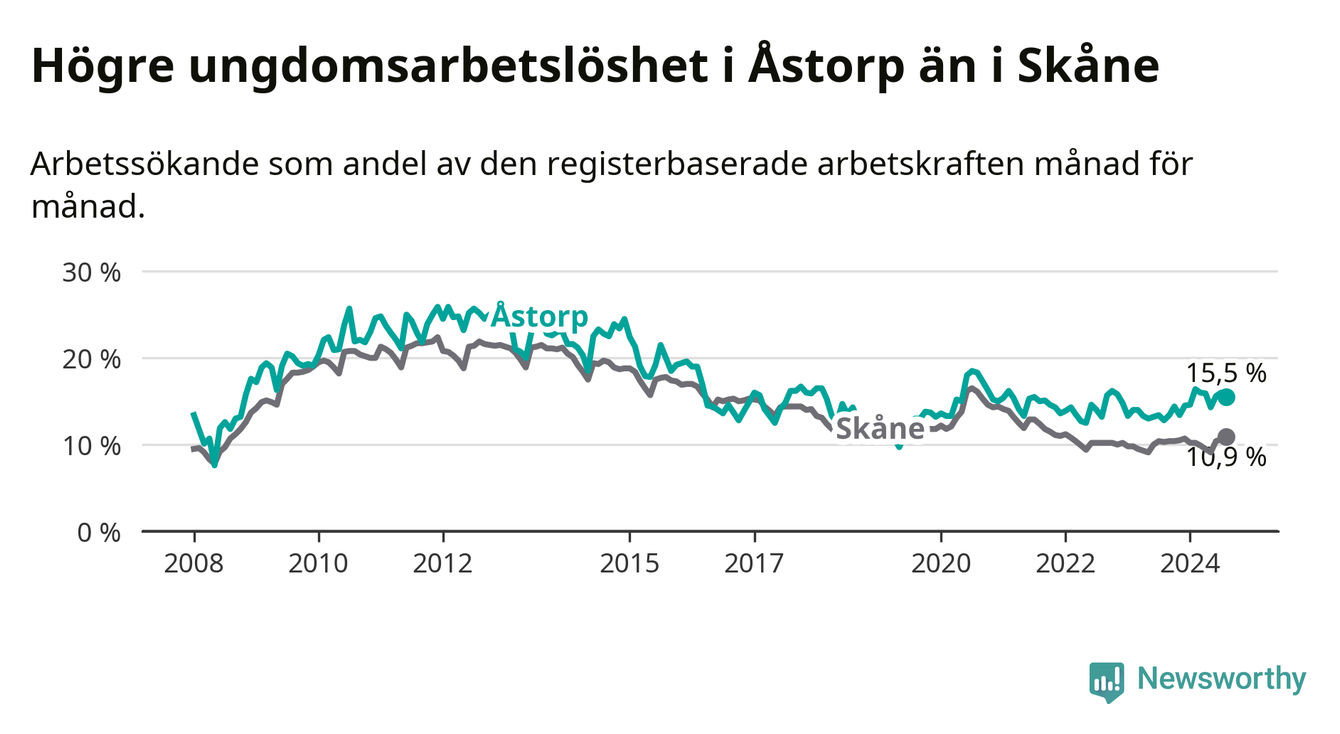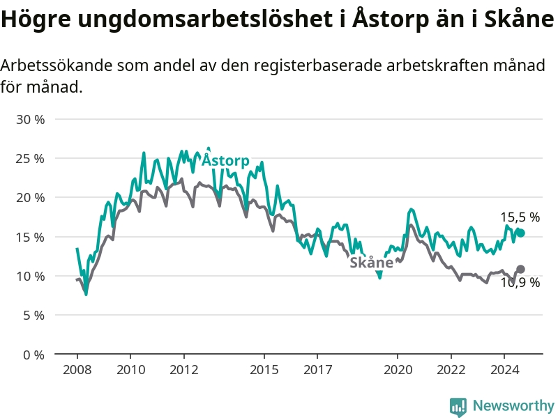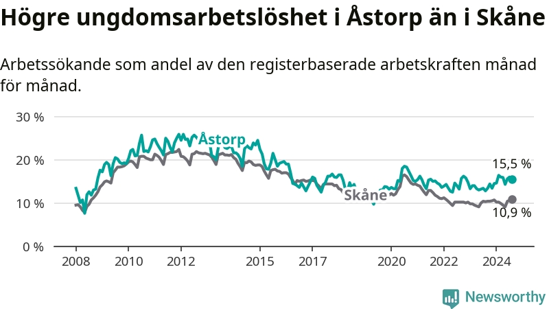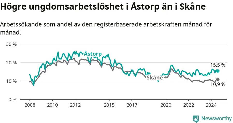 Precis som den totala arbetslösheten ligger ungdomsarbetslösheten i Åstorp högre än i Skåne som helhet. Skillnaden mellan kommunen och länet är 4,6 procentenheter.