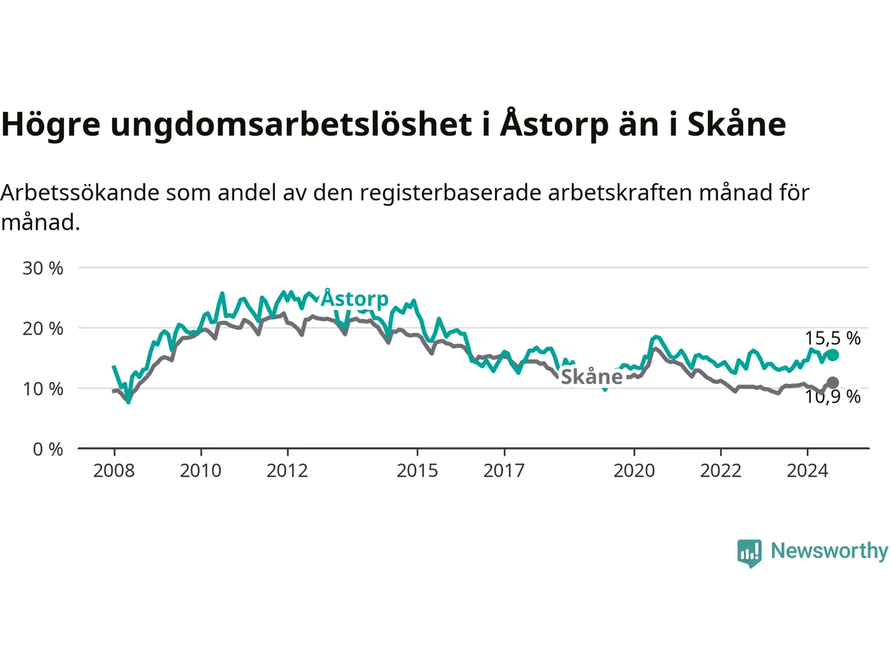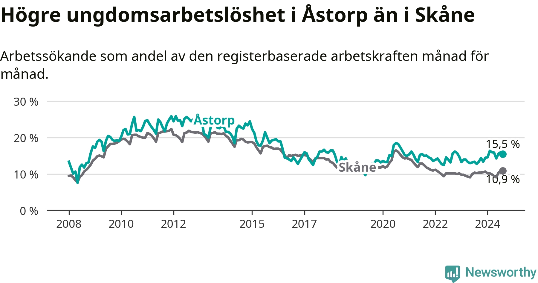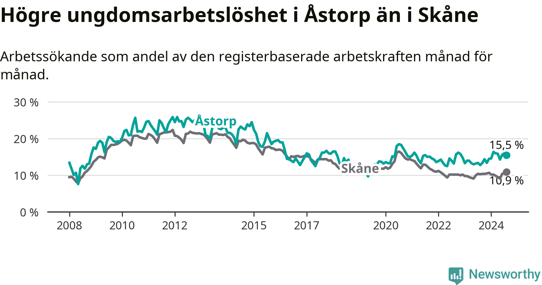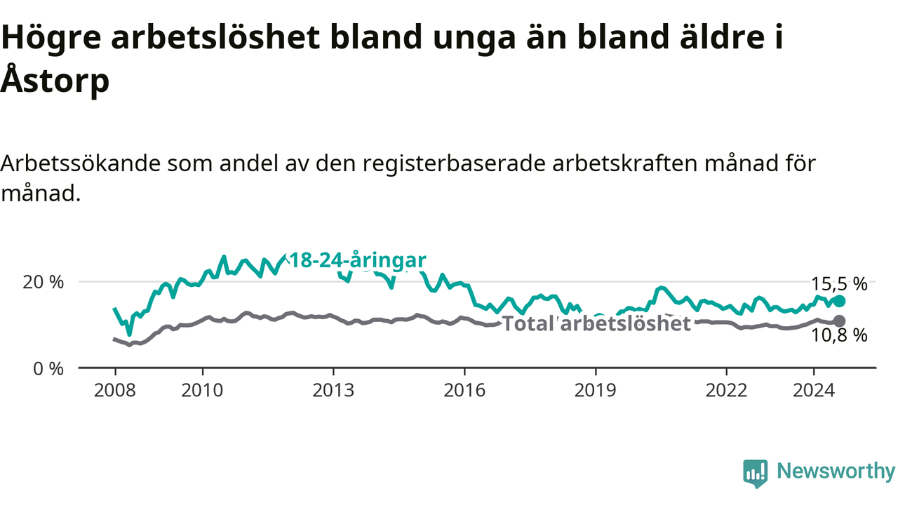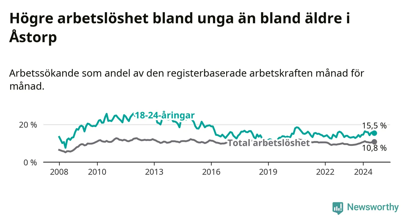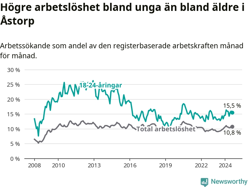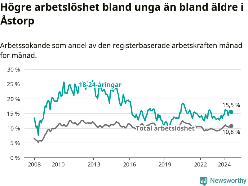 Precis som den totala arbetslösheten ligger ungdomsarbetslösheten i Åstorp högre än i Skåne som helhet. Skillnaden mellan kommunen och länet är 4,6 procentenheter.