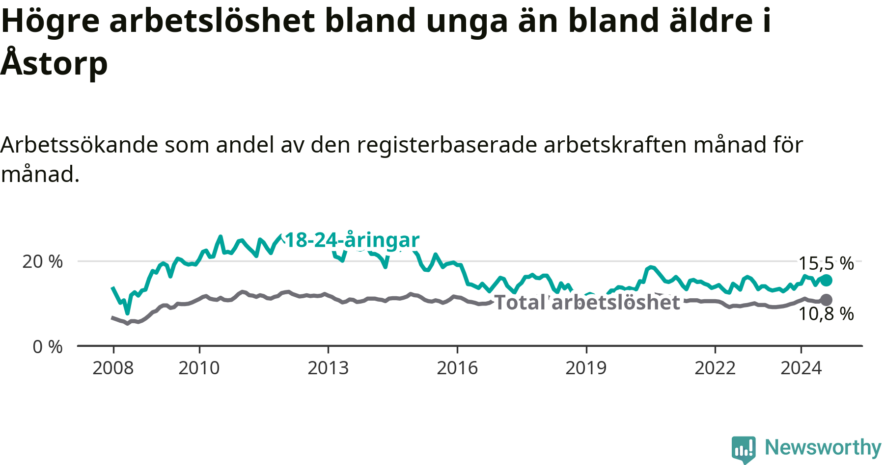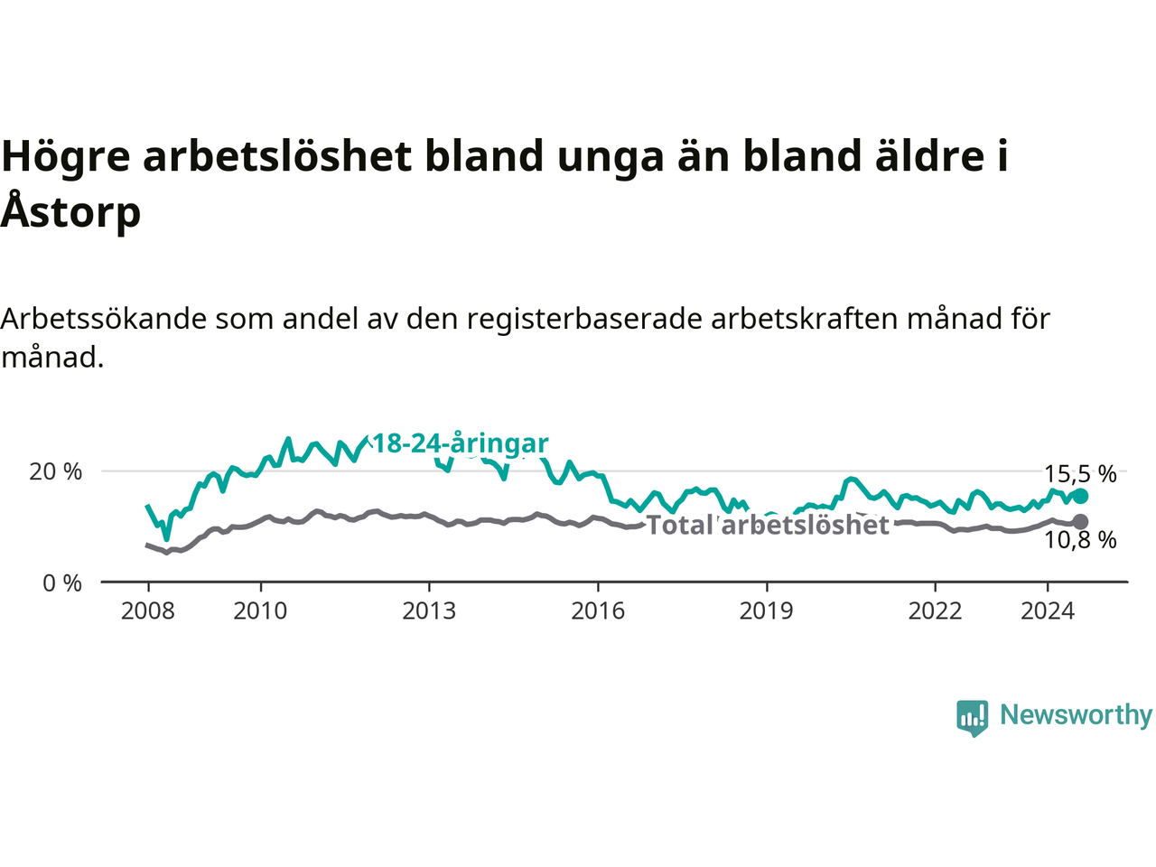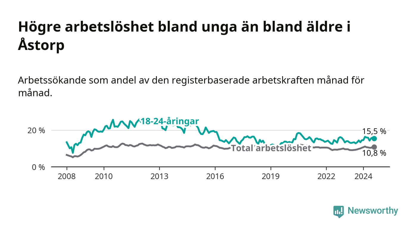 I och med den senaste månadens uppgång har de ungas arbetslöshet i Åstorp stigit åtta månader i följd (upp från 14,5 procent i december 2023 till 15,5 procent nu).