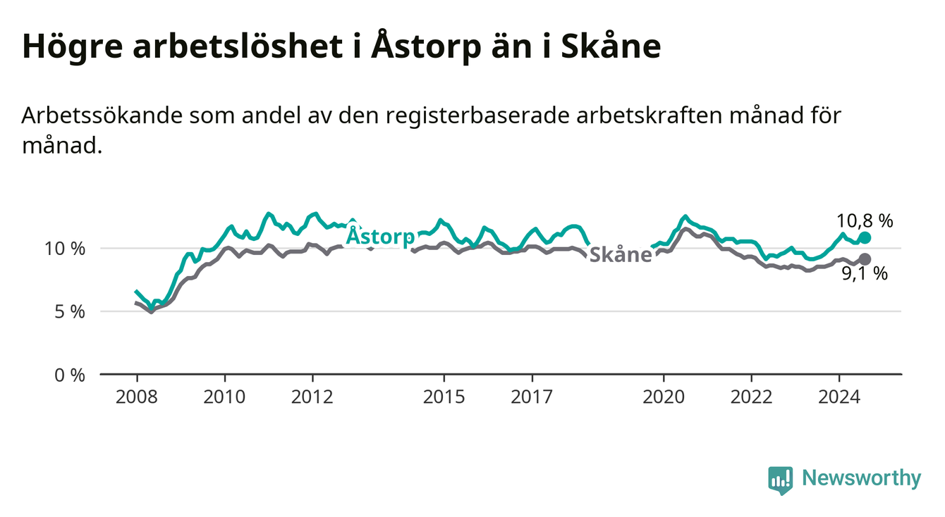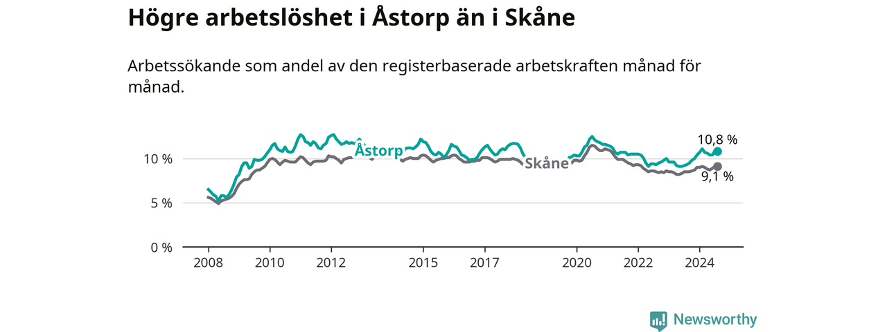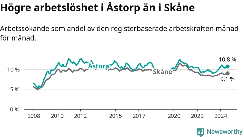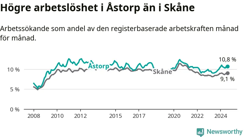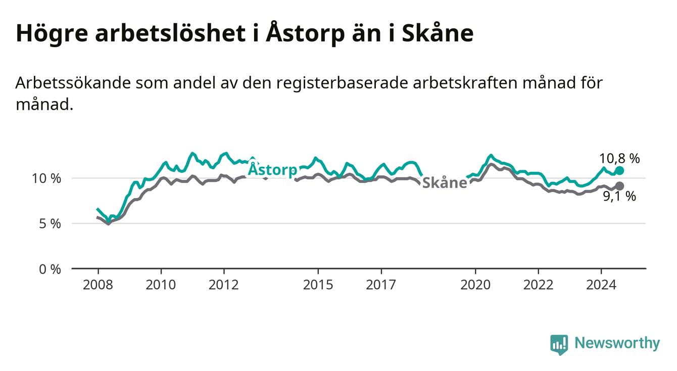 Det är elfte månaden i följd som arbetslösheten i Åstorp är högre än den var under samma tidpunkt året innan. Sedan september 2023 har arbetslösheten gått upp från 9,5 till 10,8 procent.