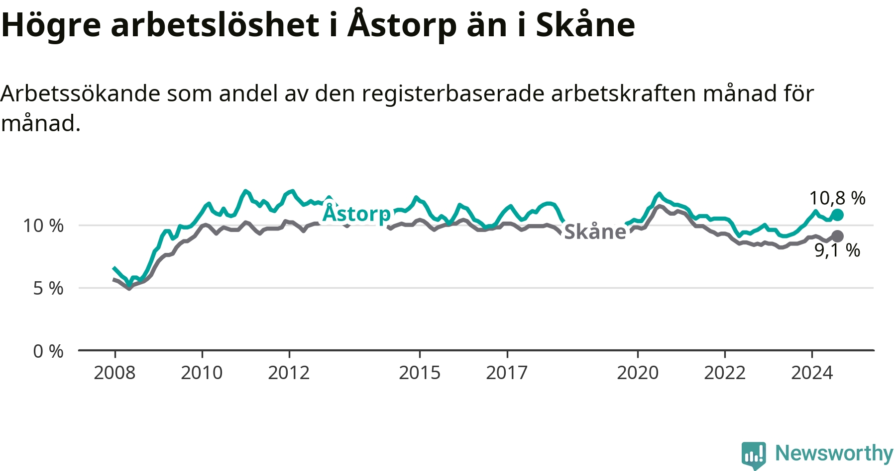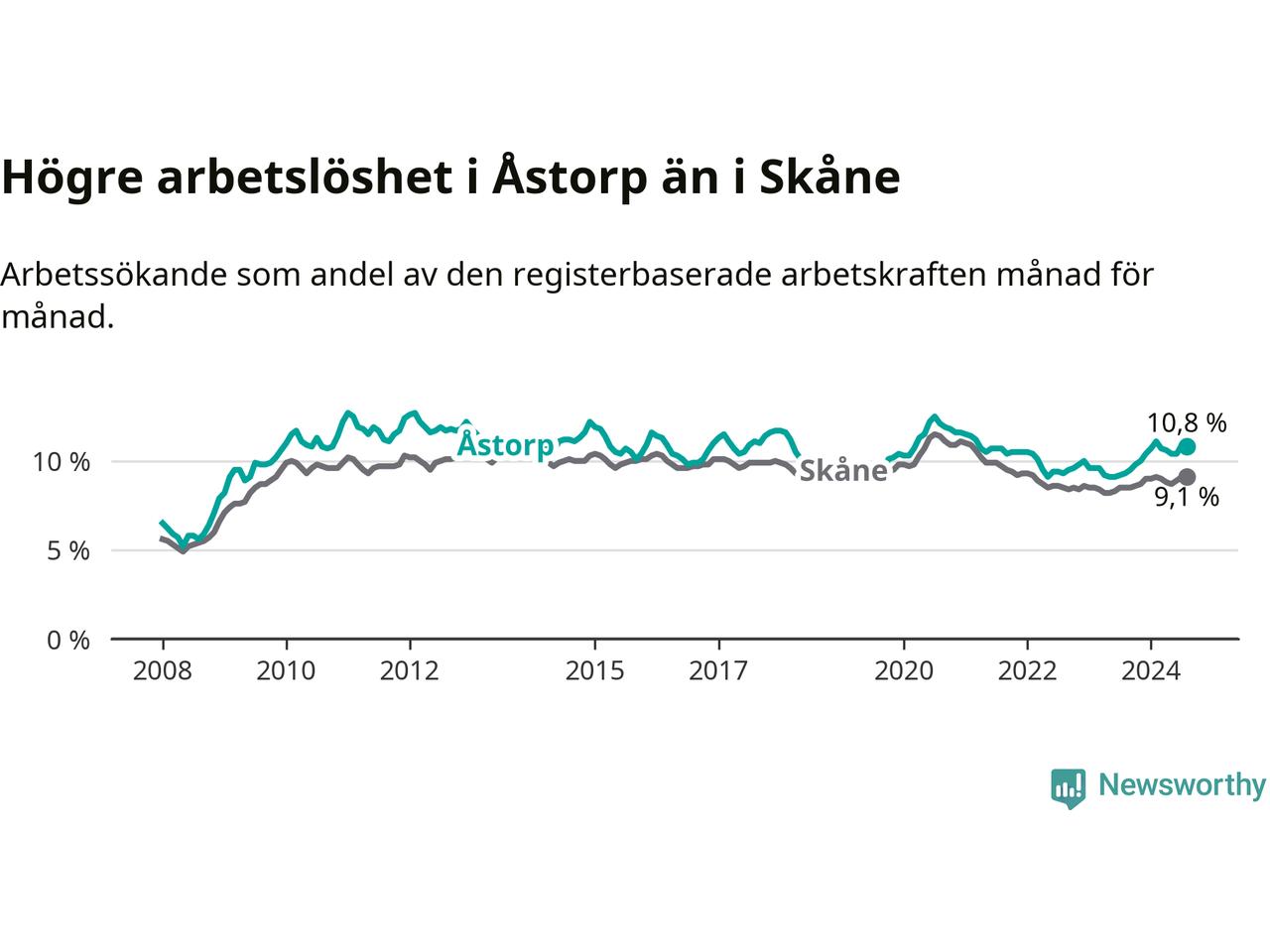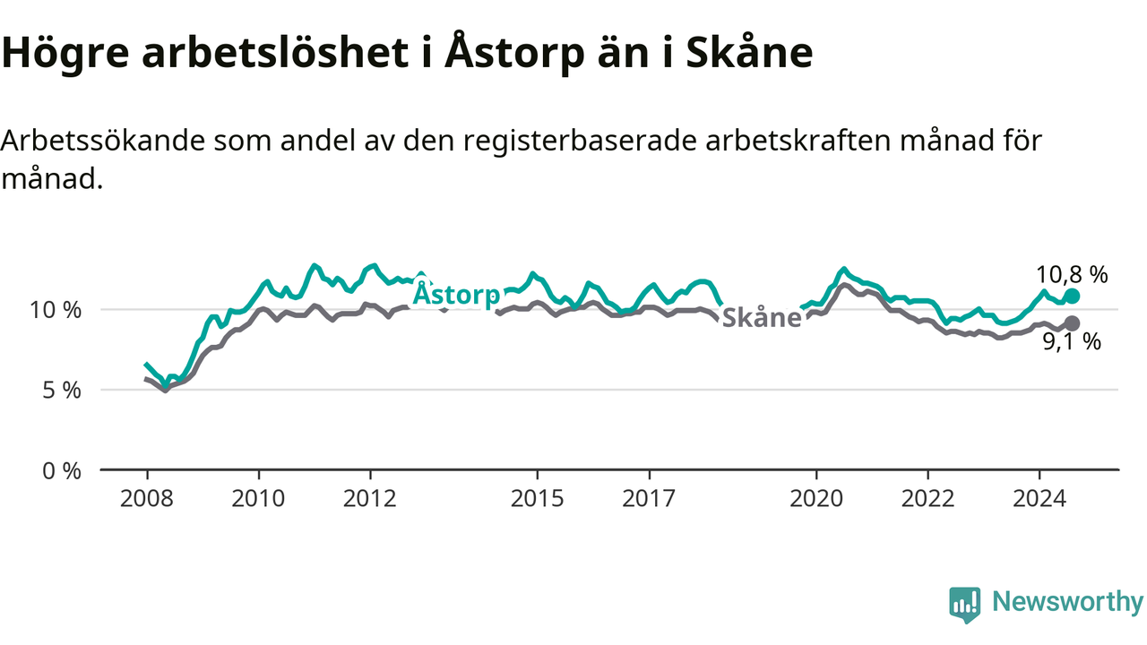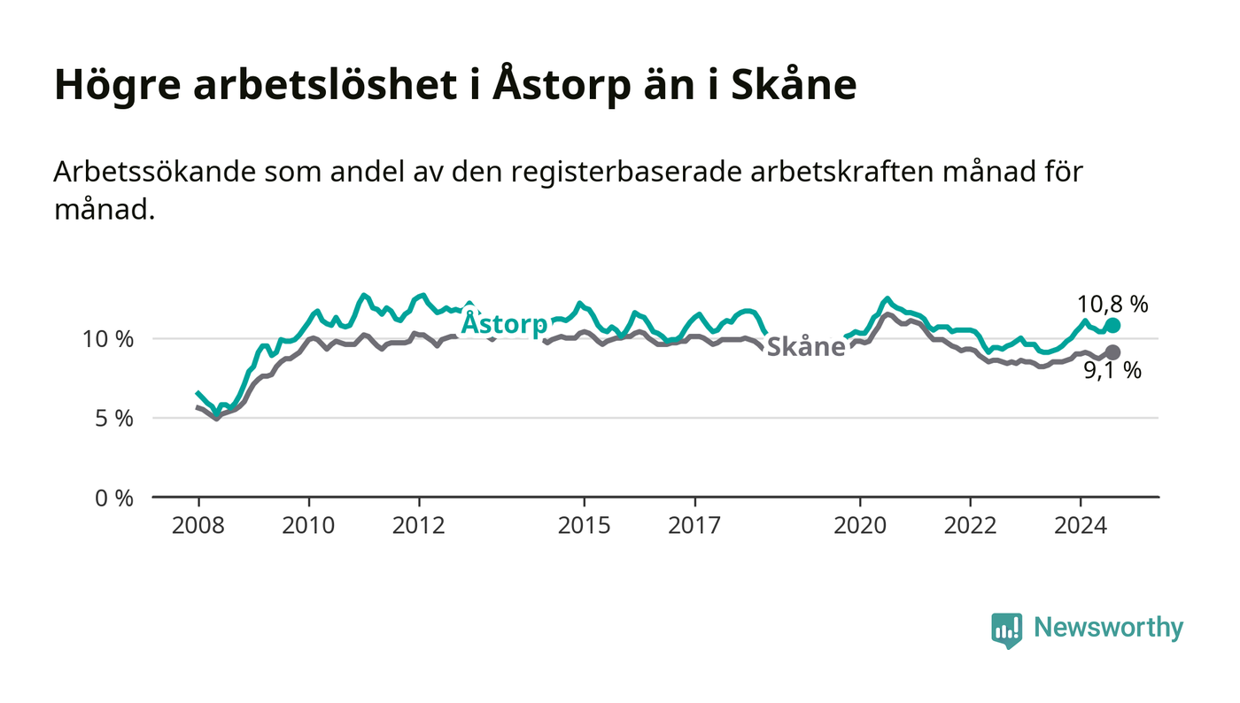Det är elfte månaden i följd som arbetslösheten i Åstorp är högre än den var under samma tidpunkt året innan. Sedan september 2023 har arbetslösheten gått upp från 9,5 till 10,8 procent.