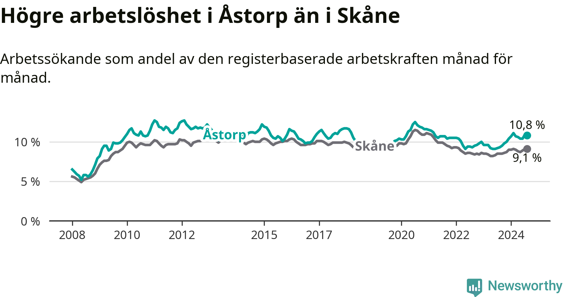 Under augusti månad rapporterade Åstorps kommun en total arbetslöshet på 10,8 procent. Det är en ökning jämfört med samma tidpunkt i fjol (+1,5 procentenheter). Även i Skåne län stiger arbetslösheten .