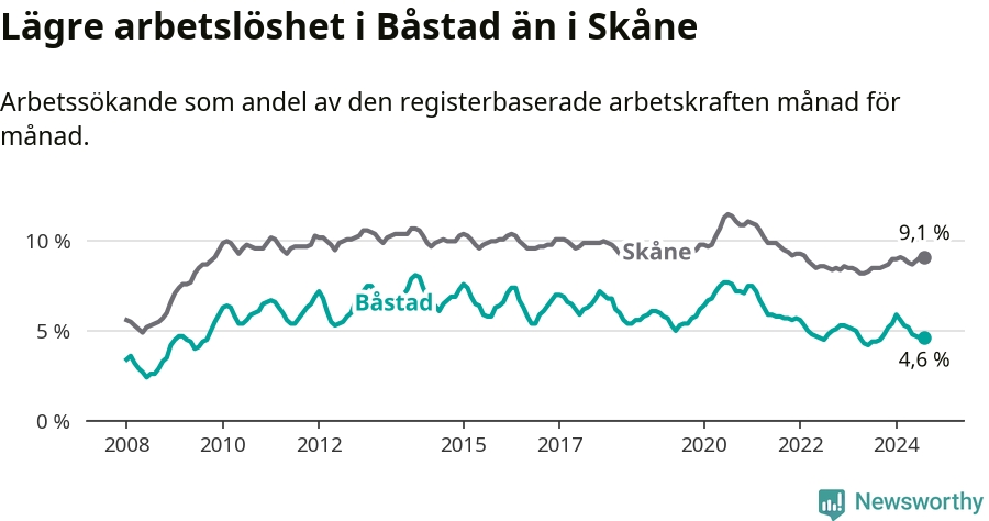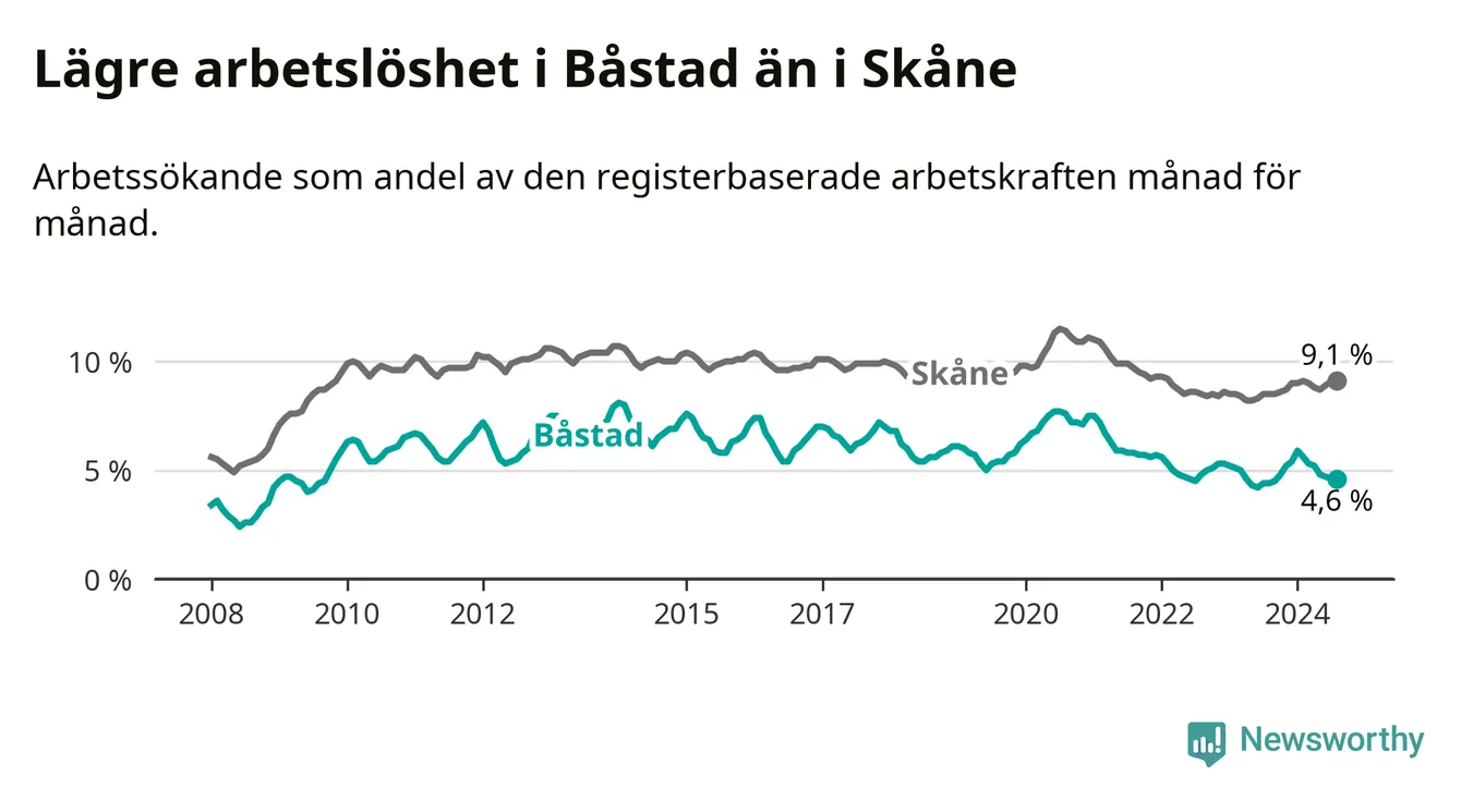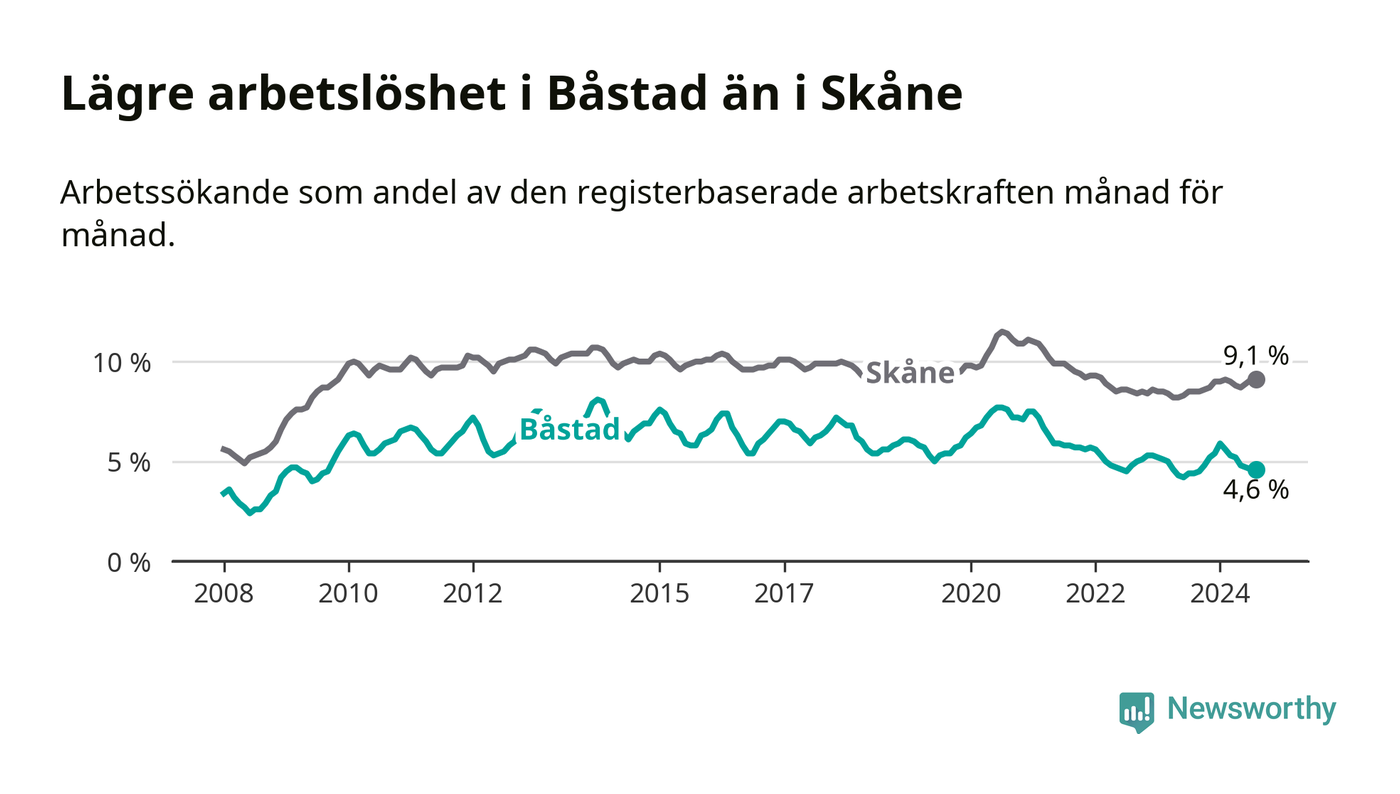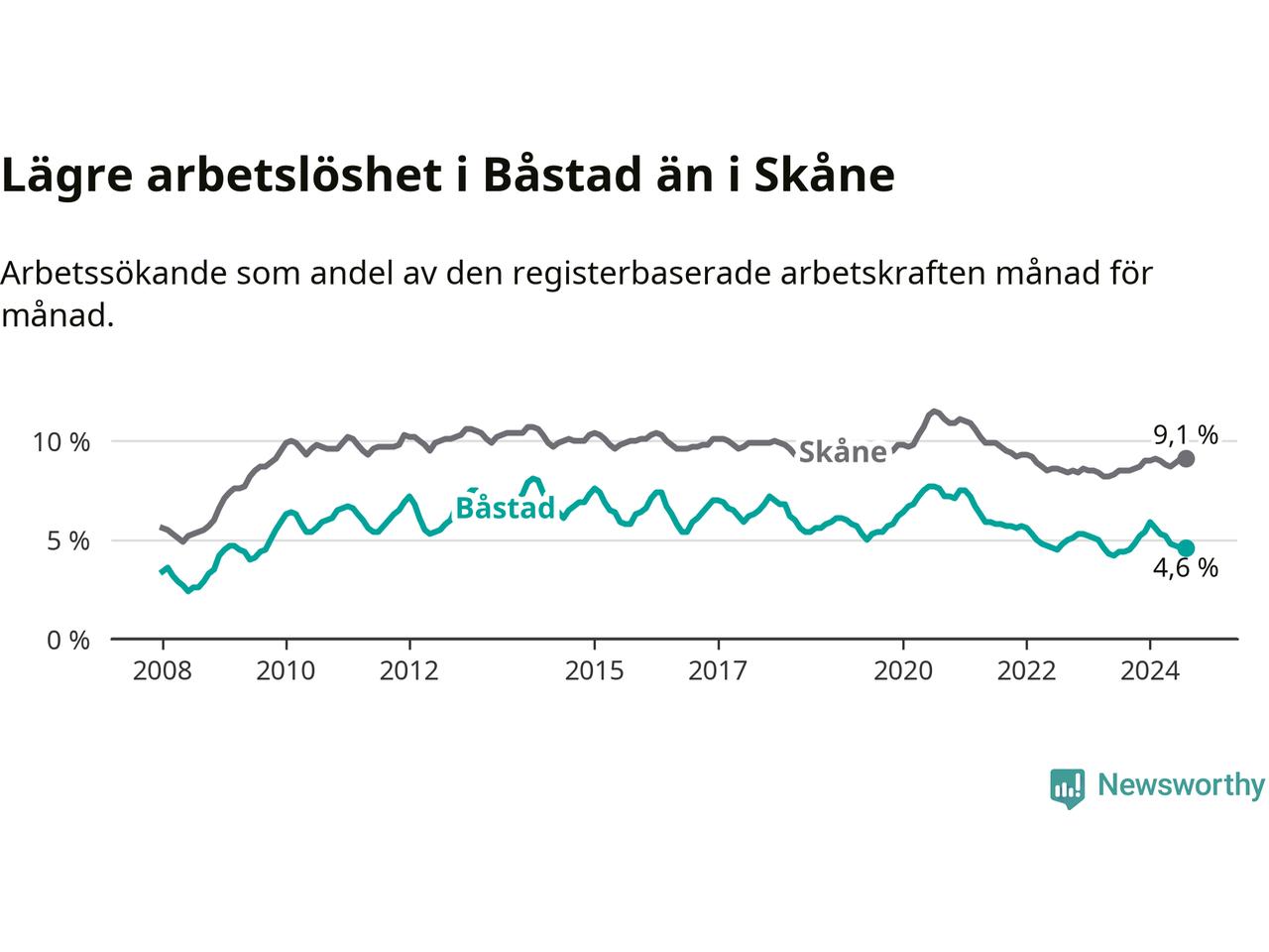 Under augusti månad rapporterade Båstads kommun en total arbetslöshet på 4,6 procent. Det är en ökning jämfört med samma tidpunkt i fjol (+0,2 procentenheter). Även i Skåne län stiger arbetslösheten .