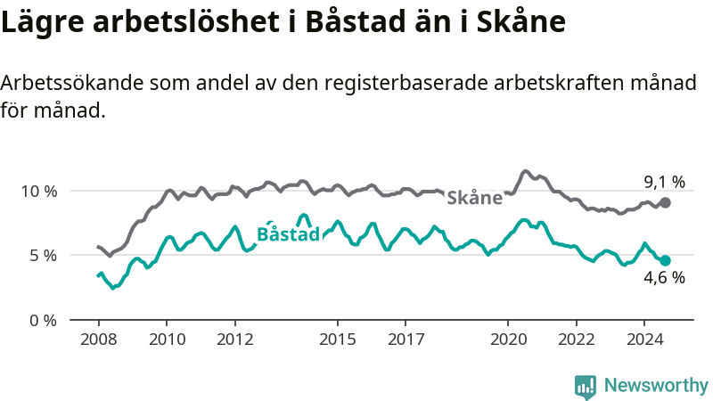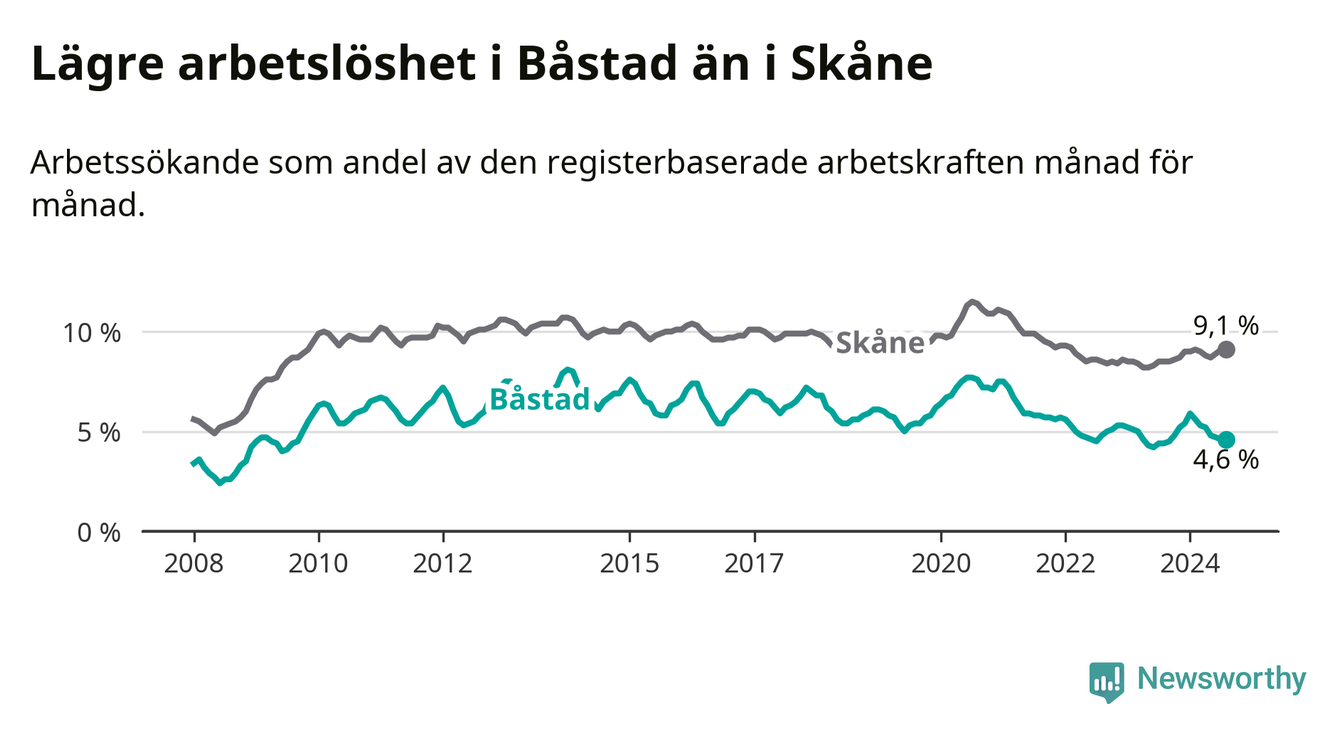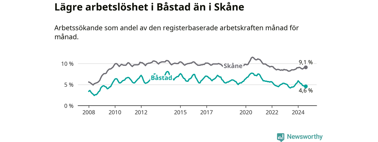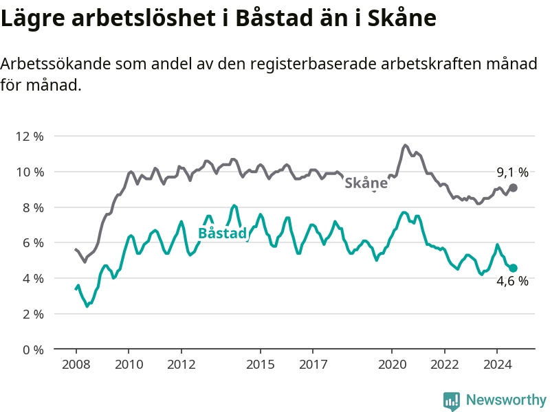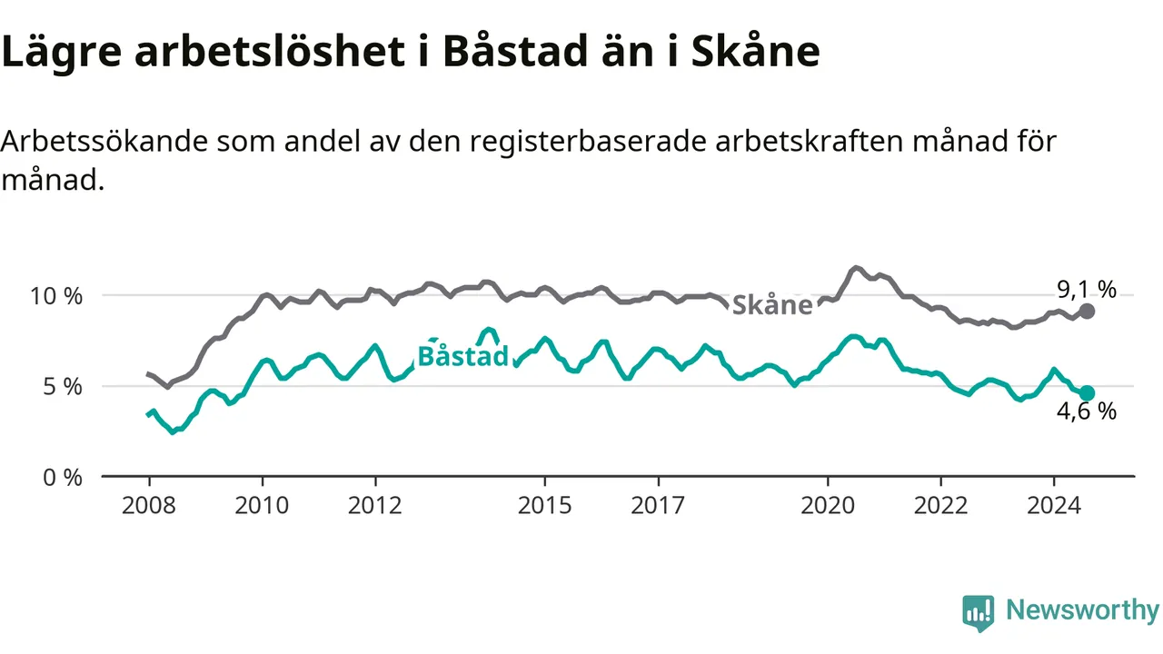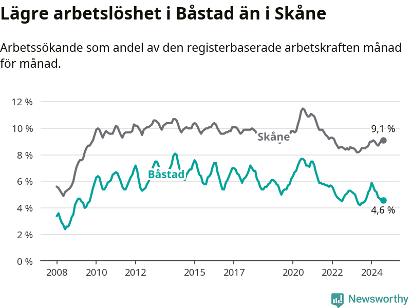 Under augusti månad rapporterade Båstads kommun en total arbetslöshet på 4,6 procent. Det är en ökning jämfört med samma tidpunkt i fjol (+0,2 procentenheter). Även i Skåne län stiger arbetslösheten .