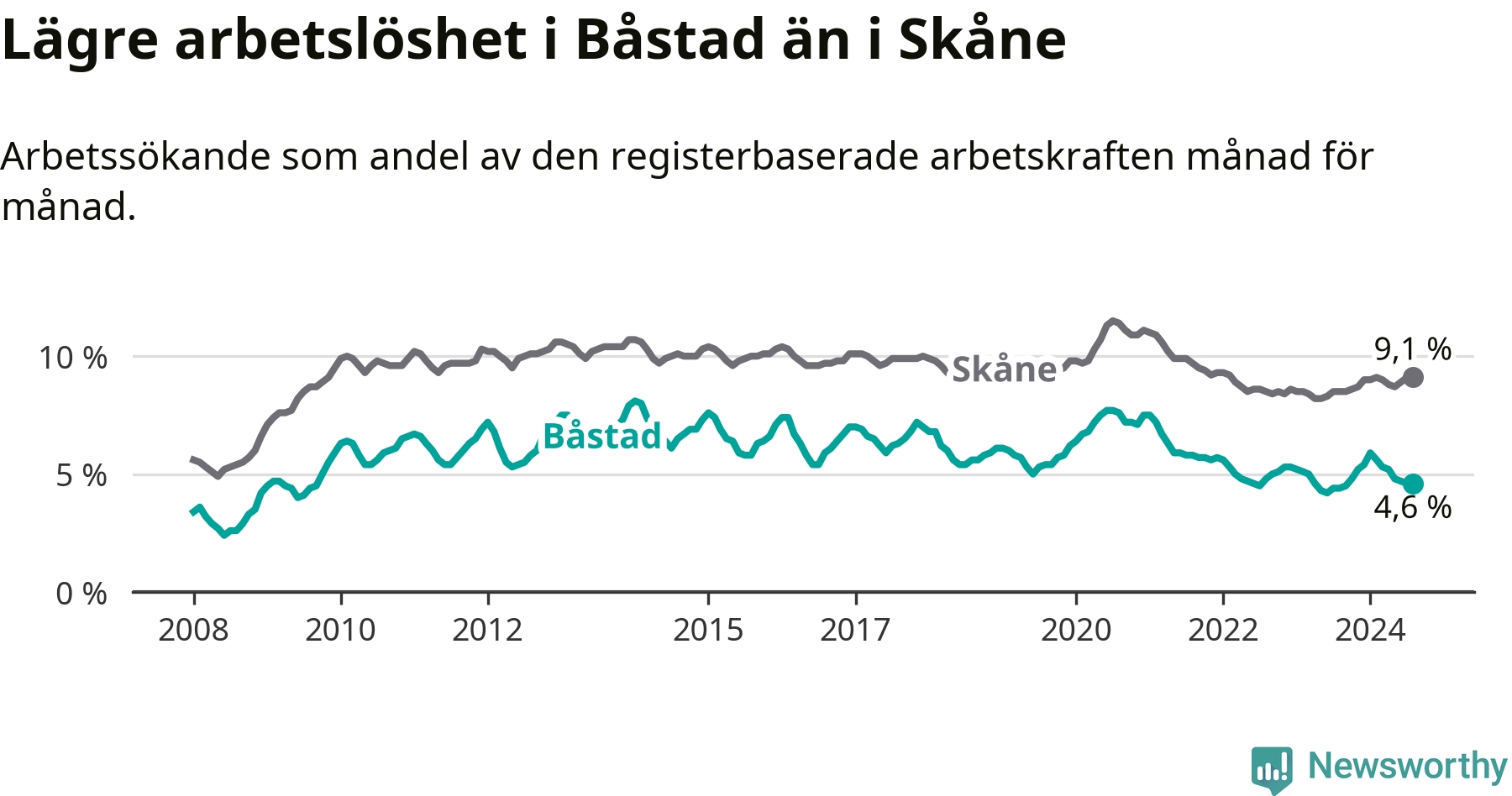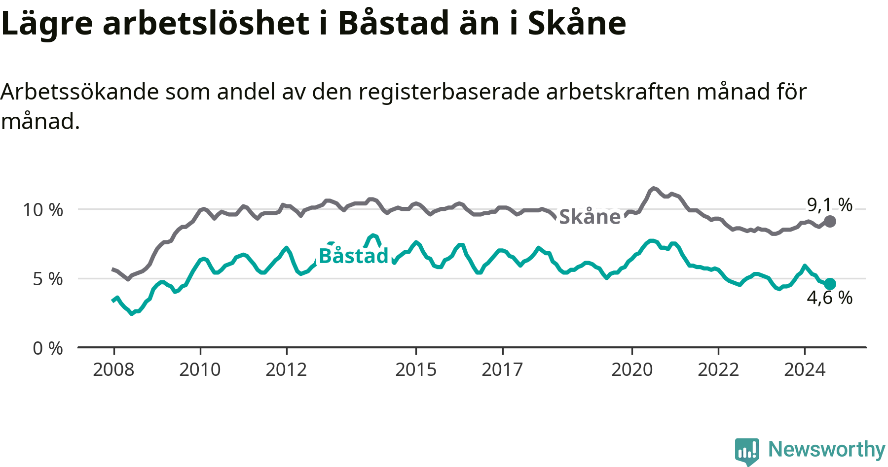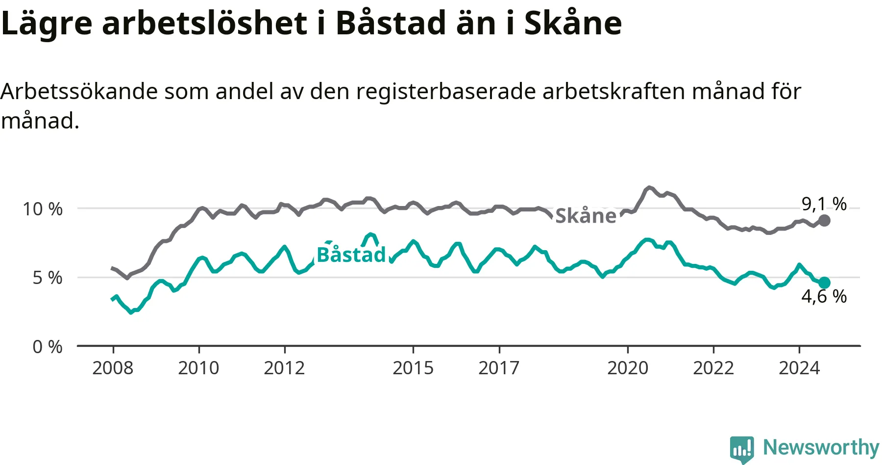 Även om arbetslösheten i Båstad alltså ökar, så ligger den fortfarande under snittet i hela Skåne län (4,6 procent i kommunen, jämfört med 9,1 procent i hela länet). Lomma har den lägsta arbetslösheten i länet (3,8 procent), medan Perstorp har den högsta (13,9 procent). För att Båstad skulle komma ner i samma arbetslöshetsnivå som Lomma skulle 54 personer behöva sysselsättas.