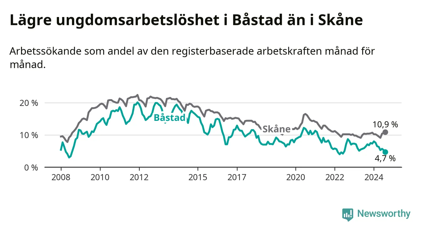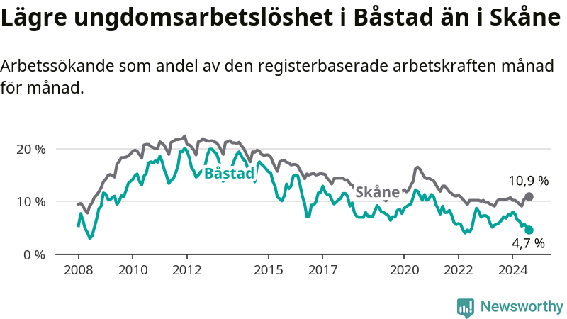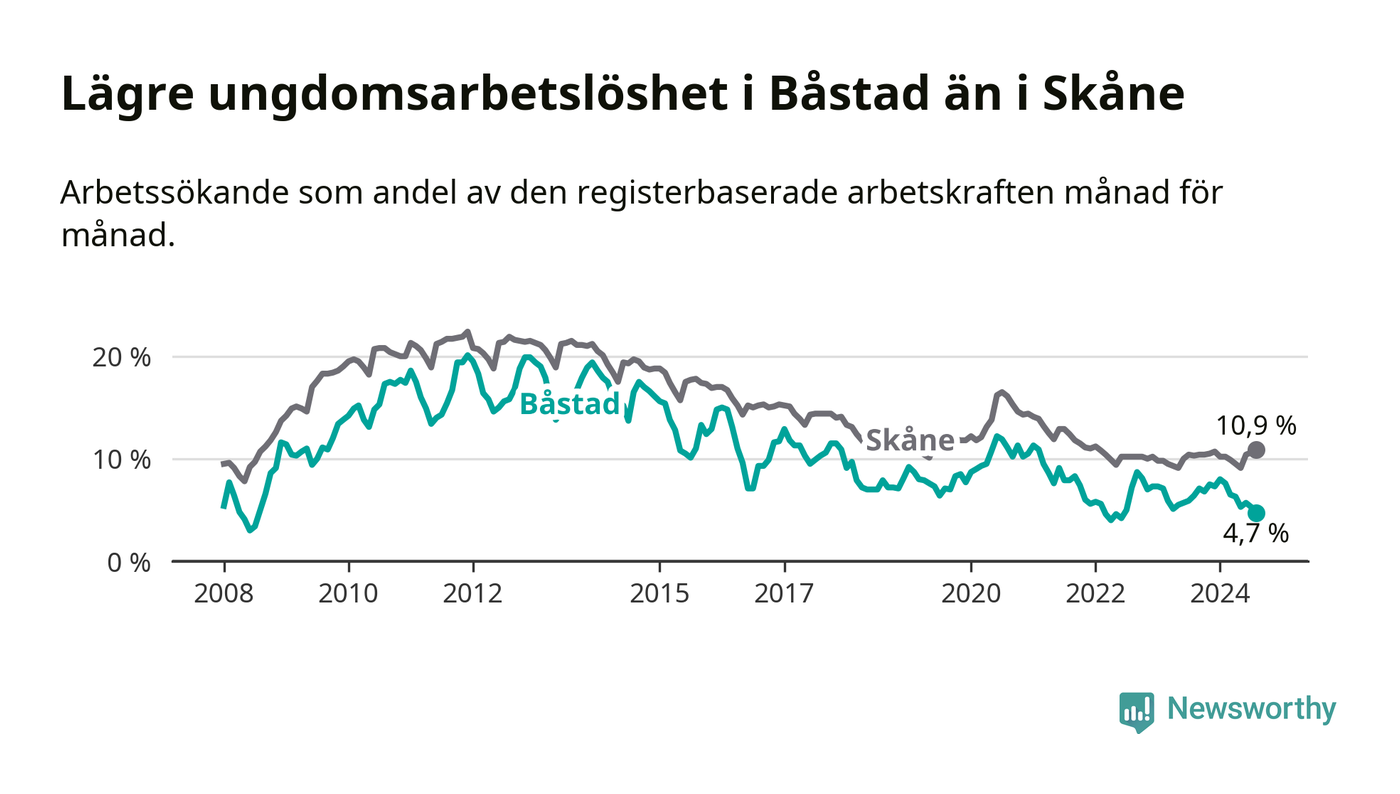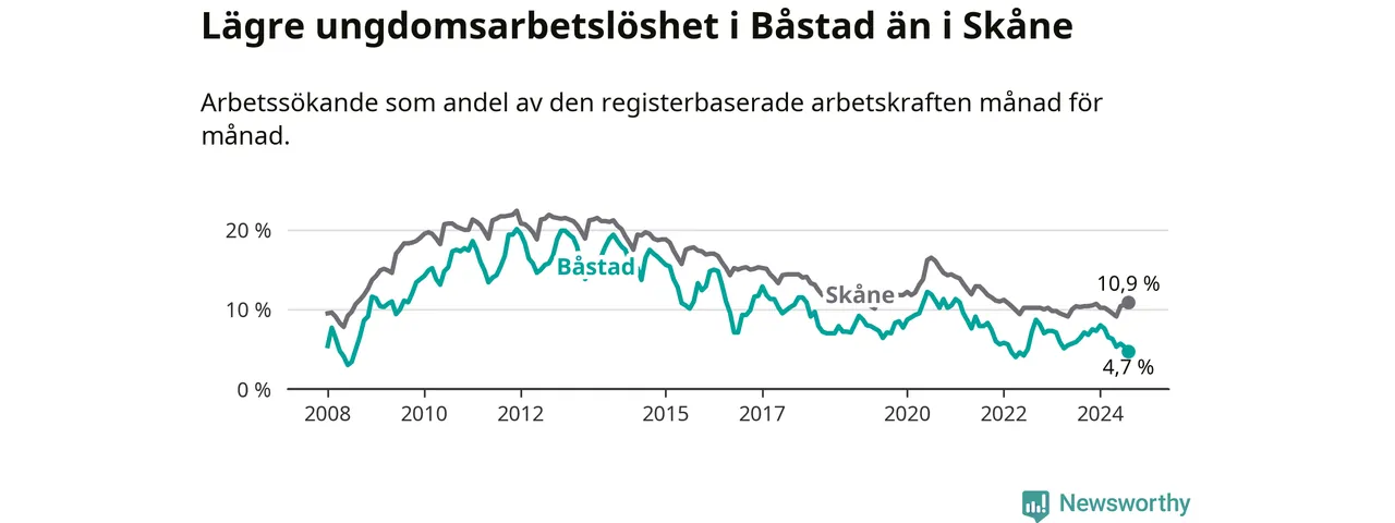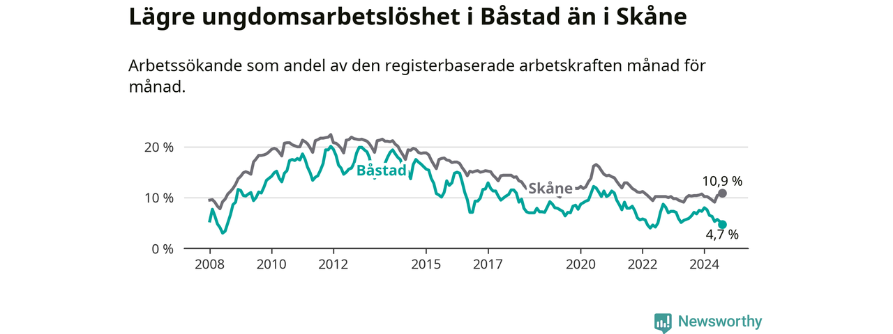Precis som den totala arbetslösheten ligger ungdomsarbetslösheten i Båstad lägre än i Skåne som helhet. Skillnaden mellan kommunen och länet är 6,2 procentenheter.