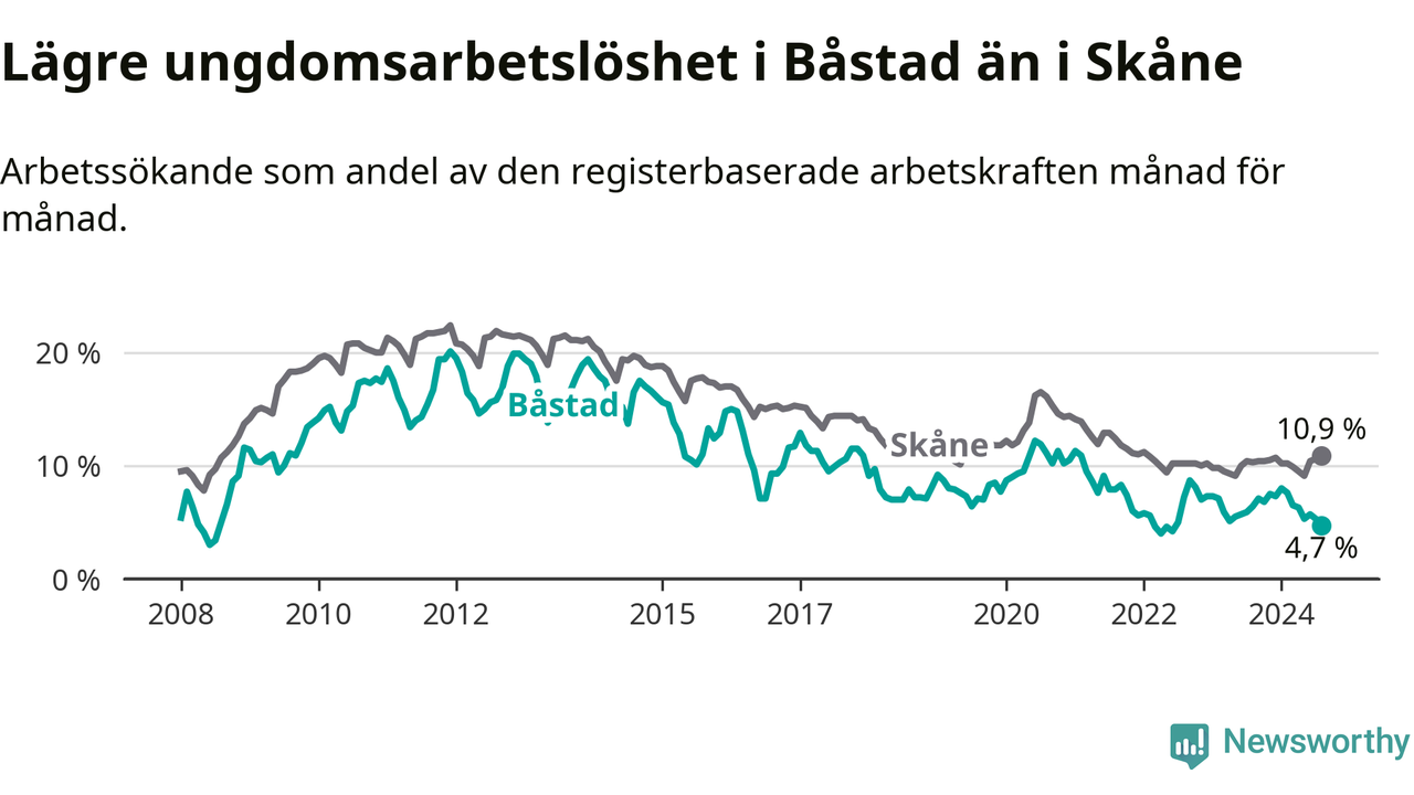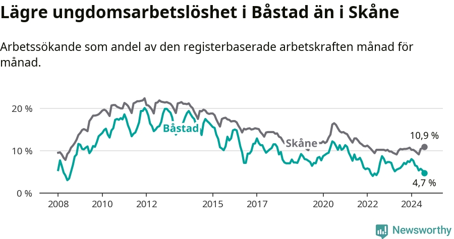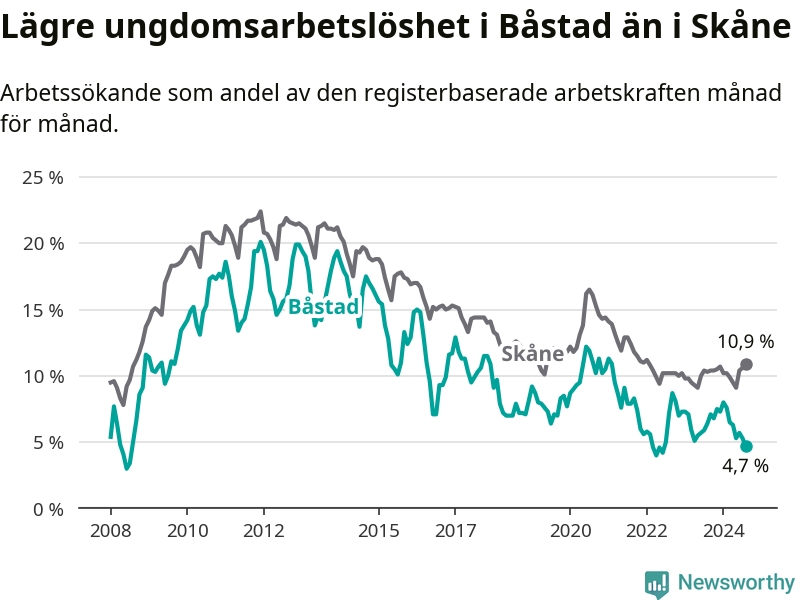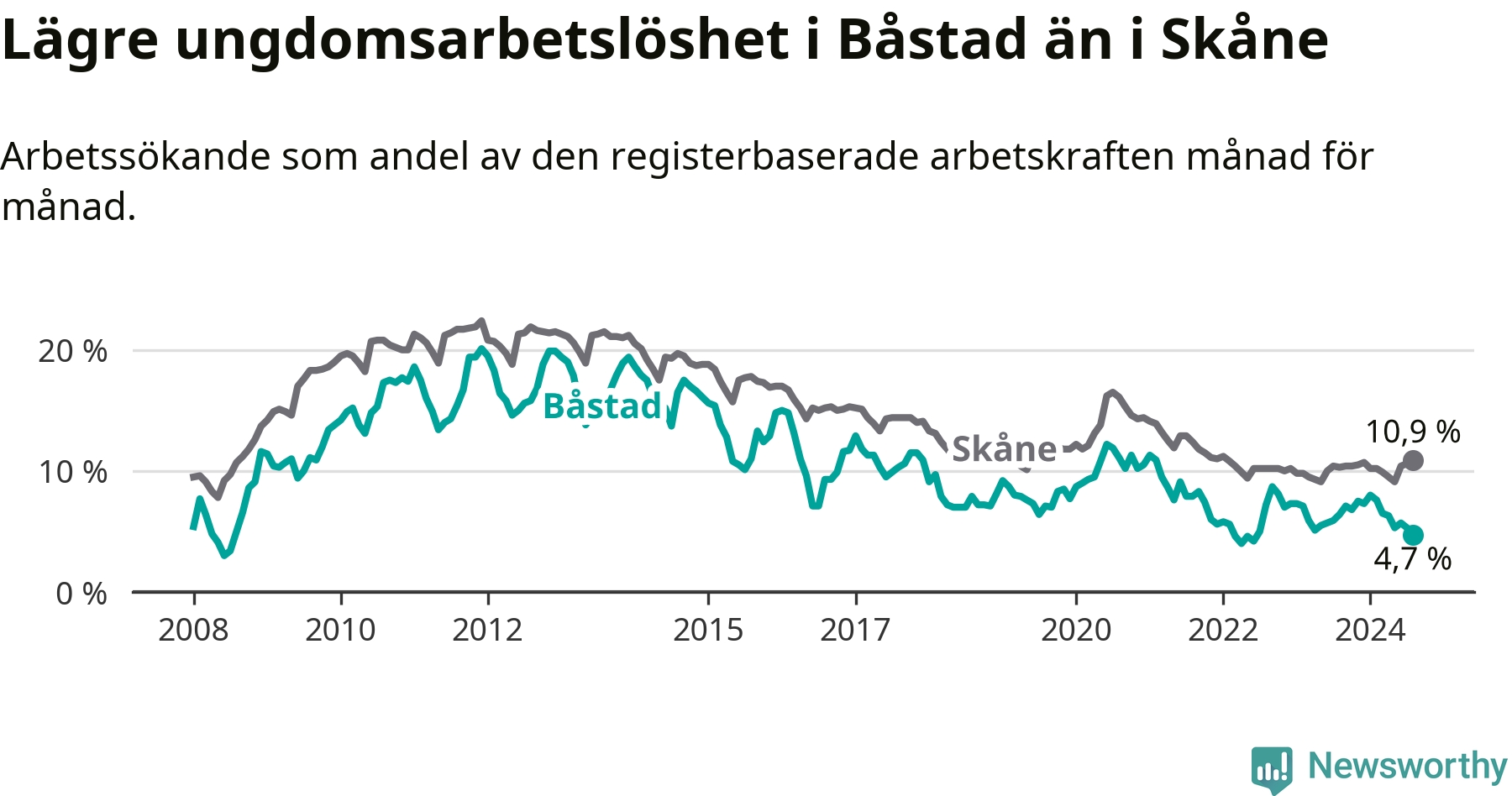 Precis som den totala arbetslösheten ligger ungdomsarbetslösheten i Båstad lägre än i Skåne som helhet. Skillnaden mellan kommunen och länet är 6,2 procentenheter.