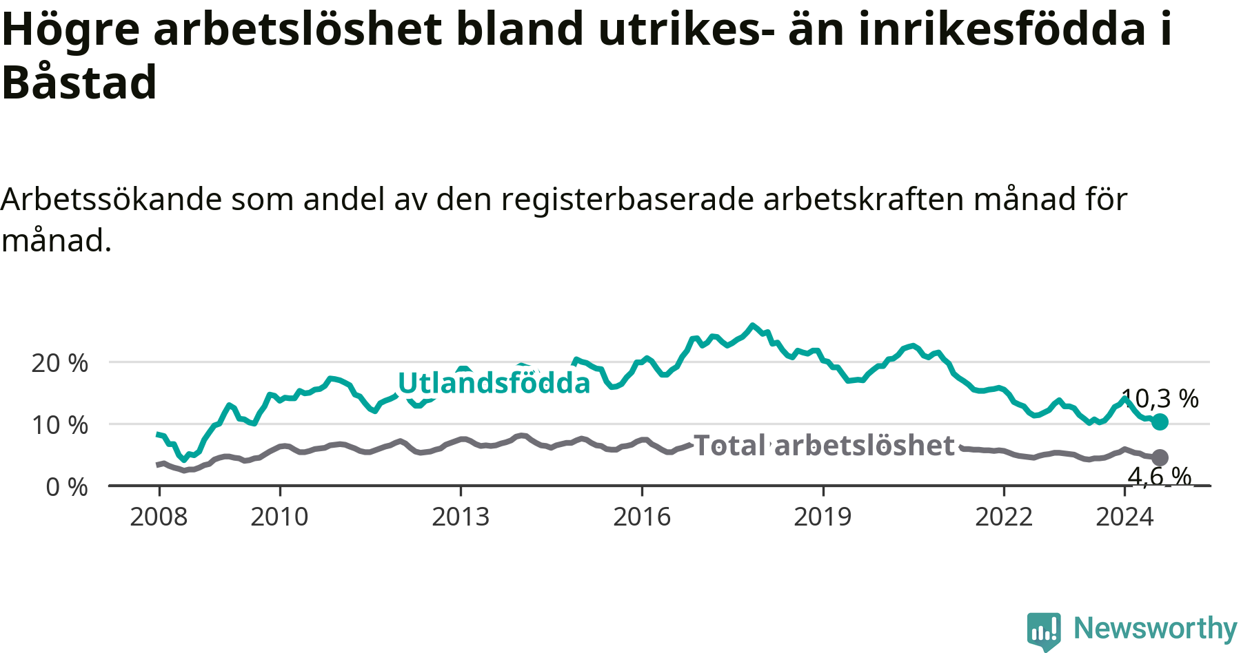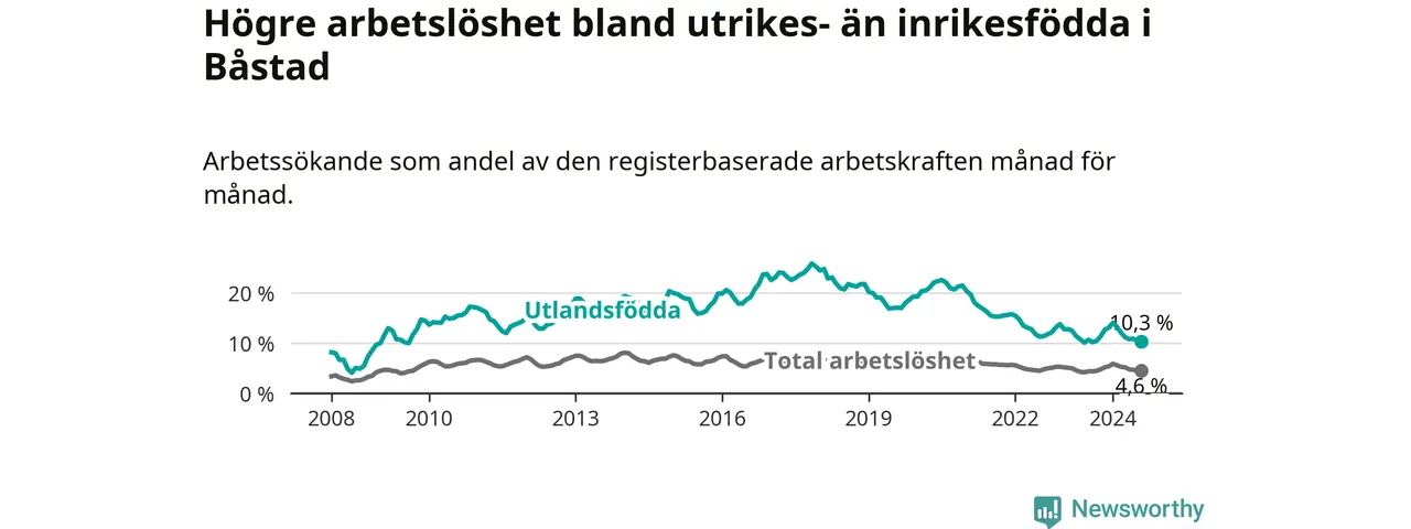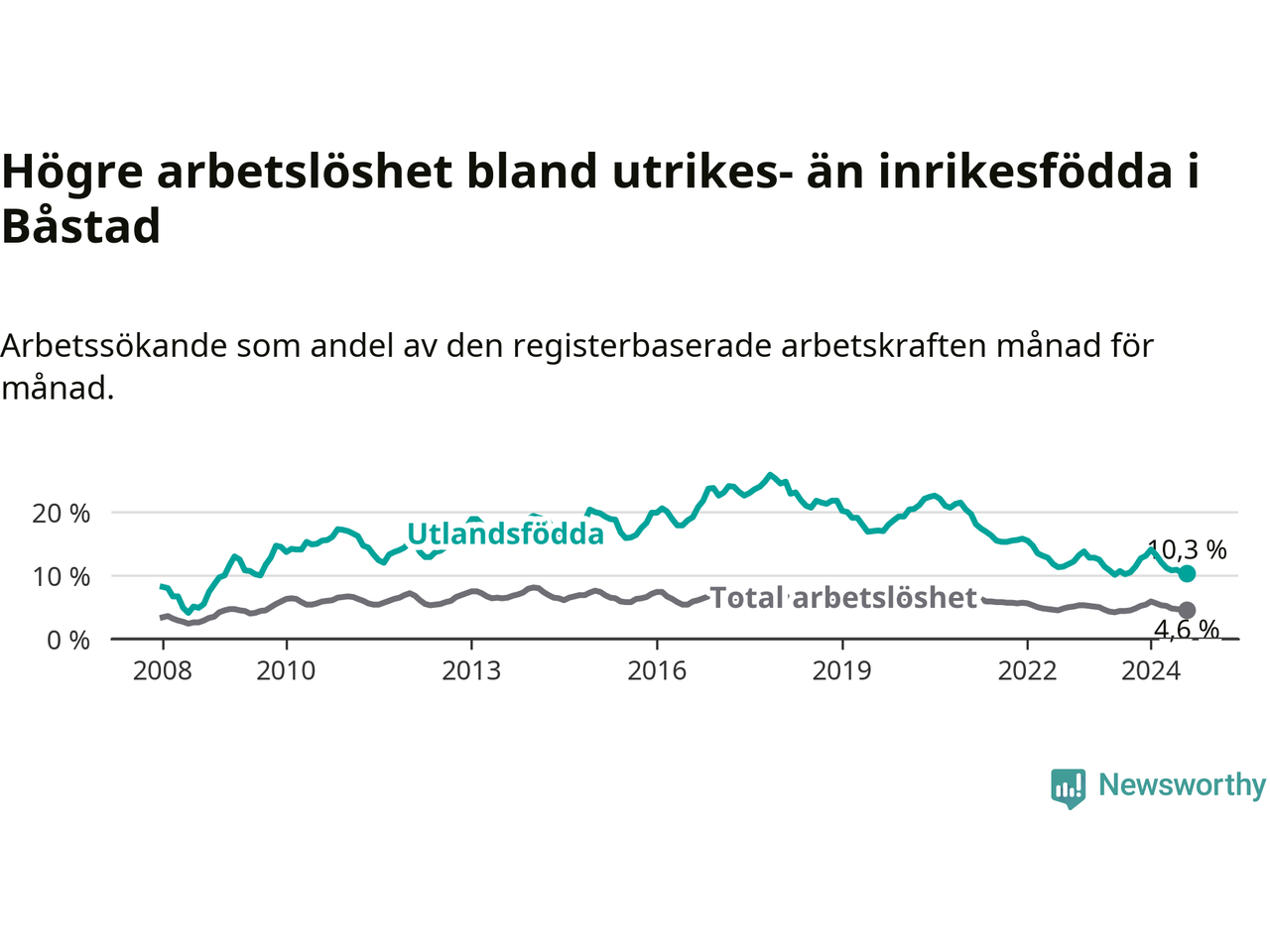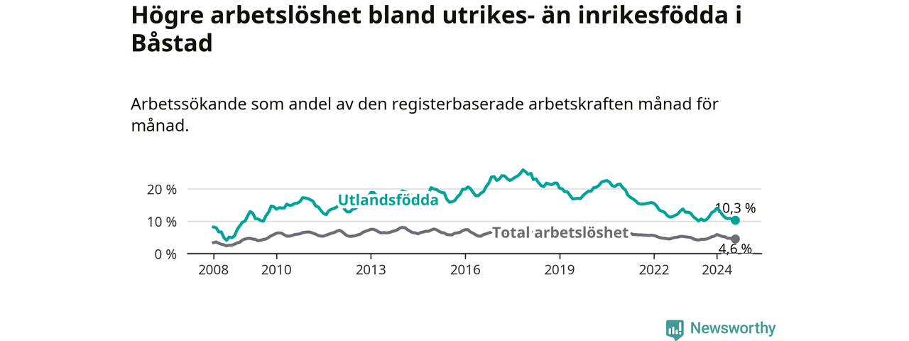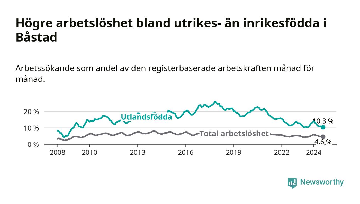 Arbetslösheten bland utlandsfödda var 10,3 procent i Båstad under augusti månad, motsvarande 121 av 1 175 personer. Det är 0,1 procentenheter fler än vid samma tidpunkt i fjol (+1 om man räknar personer). Den senaste månadens uppgång innebär ett trendbrott. Under de ett föregående månaderna hade arbetslösheten bland utlandsfödda varit lägre än motsvarande tidpunkt året innan.