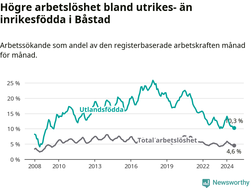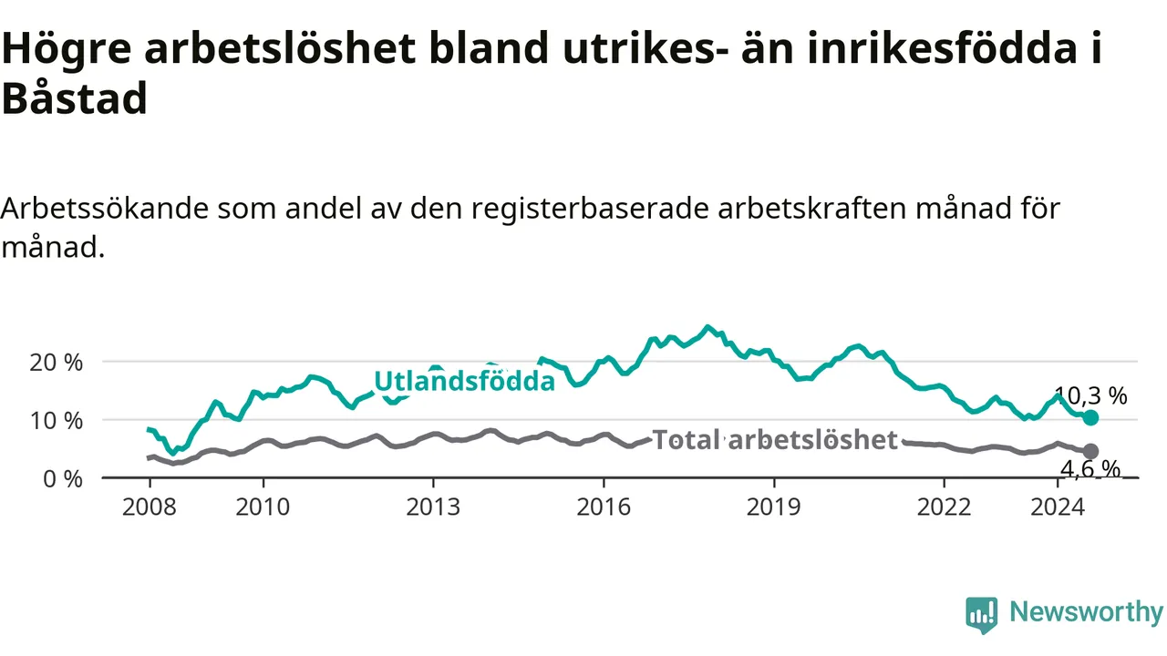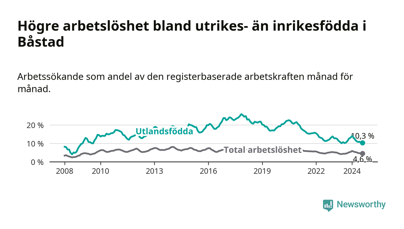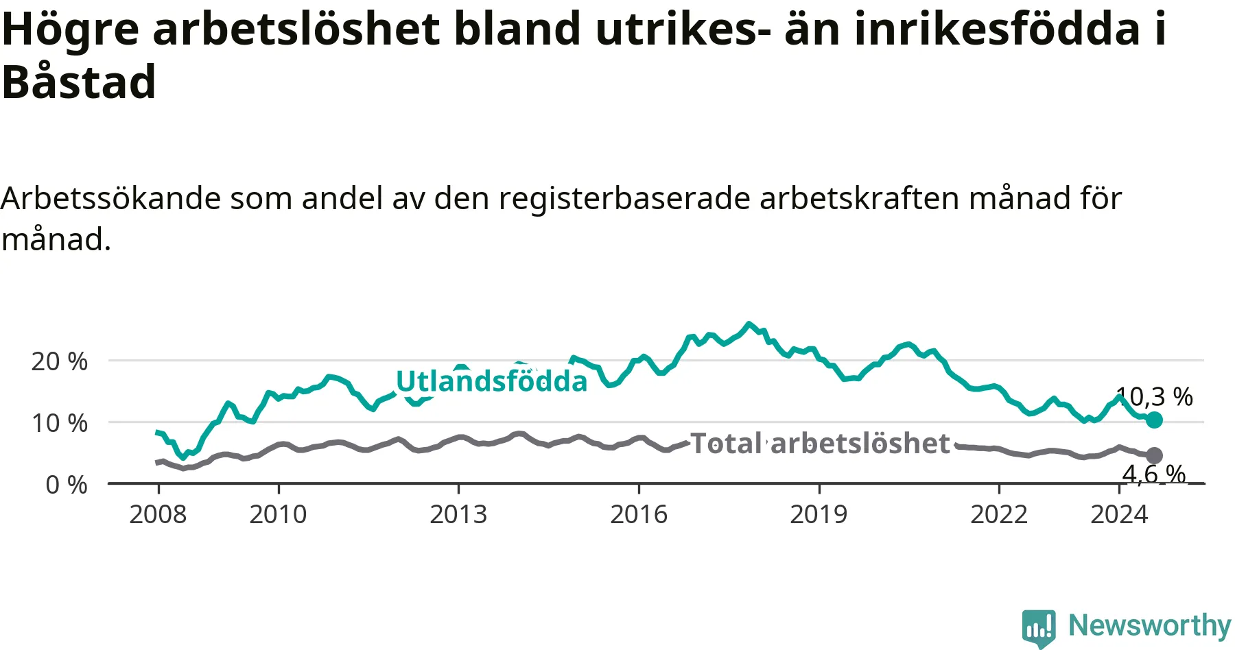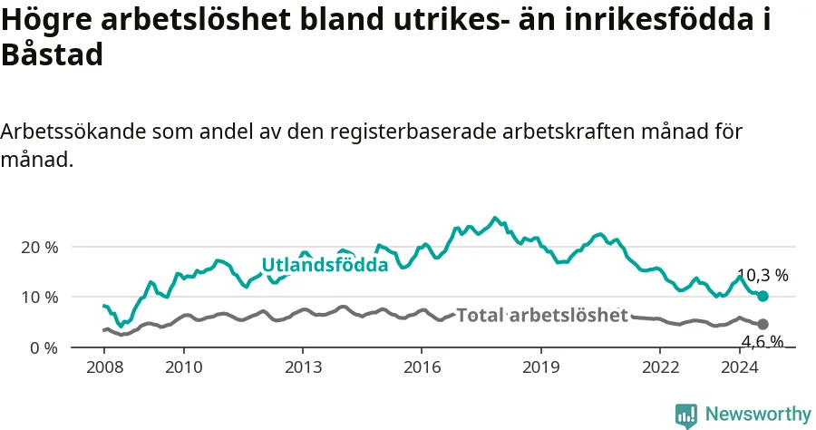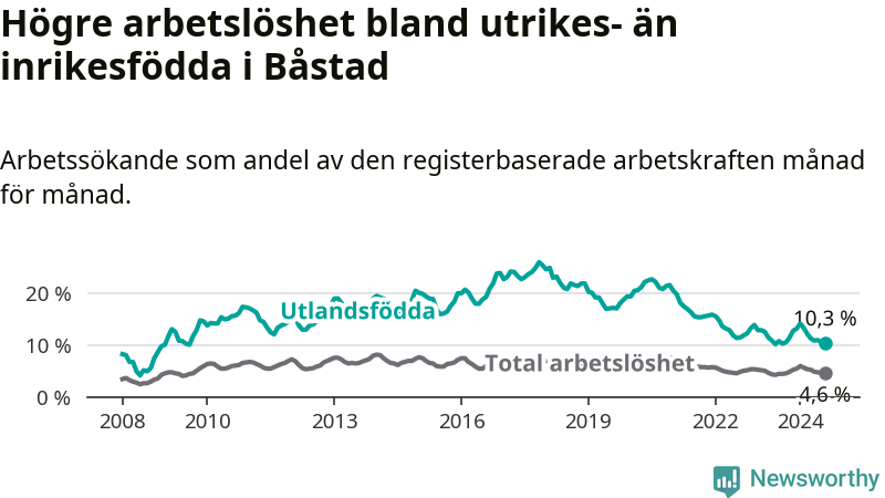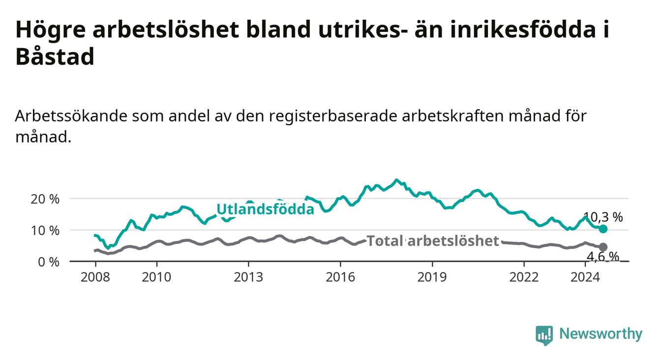 Arbetslösheten bland utlandsfödda var 10,3 procent i Båstad under augusti månad, motsvarande 121 av 1 175 personer. Det är 0,1 procentenheter fler än vid samma tidpunkt i fjol (+1 om man räknar personer). Den senaste månadens uppgång innebär ett trendbrott. Under de ett föregående månaderna hade arbetslösheten bland utlandsfödda varit lägre än motsvarande tidpunkt året innan.