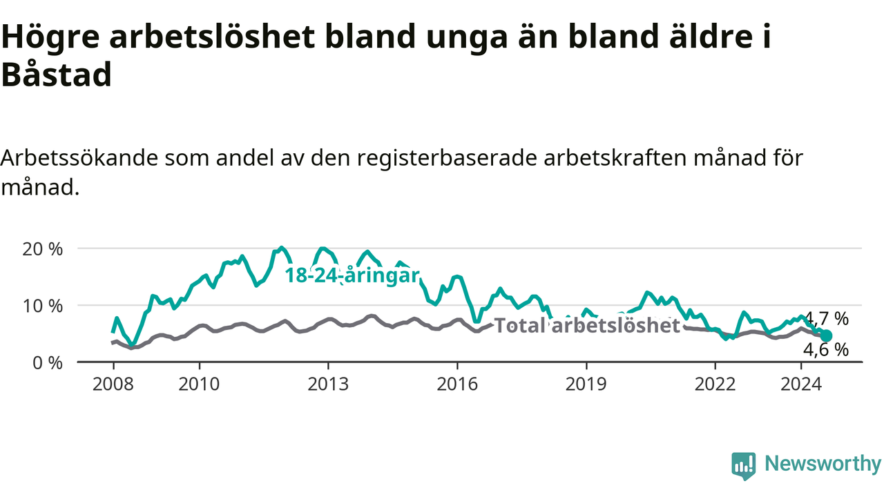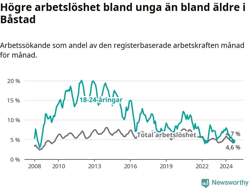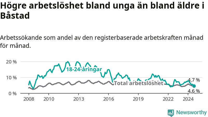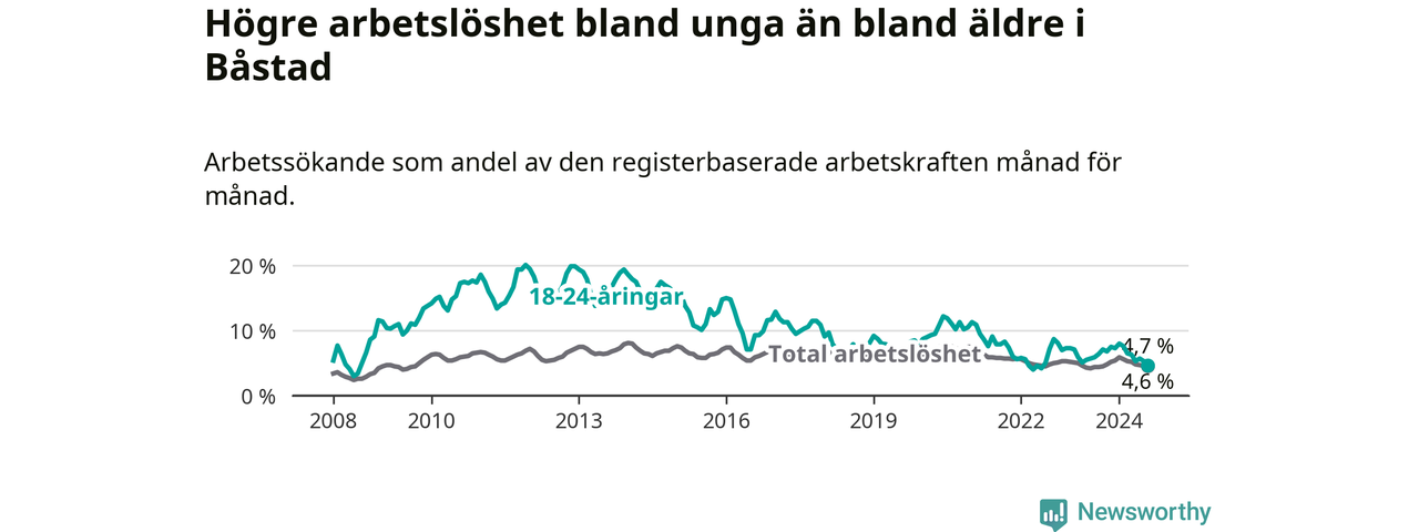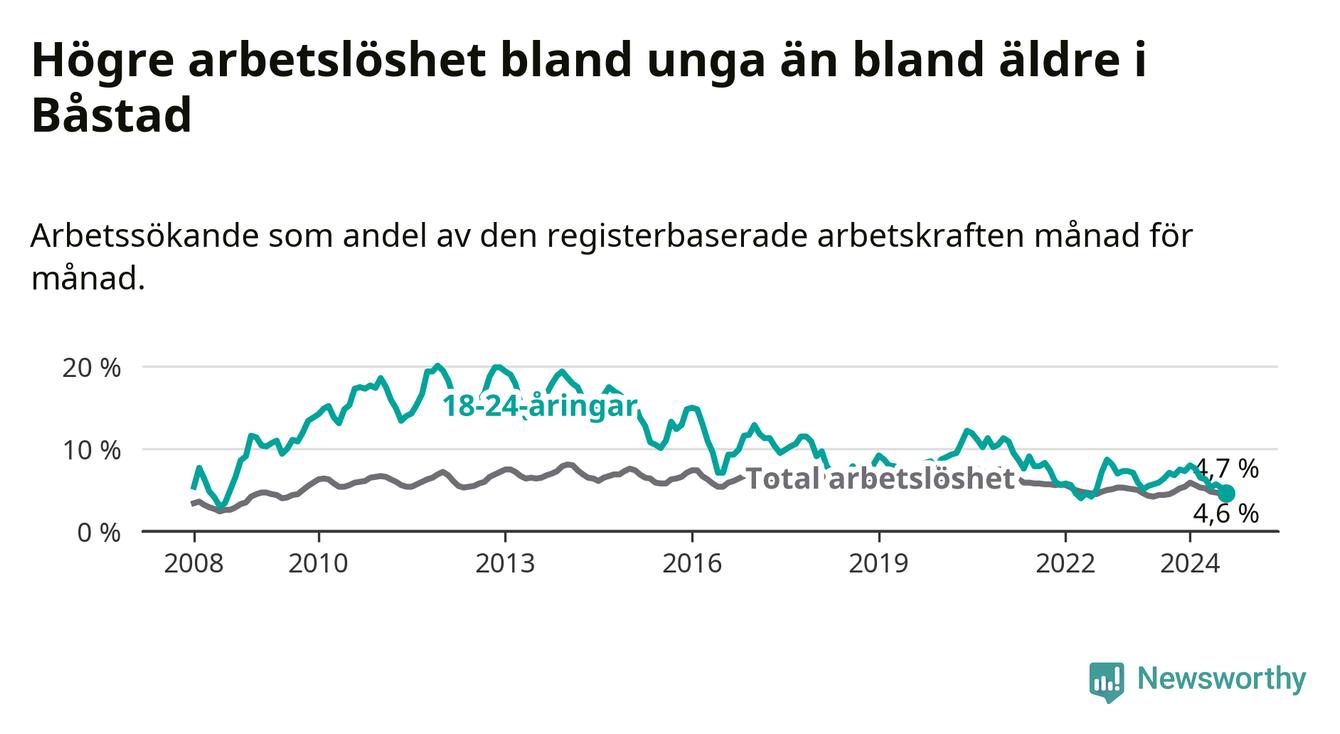 Till skillnad från den totala arbetslösheten sjunker arbetslösheten bland unga (−1,7 procentenheter). I augusti var 4,7 procent av 18–24-åringarna inskrivna som arbetssökande (motsvarande 26 personer). Mäter vi antalet inskrivna ser vi en minskning med sju personer på ett års sikt.