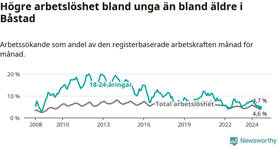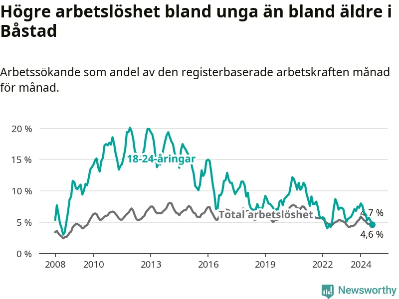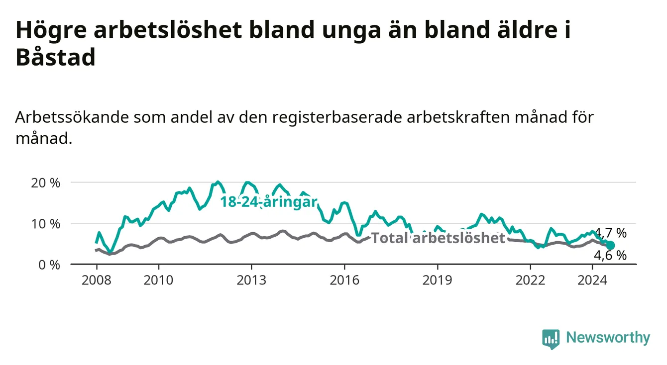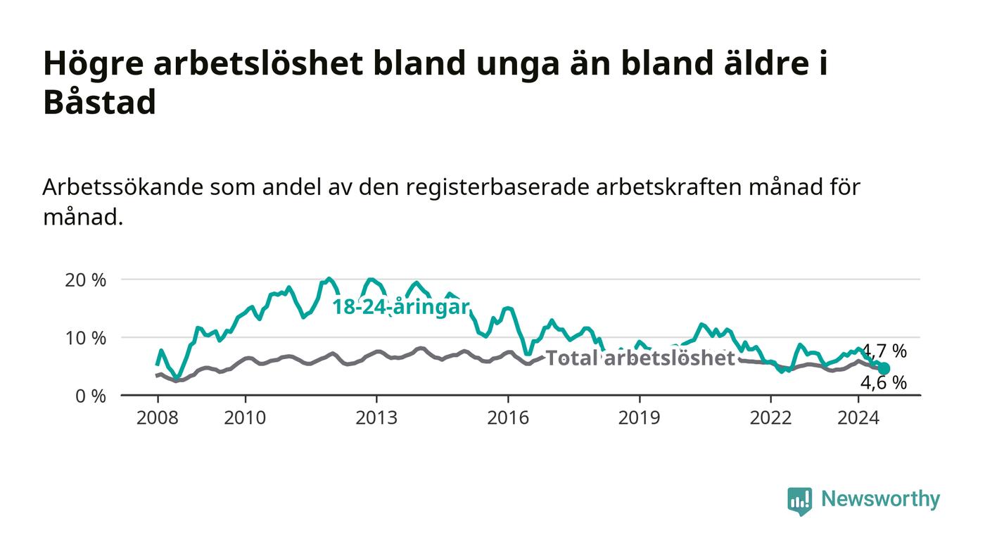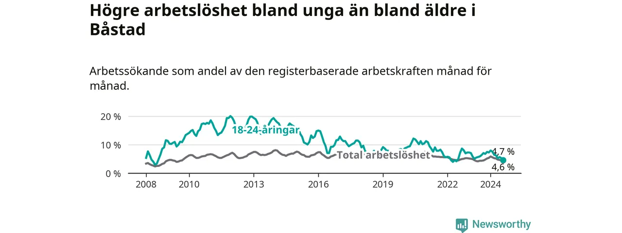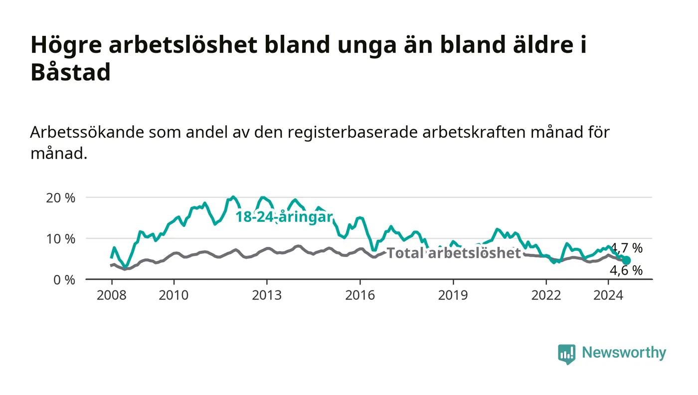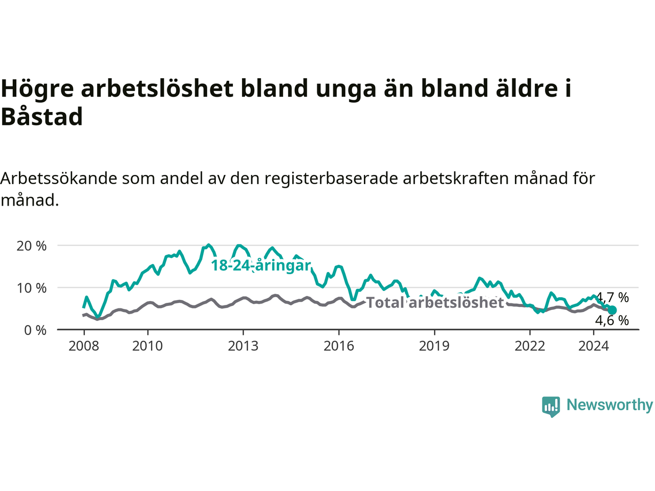 Den senaste månadsstatistiken från Arbetsförmedlingen visar på en nedgång i ungdomsarbetslöshet i Båstads kommun med 1,7 procentenheter. Arbetslösheten bland personer i åldern 18–24 år låg i augusti på 4,7 procent.