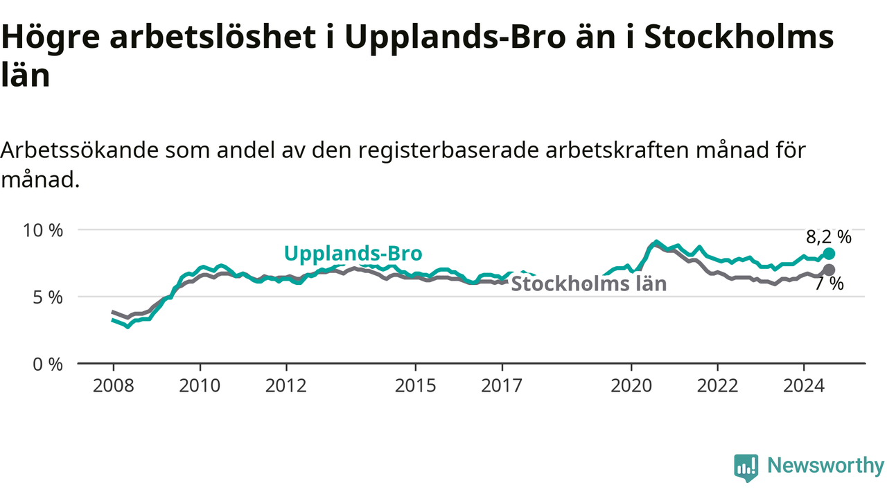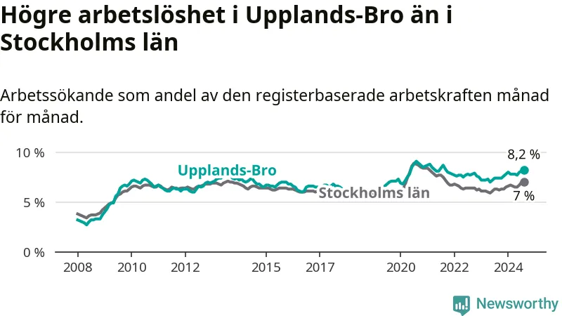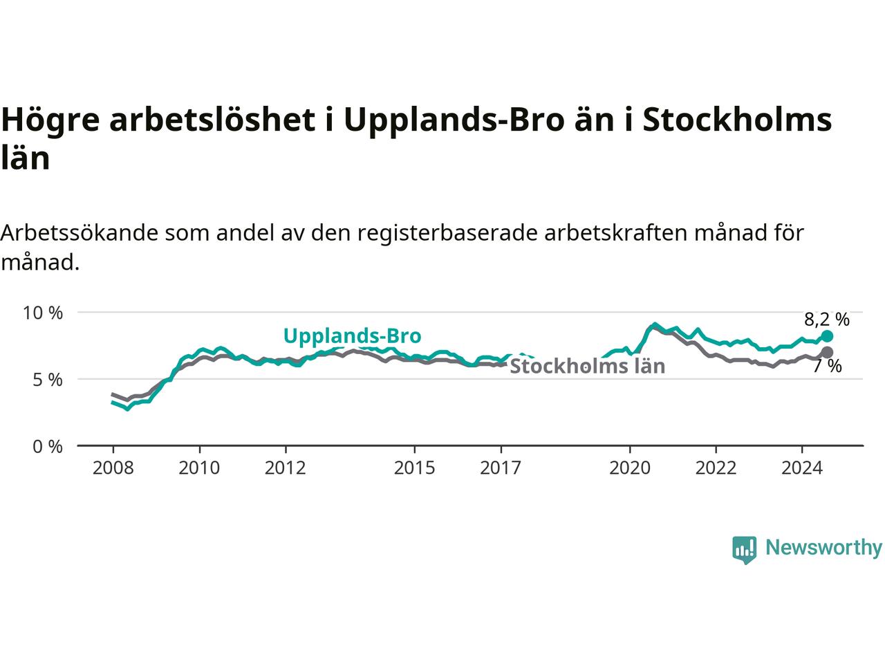 Under augusti månad rapporterade Upplands-Bro kommun en total arbetslöshet på 8,2 procent. Det är en ökning jämfört med samma tidpunkt i fjol (+0,8 procentenheter). Även i Stockholms län stiger arbetslösheten .