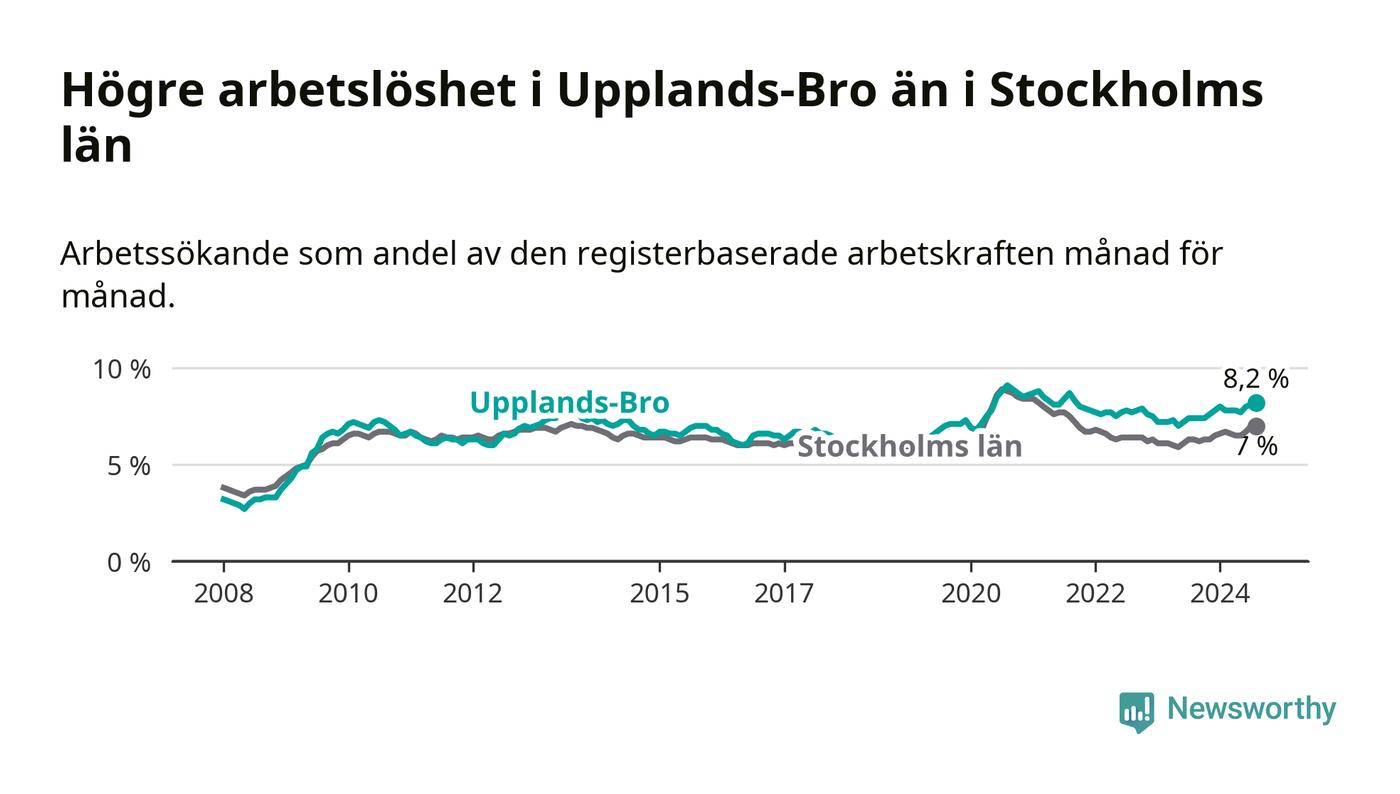 Upplands-Bro hade redan tidigare högre arbetslöshet än snittet i hela Stockholms län och nu växer klyftan (8,2 procent i kommunen, jämfört med 7,0 procent i hela länet). Ekerö har den lägsta arbetslösheten i länet (3,4 procent), medan Södertälje har den högsta (11,1 procent). För att Upplands-Bro skulle komma ner i samma arbetslöshetsnivå som Ekerö skulle 798 personer behöva sysselsättas.