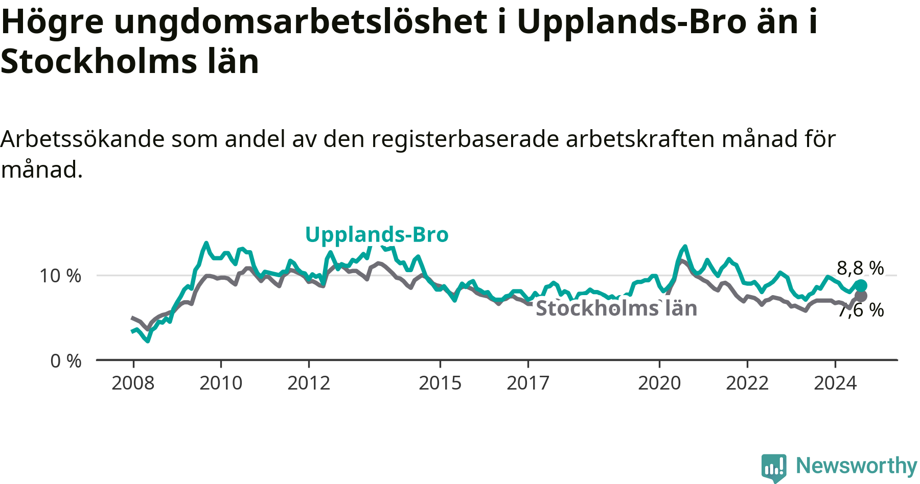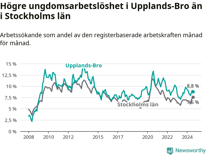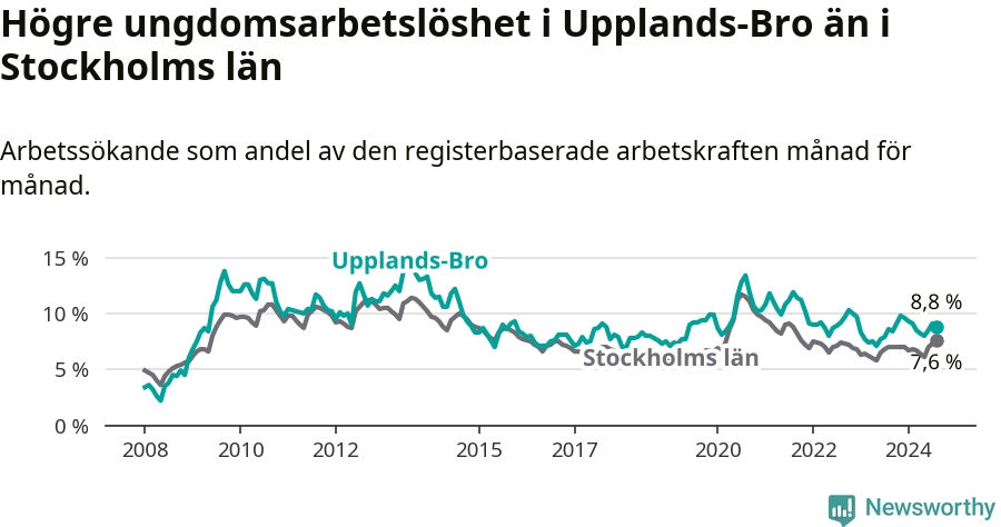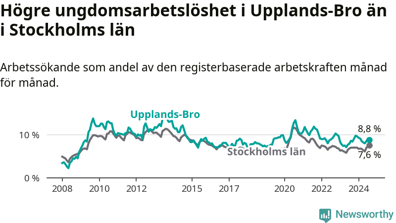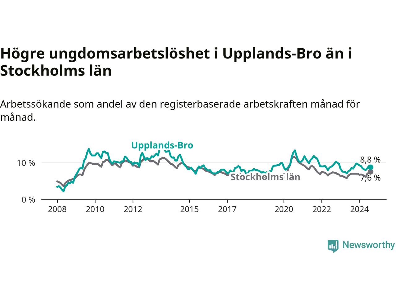 Precis som den totala arbetslösheten ligger ungdomsarbetslösheten i Upplands-Bro högre än i Stockholms län som helhet. Skillnaden mellan kommunen och länet är 1,2 procentenheter.