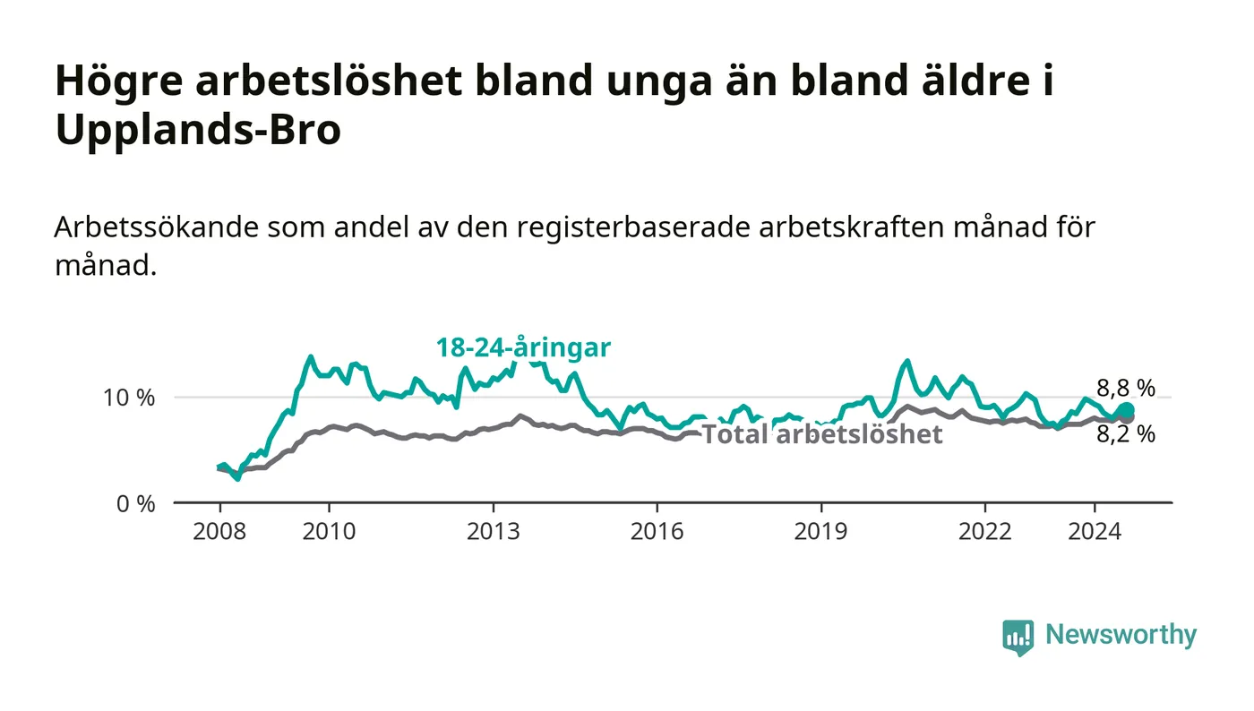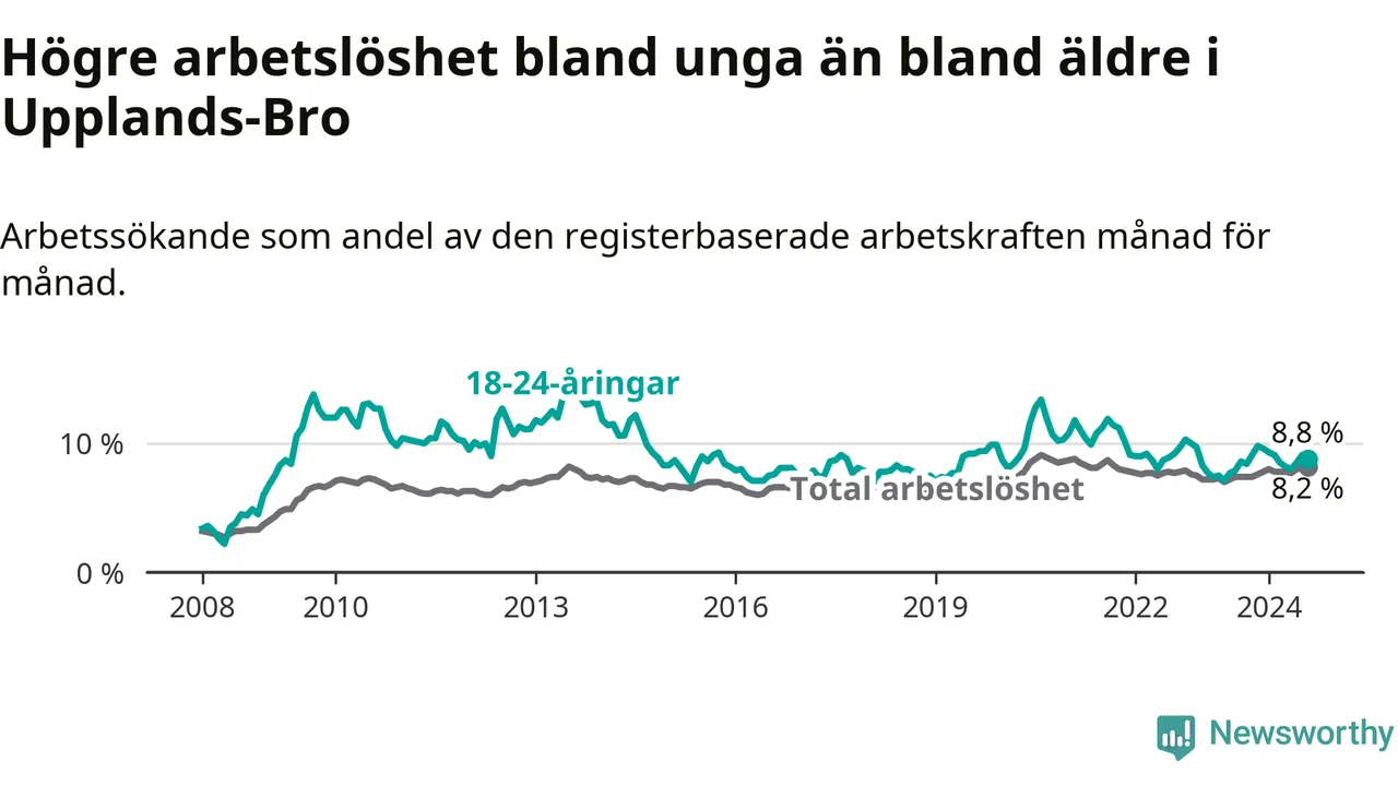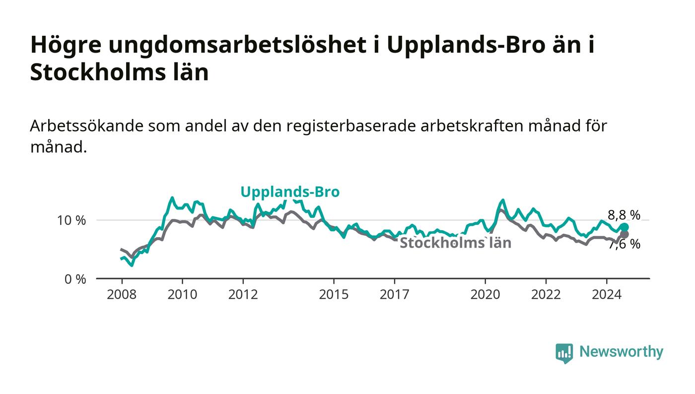 I och med den senaste månadens uppgång har de ungas arbetslöshet i Upplands-Bro stigit åtta månader i följd (upp från 9,6 procent i december 2023 till 8,8 procent nu).