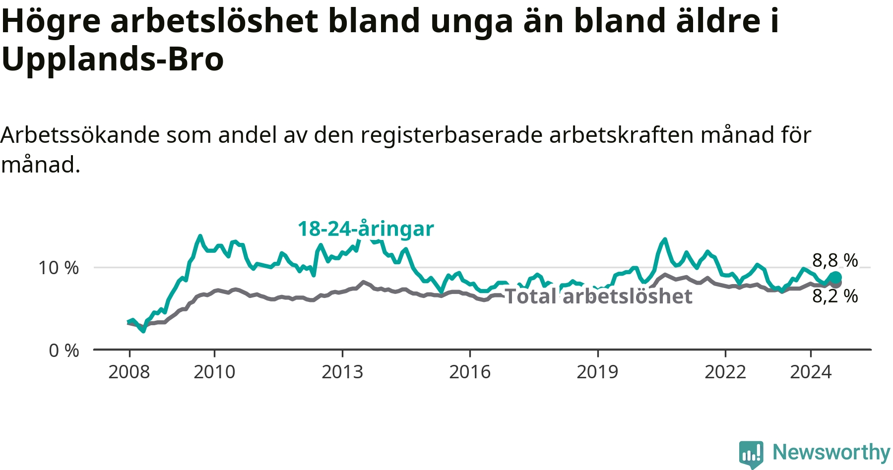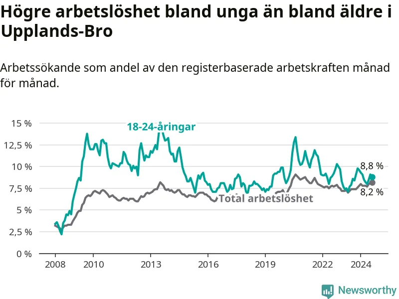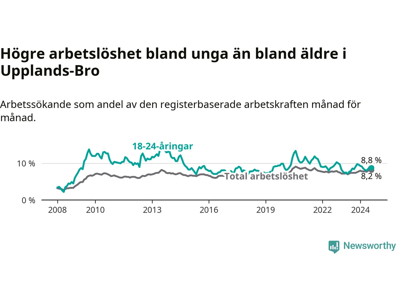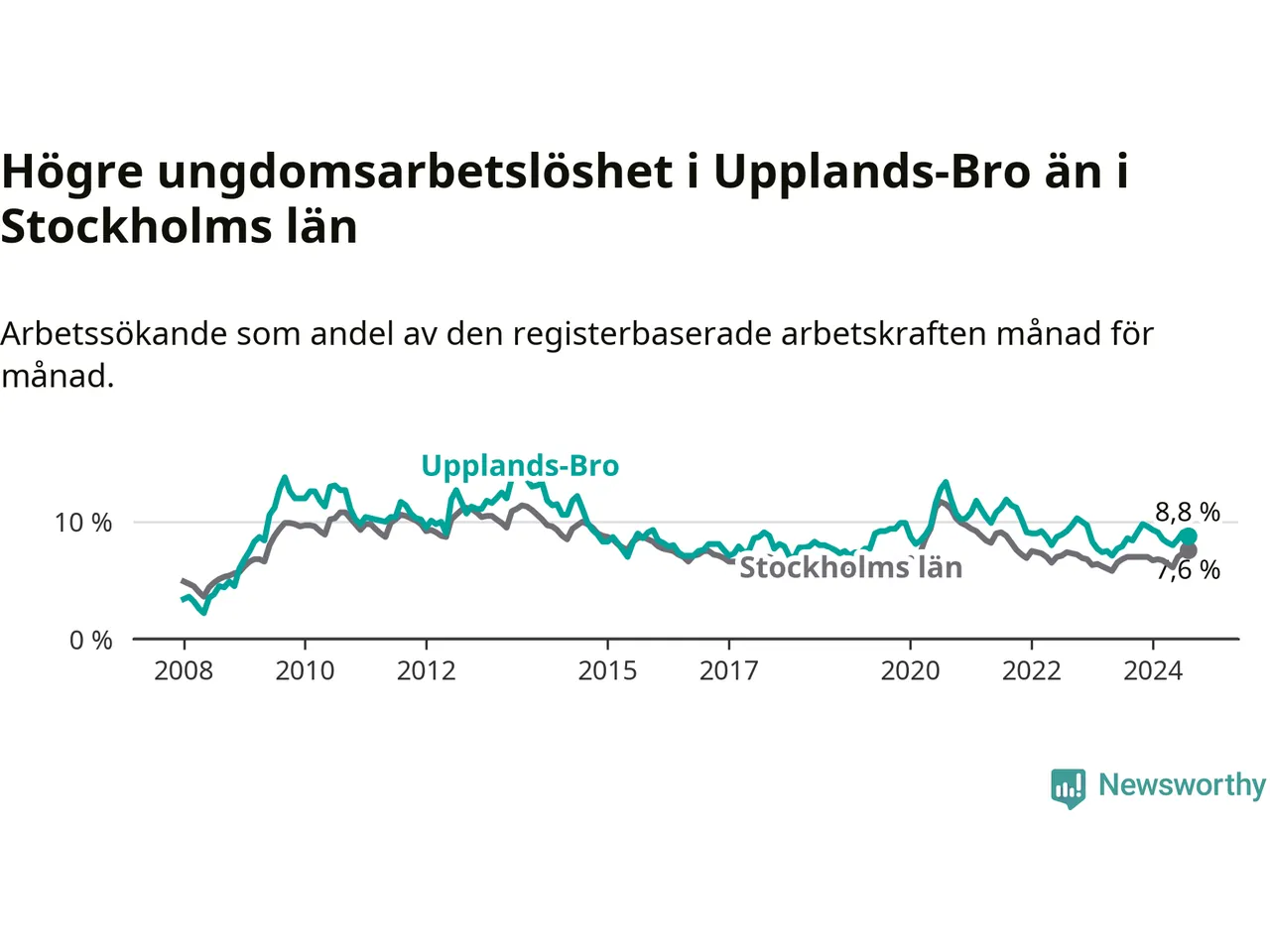 I och med den senaste månadens uppgång har de ungas arbetslöshet i Upplands-Bro stigit åtta månader i följd (upp från 9,6 procent i december 2023 till 8,8 procent nu).