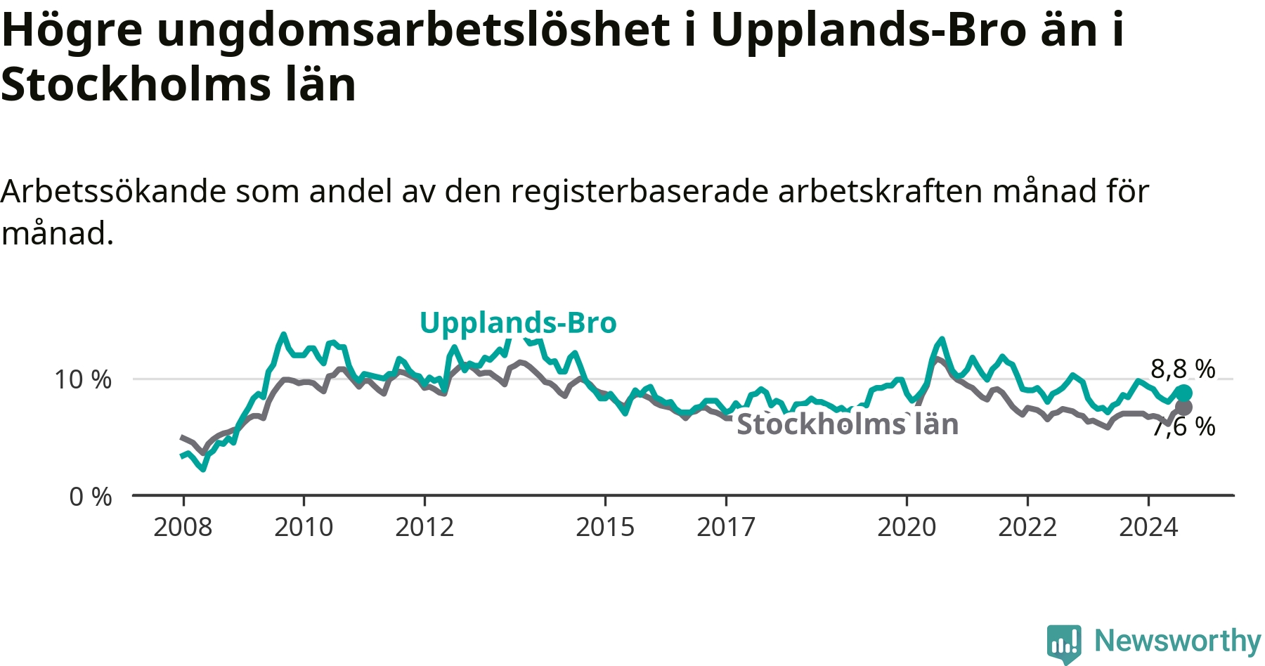 Graf: Arbetslöshet bland unga i Upplands-Bro kommun och Stockholms län